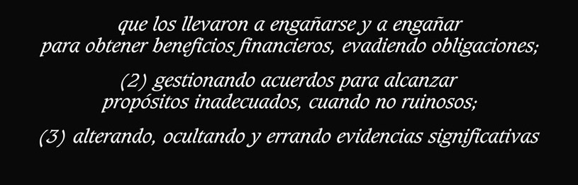 Fraudes, colusiones y obstrucciones Fraudes (1), colusiones (2) y obstrucciones (3) están presentes en el PISA MR, por (1) irracionalidades en el cumplimiento de la utilización racional de los recursos naturales apuntadas en el art 5º de la ley 26168, e irracionalidades en el cumplimiento del art 12º referido a presupuestos mínimos ley 25675 (ver par2º, art 6º); sumadas a omisión y tergiversación de hechos y circunstancias (proceso ambiental de los emisarios), que los llevaron a engañarse y a engañar para obtener beneficios financieros, evadiendo obligaciones, (2) gestionando acuerdos para alcanzar propósitos inadecuados, cuando no ruinosos, (3) alterando, ocultando y errando evidencias significativas y demorando 15 años reglamentaciones no menos significativas, tal el caso de la ley 25688 sobre presupuestos mínimos en el Régimen ambiental de aguas, cuyos planteos acercarían abundante materia crítica para poner sobre la mesa todos estos desaciertos,