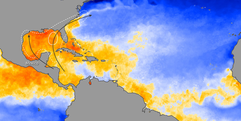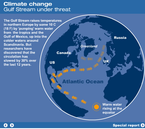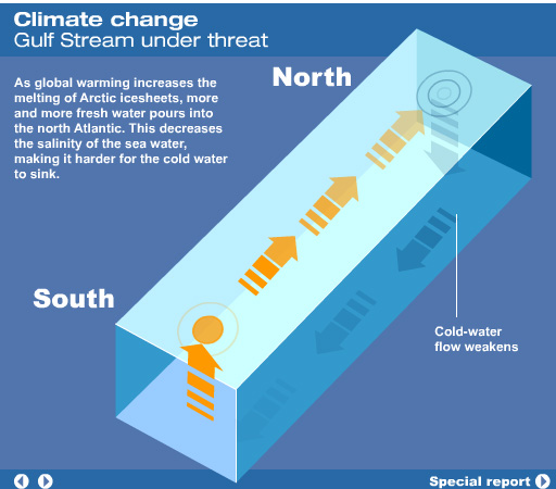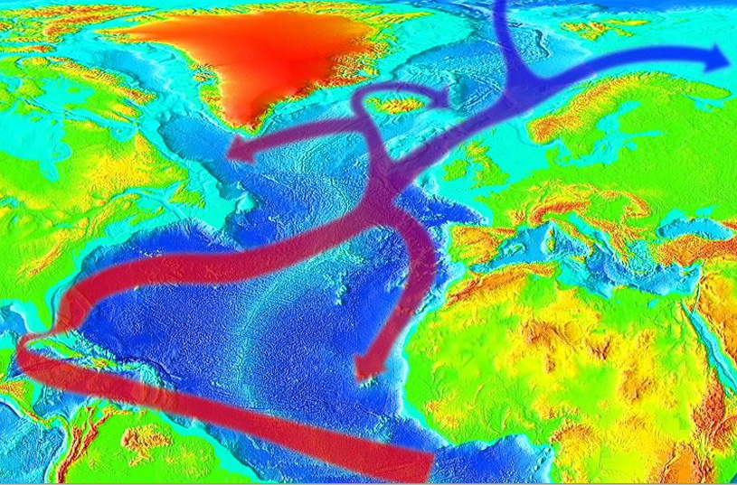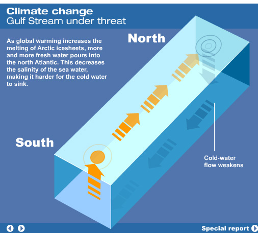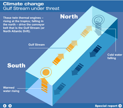 La corriente del Golfo es una corriente oceánica que desplaza una gran masa de agua cálida procedente del golfo de México y que se dirige al Atlántico Norte. Alcanza una profundidad de unos 800 a 1200 m y una anchura de más de 100 a 200 km con variaciones de 30-40 km,] Damos una idea aproximada de la enorme cantidad de energía que transporta: maxima 1,5 x 108 m3/s (150 Sv) en los 55° Oeste; 100 veces todas las aguas de los ríos que desembocan en el mar; equivalente a 5 Petawatt(5 x 1015W),, algo así como 4 millones de grandes y modernas centrales térmicas. Se desplaza a 2 nudos/s (3,7 m/s) aproximadamente y su caudal es enorme: unos 80 millones de m³/s. La corriente del Golfo varía sus transportes tanto en el espacio como en el tiempo. De acuerdo a altimetrías del Geosat, la corriente transporta un máximo de agua en el otoño y un mínimo en la primavera, correspondiendo a la fase del desplazamiento N-S de su posición. En el otoño se desplaza al Norte; en la Primavera, al Sur. Auer 1987; (Kelly and Gille 1990; Zlotnicki 1991; Kelly 1991; Hogg and Johns 1995). Rossby and Rago (1985) and Fu et al. (1987) obtuvieron similares resultados cuando estudiaron las diferencias en los niveles del mar a lo largo de la corriente. La variante estacional reconoce picos de amplitud en la altura de la superficie del mar de 10-15 cm. La fluctuación está principalmente confinada a los 200-300 m superiores de la columna de agua y es resultado del calentamiento estacional y expansión de las aguas superficiales (Hogg and Johns 1995). Esta diferencia en altura es pequeña; y si consideramos su caída lineal de cero a 300 m sólo resultaría en fluctuaciones de transporte anual de aprox 1.5 Sv (Hogg and Johns 1995). Las variaciones en el transporte profundo aparecen ser casi opuestos a la fase de las aguas superficiales y su magnitud es más significativa (Hogg and Johns 1995). Worthington (1976) sugiere que el máximo transporte ocurre en primavera, y la amplitud del ciclo annual es de 5-8.5 Sv (Manning and Watts 1989; Sato and Rossby 1992; Hogg and Johns 1995). Worthington propuso un extensivo mecanismo convectivo al Sur de la corriente del Golfo debido al enfriamiento atmosférico de las aguas superficiales que lleva a la termoclina a profundizar y al transporte baroclínico a aumentar (Fu et al. 1987). Aunque esta idea luce controversial, las hipótesis alternativas no han explicado sus observaciones en forma adecuada (Hogg and Johns 1995).