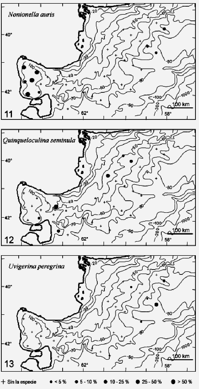 El sector de la plataforma continental corresponde a un tramo submarino de la cuenca del río Colorado que tiene conexión directa con el océano Atlántico Sudoccidental. El relieve submarino presenta pendientes en dirección noroeste-sudeste, suaves hasta profundidades de algo más de 70 m, desde allí hasta aproximadamente la isobata de 140 m el relieve se torna ligeramente ondulado y a profundidades mayores las irregularidades son más marcadas (Cortelezzi y Mouzo, 1979; Gelós et al., 1988). Los sedimentos de la plataforma son preponderantemente arenosos y composicionalmente homogéneos, mineralógicamente son inmaduros y texturalmente bien seleccionados y maduros. Su mecanismo deposicional se ha atribuido a los procesos de regresión-transgresión del Pleistoceno-Holoceno, en tanto la actual dinámica distributiva estaría vinculada a las corrientes de plataforma que circulan con sentido general norte y noreste (Gelós et al., op. cit.). Conforme a la nomenclatura batimétrica propuesta por Boltovskoy (1965) en este ambiente se diferencia la plataforma interna, que sigue a continuación de la zona litoral y ocupa una franja hasta las profundidades de 50 a 70 m, y la plataforma externa a la cual corresponden profundidades mayores. El golfo San Matías, situado en la provincia de Río Negro (40° 30' y 42° 30' S y 63° 30' y 65° O), es una cuenca semicerrada que posee profundidades mayores que la plataforma continental que lo rodea y se comunica con ella a través de un umbral; su porción central supera los 190 m de profundidad (Gelós et al., 1988; Parker et al., 1996). La depresión central del golfo está cubierta por sedimentos arcillosos de coloración verde, composicionalmente homogéneos y mineralógicamente inmaduros, cuyo origen es incierto (Gelós et al., op. cit.). La hidrología del área presenta considerables variaciones espaciales y temporales. Las masas de agua de la Plataforma Continental son de origen subantártico y la circulación media es de sur a norte. Sin embargo, en el golfo San Matías y en el área costera semi- protegida El Rincón se generan localmente características particulares (Guerrero y Piola, 1997). Ver otros conflictos en la deriva litoral en /cordones4.html Para estas latitudes Martos y Piccolo (1988) diferencian dos dominios: uno costero o interno y otro externo. El dominio costero se extiende desde la zona litoral hasta la isobata de 40-50 m. Allí, Guerrero y Piola (1997) reconocen un Agua Costera con baja salinidad (S<33,4‰) en la desembocadura del río Negro al sur del Rincón y un Agua Costera con alta salinidad (entre 33,8 y 34,00‰) en la desembocadura del golfo San Matías y en la zona central y sur de la provincia de Buenos Aires. El dominio externo se extiende desde la isobata de 40-50 m hasta los 100 m de profundidad aproximadamente, posición donde se ubica el cambio de pendiente correspondiente al talud. Guerrero y Piola (1997) describen en este sector el Agua de la Plataforma Media (S entre 33,4 a 33,6/33,7‰) que es interpretada como un flujo hacia el norte denominado corriente Patagónica. Las aguas presentan una fuerte estacionalidad, siendo homogéneas en invierno y estratificadas durante la época estival. La estructura de temperatura y densidad observada en la época de primavera-verano muestra una capa superficial y una de fondo, ambas separadas por una pronunciada termoclina y picnoclina entre los 30 y 40 m. Las aguas superficiales se describen fluyendo en dirección suroeste con valores de salinidad y temperatura característicos del Río de la Plata (Tº > 15ºC y S<33‰) (Martos y Piccolo, 1988). Al progresar el otoño e invierno las aguas superficiales se enfrían, la columna de agua se mezcla verticalmente por convección y se percibe una fuerte influencia de la corriente de Malvinas, la temperatura media es de 12ºC, los valores de salinidad son típicos de plataformas continentales. Por último, fuera de la plataforma continental pero con influencia sobre la hidrología, Guerrero y Piola (1997) diferencian el agua de Plataforma Externa o Talud. Esta agua se caracteriza por temperaturas menores a 15ºC con rango de salinidad entre 33,7 y 34,0‰ se ubicarían entre el Agua de Plataforma Media y la corriente de Malvinas. . . Figura 3.2. Mapas de las variaciones de abundancia relativa de las especies de foraminíferos seleccionadas (11 a 13) / relative abundance fluctuations of the selected foraminifera species maps.