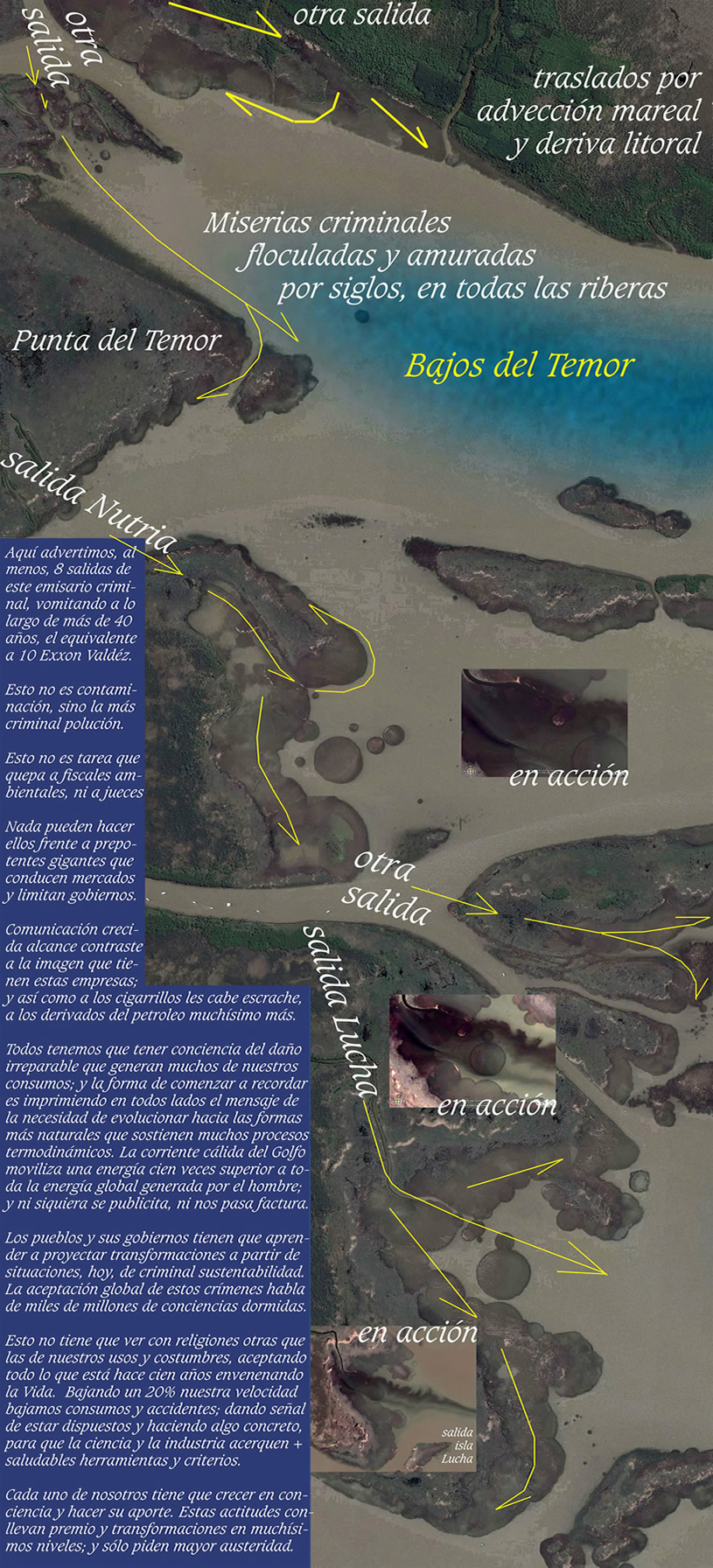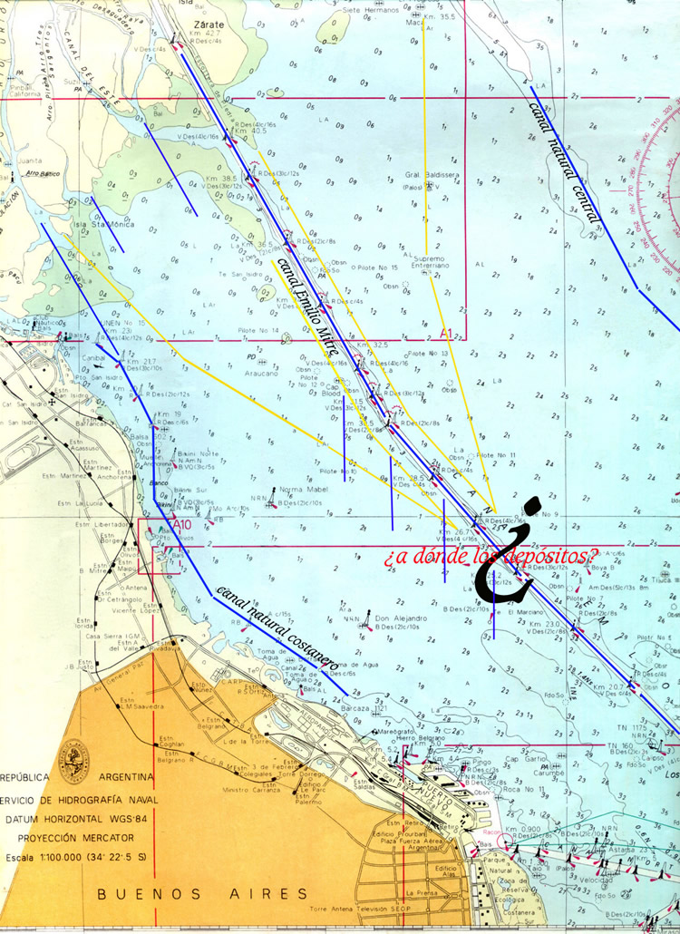 El emisario de hidrocarburos que por más de 40 años acerca desde Campana sus miserias al estuario, tiene varias salidas muy cercanas entre sí: una por la isla Nutria, una segunda por la isla Lucha, otras dos por la isla Zárate, una quinta por una pequeña isleta frente a la Lucha, una sexta al NO de la Punta del Temor, una séptima al NE de esta última y una octava al Este de la Punta Morán. Este viejo emisario de pestes criminales fue gestado en aquella década en que nuestros militares solían ocupar cargos relevantes en estas empresas involucradas. Tal el caso de López Aufranc en Esso en la década del 60. Es probable, que entonces se hayan sentido orgullosos. Sin embargo, fácil es estimar los más de 10 Exxon Valdés vomitados al estuario durante los últimos 40 años. ¿Serán concientes hoy de estas barbaridades; o ya las olvidaron? Estas localizaciones que se encuentran inmediatamente al Norte del inicio del canal Emilio Mitre muestran sus profundas gargantas, fruto de largas décadas de acción vomitiva. La disociación tan definida de esos vómitos habla de su carácter polutivo. Sus estelas disociadas son dables de observación a 40 Kms de sus bocas de salida. Al frente de estas islas se descubren las muy bajas profundidades de los llamados "bajos del temor". Habría que ver a qué refieren: si a la poca agua o a esta miseria por debajo de los abismos del terror. Las referencias que siguen de 1943, dan cuenta, entre otros, de las profundidades en pies de los cursos de agua que bajan del Paraná a la zona deltaria. Esas que los de Colony Park con la autorización de Beni, Director de Vías Navegables de la SSPyVN, llevaron a más de 65 pies -el doble del canal Emilio Mitre-, tal vez para permitir el fondeadero del acorazado Missouri. Ver causa en el Juzgado Federal en lo criminal Nº1 de San Isidro. No aprecio ironías, pero me resulta inevitable imaginar a ese crucero allí, pues ninguna otra embarcación por mí reconocida, alcanzaría ese calado. Ahora, después de haber sido denunciado, se le ocurre perdir o sugerir un estudio hidrosedimentológico. Una forma de probar su inoportuna distracción. ¿Qué tiene que ver la hidrosedimentología con el haber permitido dragar hasta el infierno en el Vinculación? Por qué no nos explica los límites y la coherencia de su función: la de él y la del Vinculación. Sigue imagen mostrando la prelación del Vinculación frente a los frenados flujos del Luján, varios años antes de que Beni autorizara las obranzas de profundización que terminaron metiendo de cabeza en el Puelches todas estas miserias que boyan en el área