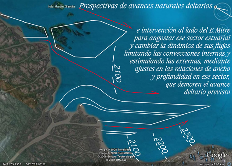 A resolver este desborde de "hidrotermias" apunta el reforzamiento y redireccionamiento de los flujos del San Antonio. Restando flujos al Vinculación para favorecer la salida de los flujos del Luján. Estas serían las medidas básicas iniciales que deben acompañar a la intención de reponer una deriva litoral apropiada; que una vez resuelta la salida del pequeño tributario o vertedero urbano, convecte externamente en el repuesto y cercano corredor de flujos costanero para completar su proceso dispersivo y traslativo. La reorientación del Canal del Este y el Desaguadero en sus salidas para evitar que se sumen a las aguas del Emilio Mitre, será oportuna en tanto comiencen a consolidarse las áreas ya sedimentadas al SO del canal; pues allí también conformarán el debido corredor costanero para ese sector. Lo mismo cabe expresar para el corredor de flujos del Barca Grande que habrá de barrer las áreas consolidadas al NE del Emilo Mitre. Con este esquema de flujos entendido y organizando su reparación ya es posible comenzar a mirar el área peninsular distante a un promedio de 8 Km de las riberas urbanas; que aspira a conformar con escalas apropiadas todas las necesidades que hoy no saben dónde localizar: vertederos de RSU y efluentes, puertos turísticos para grandes naves, nuevo aeroparque, nuevos puertos deportivos, balnearios que hace siglos desaparecieron. La comunicación a estas áreas peninsulares se advierte propicia desde el inicio por túneles con rieles en el caso de la basura y por transbordadores hasta la consolidación de cada una de las áreas. Si el destino de Buenos Aires es inevitablemente mediterráneo, imaginemos la posibilidad de consolidar estrategias ya asumidas hace casi 40 años en estas áreas al Este del Emilio Mitre; y enriquecer las miradas que concurran a fundar relaciones para los mejores cuidados del sector, que de hecho ya está moribundo y encerrado. Encierro que ahora se proponen rematar con las salidas de los emisarios y vuelcos de barros de dragados en ambos lados del canal de acceso. Ver anticipos de miradas ya expresadas hace 3 años Perfiles de creación de áreas nuevas para comenzar a visualizar senderos definitorios de emplazamientos, consolidados mediante refulados y rellenos sanitarios que permitan dejar en paz las riberas urbanas; al tiempo de comenzar a entender los flujos estuariales de esta UAG C con más ricos criterios. Con las debidas Gracias a Alflora Montiel Francisco Javier de Amorrortu, 6/4/10
