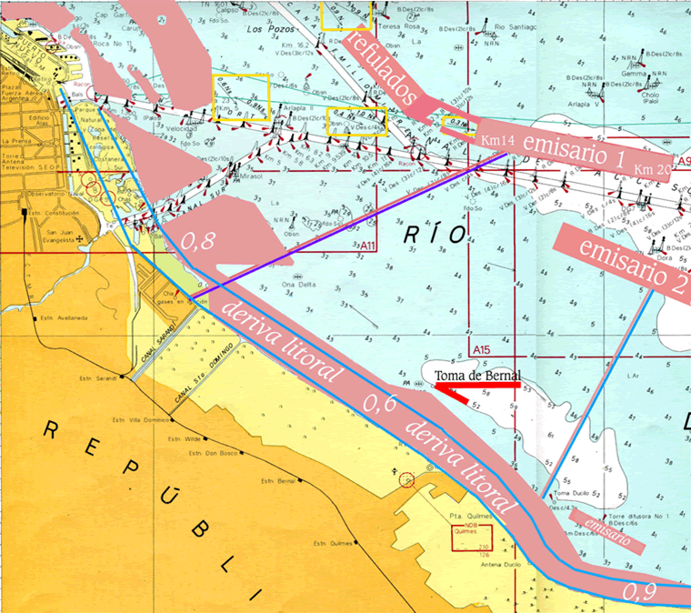 Ya no cabe hablar de "deriva litoral" cuando el ancho de esta se ha multiplicado 20 veces y su rumbo perdió el paralelo a las riberas. Ver cómo funcionan las tomas de agua de Palermo como aspiradoras de plumas con poluciones que ascienden 15 Kms desde el Dock Sud