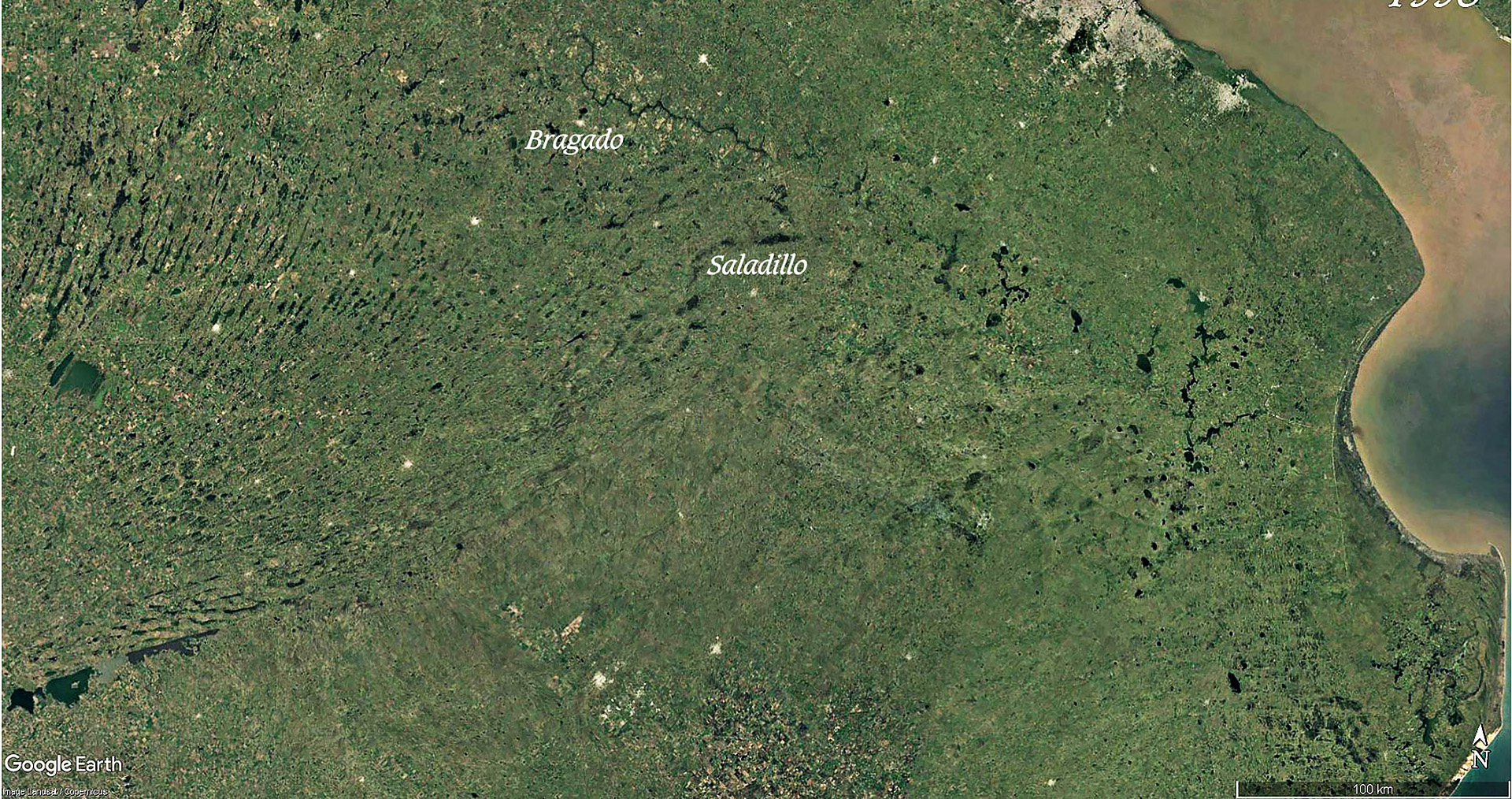 35. Cuenca del Salado . Su división en términos políticos viene planteada por una línea divisoria de Teodolina a Samborombón. Pero en términos geológicos cabe reconocer en un tardío mioceno los desarrollos pampeanosa partir del ligero plegamiento al Sur de las sierras de San Luis, obligando a los flujos cordilleranos a rumbear al Sur para comenzar a forjar sucesivos cordones litorales en el mar llamado Brazo de Tetis. Los suelos salinos que se forjaron, no son fruto de un mar “paranaense”, sino de salitrales cordilleranos