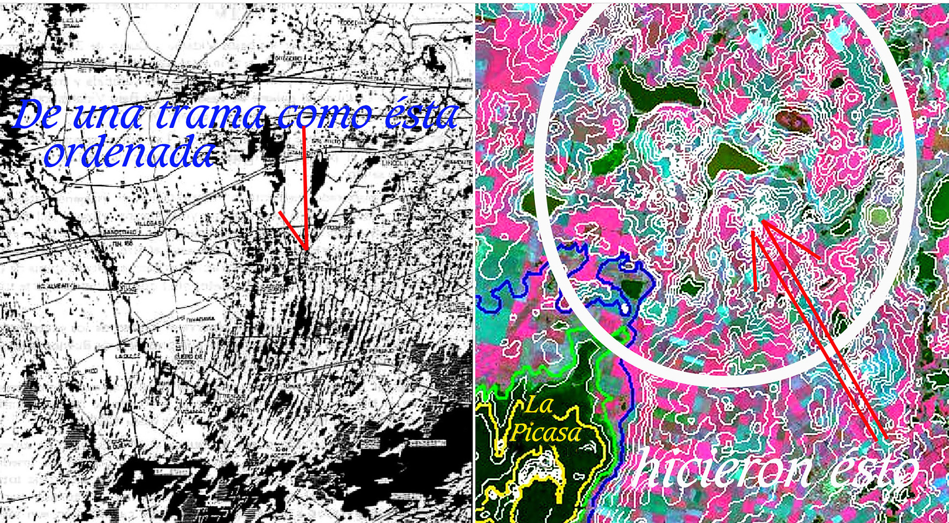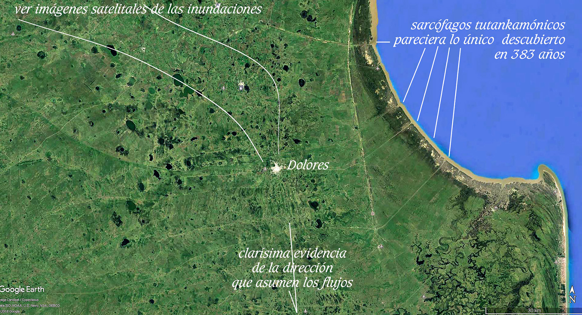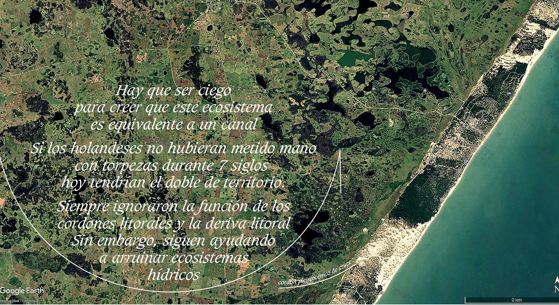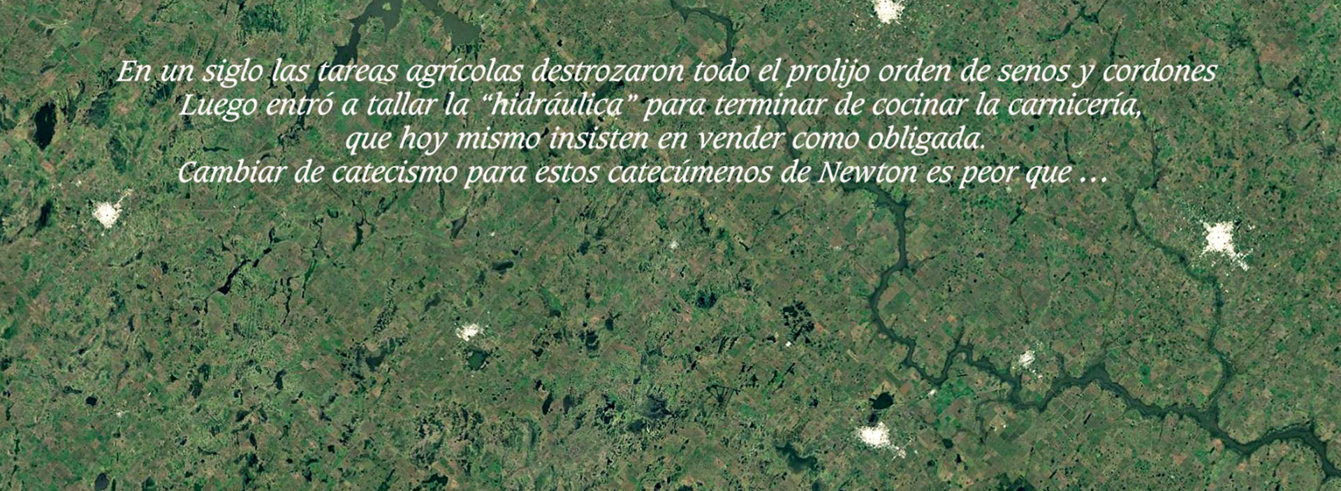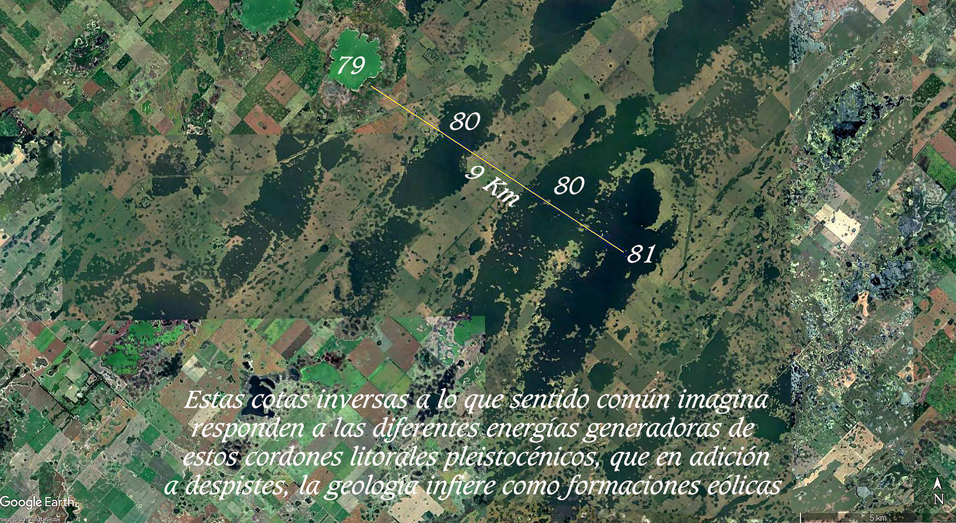 La imagen que sigue muestra la delicadeza de estos sistemas de cordones litorales tributarios al Brazo de Thetis, alterada por labranzas. Tal el caso de las obradas en cercanías de Christophersen, provincia de Santa Fe, generando la laguna La Picasa. El INA y el CONICET mudos. El Estado no resuelve estos problemas. Hace 20 años se vienen sumando en SCJPBA y CSJN estas denuncias sobre graves errores de la ciencia hidráulica que pesan en Madre Natura