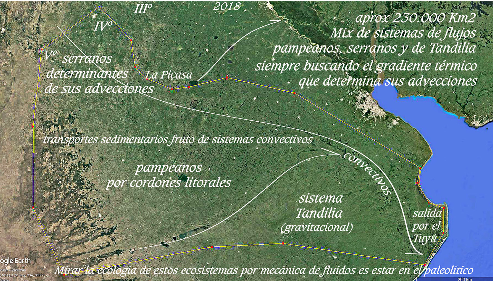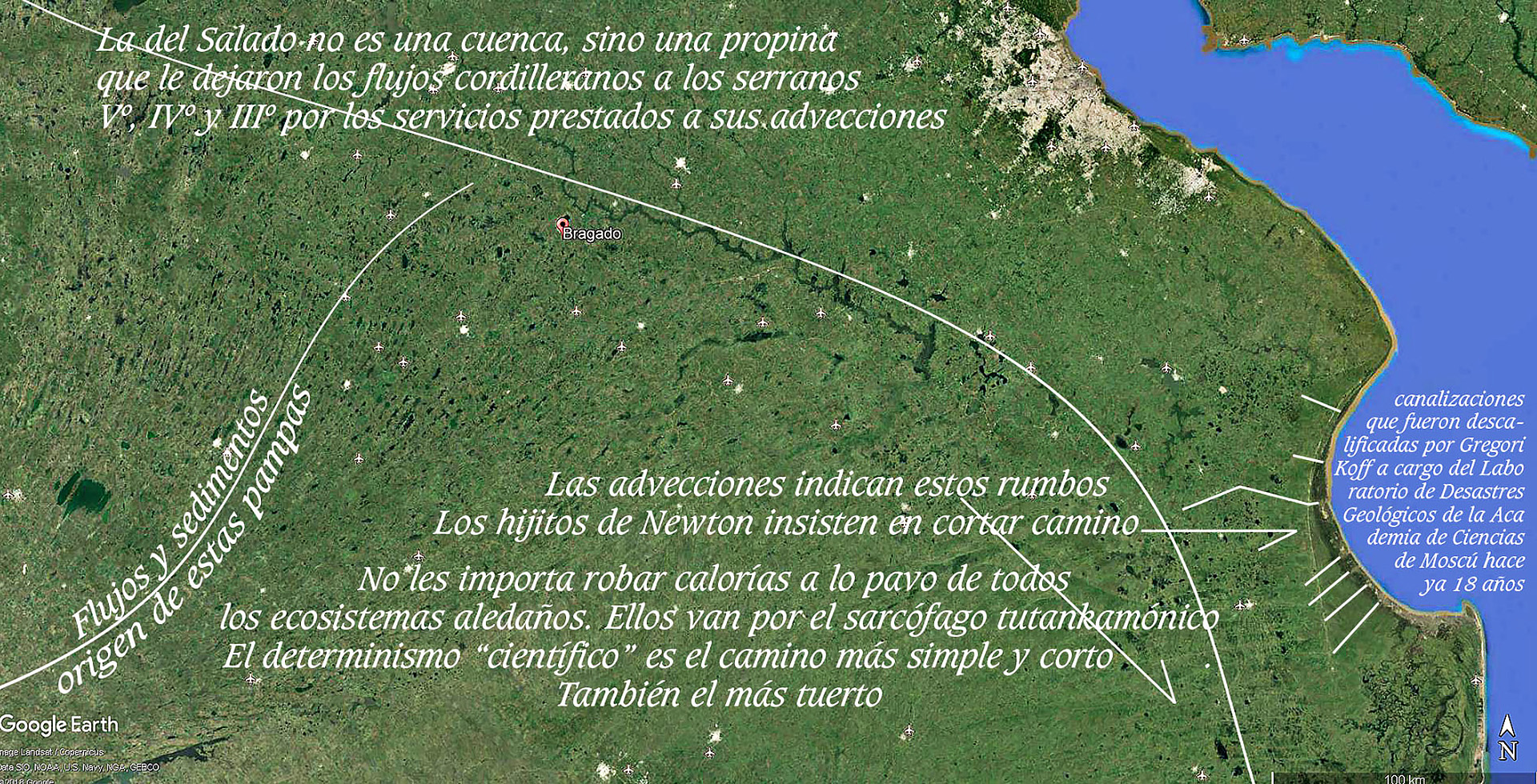Respecto de esta mentada cuenca del Salado aprecio señalar que nunca fue en los últimos 500.000 años "cuenca", sino "la propina" que le dejaron al Río V por haber oficiado los delicados gradientes térmicos determinantes de las advecciones de los sedimentos y flujos cordilleranos durante al menos los últimos 2,5 millones de años. La expresión "cuenca de sedimentación" ya nos pone en alerta del carácter o aprecio gravitacional que se supone reina en ella. En lugar de estimar cuáles son sus virtudes o aptitudes para estimular las dinámicas de los transportes sedimentarios, los geólogos apuran aprecios a los depósitos. Siempre ha sido así y no será menor el esfuerzo para cambiar de actitud. La caída de la manzana ha quedado rigidizada en su física matemática. Se miran caudales de entrada y de salida y en modelos de caja negra resuelven lo que nunca modelizaron, ni infirieron por fuera de las variables conocidas. Nunca tuvieron presente alguno los sistemas “convectivos” y los determinantes horizontales “advectivos”. Con semejante economía es inevitable que después de 380 años les cueste abrir los ojos a las energías que brotan en Natura. El ligero y gradual plegamiento al Sur de las sierras de San Luis impidiendo la salida Oeste-Este de los flujos cordilleranos de los antepasados del Tunuyán, Diamante, Atuel y tantos que ya borraron sus huellas, obligaron a buscar salidas al Sur por latitud 35º S , longitud 65º 40' O, y a medida que el plegamiento aumentaba y los senos de salida se tapaban seguir descendiendo hasta los 38º S. Este proceso es el responsable, junto a los al Norte comparables de los Río IV y III, de la formación de al menos los últimos 700 m de suelos pampeanos hasta hoy atribuidos al sistema paranaense. Que por ello doy en llamar mar pampeano, dejando las dunas para el recuerdo de los despistes geológicos en postrer olvido. La salida hacia el O, N y NE de los sedimentos y flujos cordilleranos cuyas advecciones fueran suscitadas por los flujos de estos tres cursos serranos, recibió como premio sus correspondientes "propinas", a las que la voz "cuenca" les queda un poco grande. Querer resolver la "personalidad" de estas "cuencas" con créditos del cretácico a 7000 m de profundidad, habla de que el imaginario humano no tiene límites. Tampoco su catecuménica analógica mecánica ceguera.