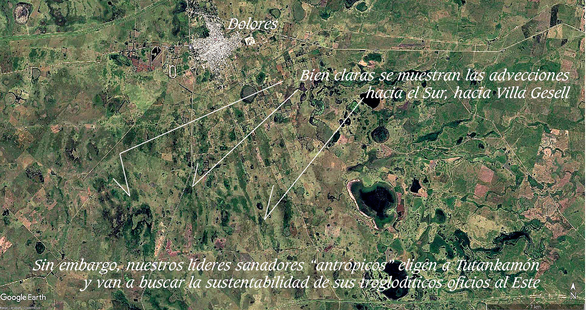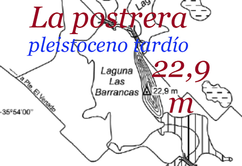 Es indudable que los delicados relieves que revelan la formación de estos suelos reclaman imágenes muy definidas de grandes áreas. Hoy las tenemos cargadas de información. Pero si la mecánica de fluidos sigue aferrada a sus catecismos gravitacionales y no dedica la menor atención a los procesos admirables que despierta el sol en Madre Natura, seguiremos cavando sarcófagos tutankamónicos. El art 2º de la termodinámica clásica también se descubre ciego. La imagen que sigue muestra en la parte inferior izquierda el relieve pleistocénico tardío de La postrera de 22,9 m de altura inferido al igual que todos los cordones de estas pampas como fruto de acción eólica, ajena por completo a termodinámica de sistemas naturales abiertos y enlazados; a los procesos convectivos y sus determinantes advectivos. Ajena por completo a la energía solar que el Anexo de la ley prov. 11723 reconoce en la Vida de los “ecosistemas”