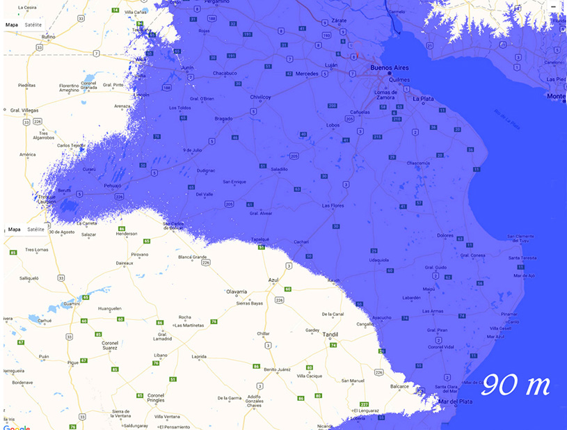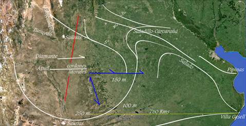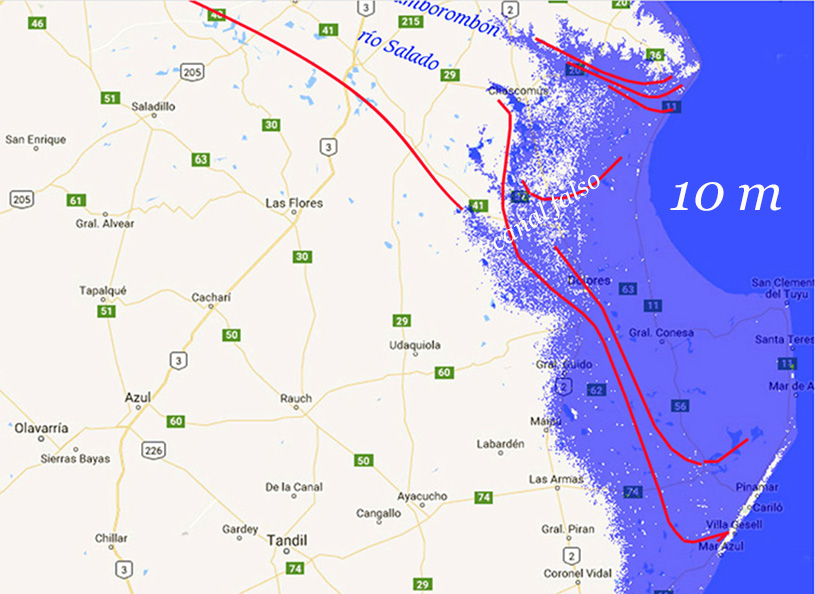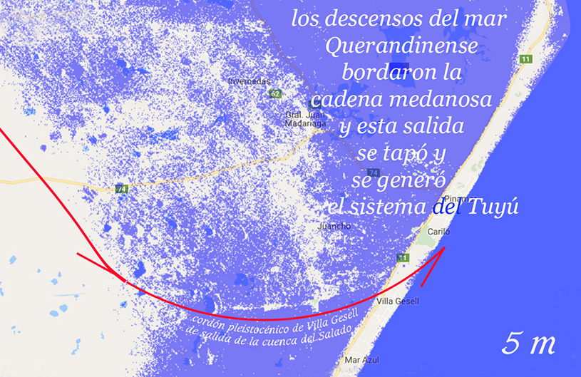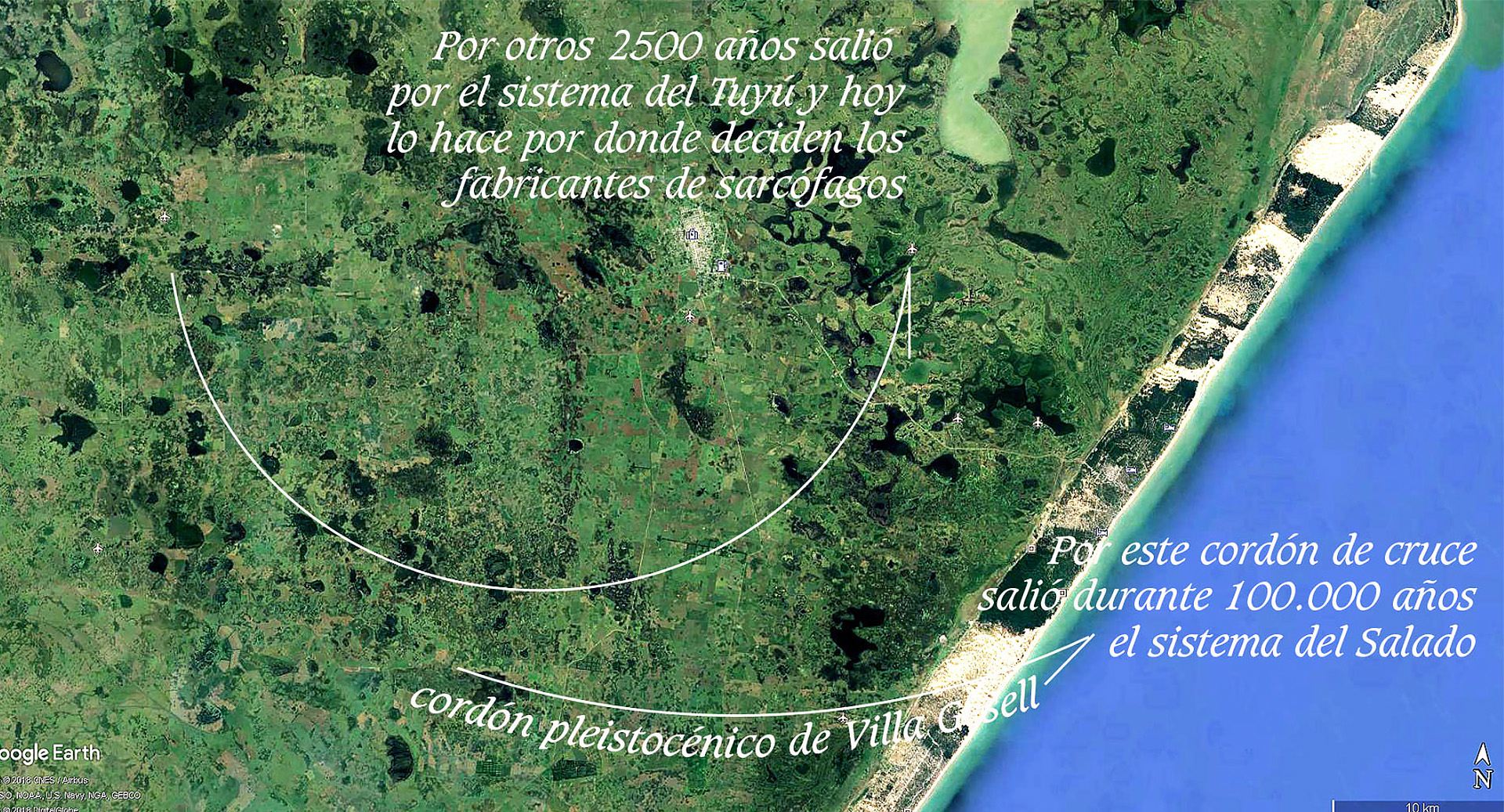 Las imágenes que aún hoy guardan grabadas las dinámicas de los cordones litorales de salidas tributarias en interfaces marinas a lo largo del tardío Mioceno, reconocen comienzo en la actual cota de los 300 m en la longitud 65º O, a 750 Km de distancia de la actual ribera atlántica. No estoy en condiciones de inferir que esa cota fuera la de aquellos tiempos del tardío Mioceno, o fuera fruto del desplazamiento y alzamiento de las placas; o herencia en plenillanura sureña de la fractura de las sierras de San Luis. Basta una elevación de tan sólo media décima de milímetro por año, para en 5 millones de años superar ese desnivel de aprox 250 m que se interpone a las salidas del Oeste en directo a la planicie.Por lo tanto, tampoco infiero que el mar pampeano miocénico hubiera alcanzado esas alturas, o fueron socavados sus accesos para dejar allí grabados esos tránsitos de las formidables rías; y ya en planicies marinas con aguas más someras, los bordados cuspidados de los cordones litorales que siguieron.http://www.alestuariodelplata.com.ar/salado2.html A estos aprecios a las “nacientes” del sistema del Salado cabe le sigan el de las “salientes” al océano, incluídas sequías e inundaciones Sequías 1574-76, 1614-1617, 1700-1710, 1729-1730, 1747-1749, 1771-1773, 1805, 1824 y 1832-33, 1879, 1910, 1929-1930, 1950-1952, 1956. Inundaciones. En 1857 un barco a vapor partiendo de Buenos Aires y subiendo por el Salado llega hasta la laguna de Samborombón. Imposible de no haber abierto una canalización. Que por cierto, jamás resolvería la disociación advectiva con las riberas de la bahía Hasta hace 1.500 años el Salado salía por la cara SE del cordón pleistocénico de Villa Gesell, al que se ve como línea delgada ligeramente curvada y cruzada al final de la carta y por cierto, anterior a la formación de las barreras de médanos de hace 1500 años.