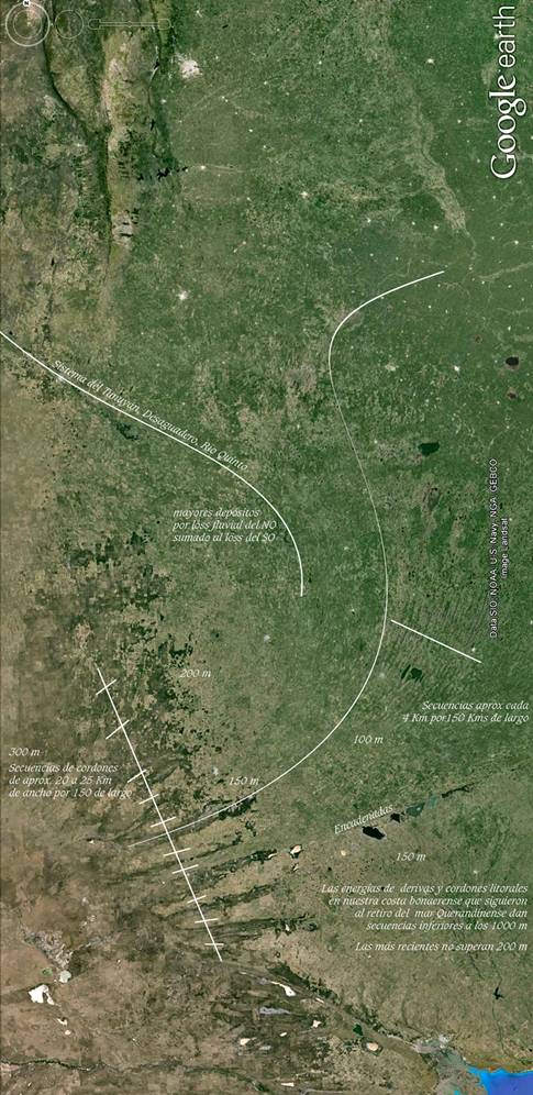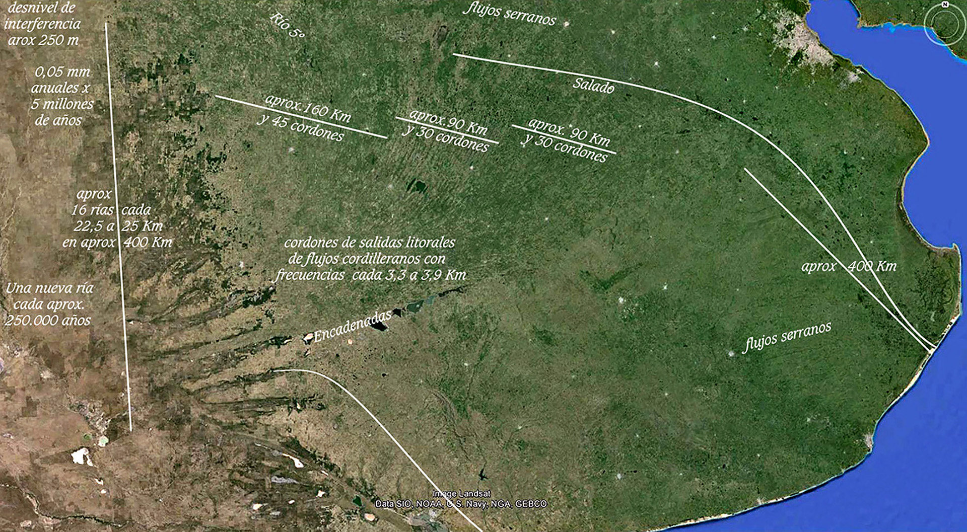 Las ríadas que se advierten a la derecha de la imagen conforman formidables conos de deyección de aportes sedimentarios cordilleranos con registros geomorfológicos que hablan de grandes caudales y energías en un tardío mioceno; con bocas de ingresos en las actuales cotas a 300 y 250 m, a las salidas en la interfaz de un mar pampeano miocénico en las actuales cotas de los 200 a los 150 m. Estas formidables energías vienen acreditadas por la amplitud de las rías y su persistente reiteración, progradando al Sur en número aprox a los 12 hasta el eje de las Encadenadas y 4 adicionales hasta el eje de la ría de Bahía Blanca. Progadación que responde, reitero, al desarrollo de la fractura terciaria al Sur de las sierras de San Luis, impidiendo que cursos como el Tunuyán, Desaguadero, Diamante y Atuel continuaran oficiando sus descargas en la dirección O-E. marpampeano 1 . 2 . 3 . 4 . 5 . 6 . 7 . 8 . 9 . 10 Rías que aún hoy acercan registros visuales satelitales superlativos, exhibiendo en la longitud aprox a los 66º O y desde los 34º 35' a los 38º S, frecuencias del orden de los 22 a los 25 Kms. y largos que hoy aún descubren 50 Kms en el primero al Norte, hasta 200 Kms en los que le siguen al Sur. La imagen muestra las acreencias que seguían a continuación de estas rías en la interfaz del retiro gradual del mar pampeano miocénico, por generación de cordones litorales de salidas estuariales en un área al O de unos 100 Km de ancho, por 300 Km de largo. Area expresada entre las líneas de la imagen que sigue