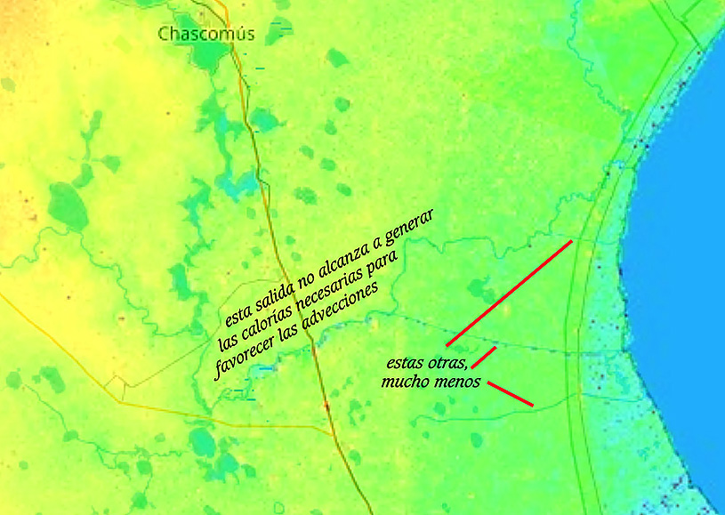 También se advierte en el centro lateral derecho de la carta, el trazado del canal por el que en 1857 llegaron en barco a Chascomús. Por fin, hace 2500 años el Salado encontró su salida por el sistema de humedales del Tuyú, sumando allí las calorías necesarias para advectar hacia el Norte superando las altas temperaturas de las riberas de la bahía. En cercanías de la salida del río Samborombón resultaría imposible por las altísimas temperaturas en esas riberas con sedimentos precipitados en tal desorden, que no lograrían en 100 años superar ese desencuentro advectivo. Tan torpe, que en oportunidad de venir a la Argentina a presentar el anteproyecto de un aliviador para el Salado. el Prof. Dr Gregori Koff a cargo del Laboratorio de Desastres Geológicos de la Academia de Ciencias de Moscú, confesó -sin que nadie se lo preguntara-, que allí se había generado un desastre geológico. Ese, que a este que suscribe le permitió un 15/8/2009 descubrir el corredor de flujos que bautizó con el nombre de su Musa inspiradora: “corredor Alflora” frentehalino 1 . 2 . 3 . 4 . 5 . 6 . 7 . 8 y Puerto Alflora . 1 . 2 . 3 . 4 http://www.hidroensc.com.ar/csj1525.pdfCausa CSJ 1524/2019 http://www.hidroensc.com.ar/csj1525%20anexo3.pdf http://www.hidroensc.com.ar/csj1525amplioanexo.pdf