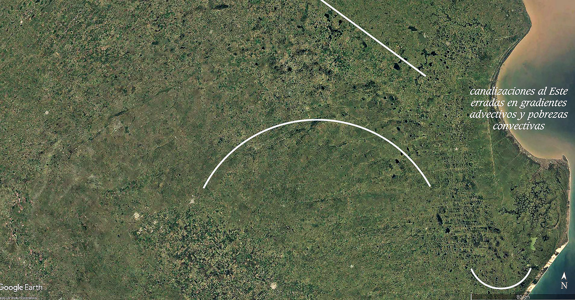 Las imágenes que siguen intentan mostrar las delicadezas de un sistema de compromisos advectivos de tres cursos serranos con las rías de descargas de flujos cordilleranos en cota 360 a 250 m en la longitud aprox a los 66º O y desde los 35º a los 38º S, con frecuencias del orden de 22 a los 25 Kms. y largos que hoy aún descubren 50 Kms en el primero al Norte, hasta 200 Kms en los que le siguen al Sur.