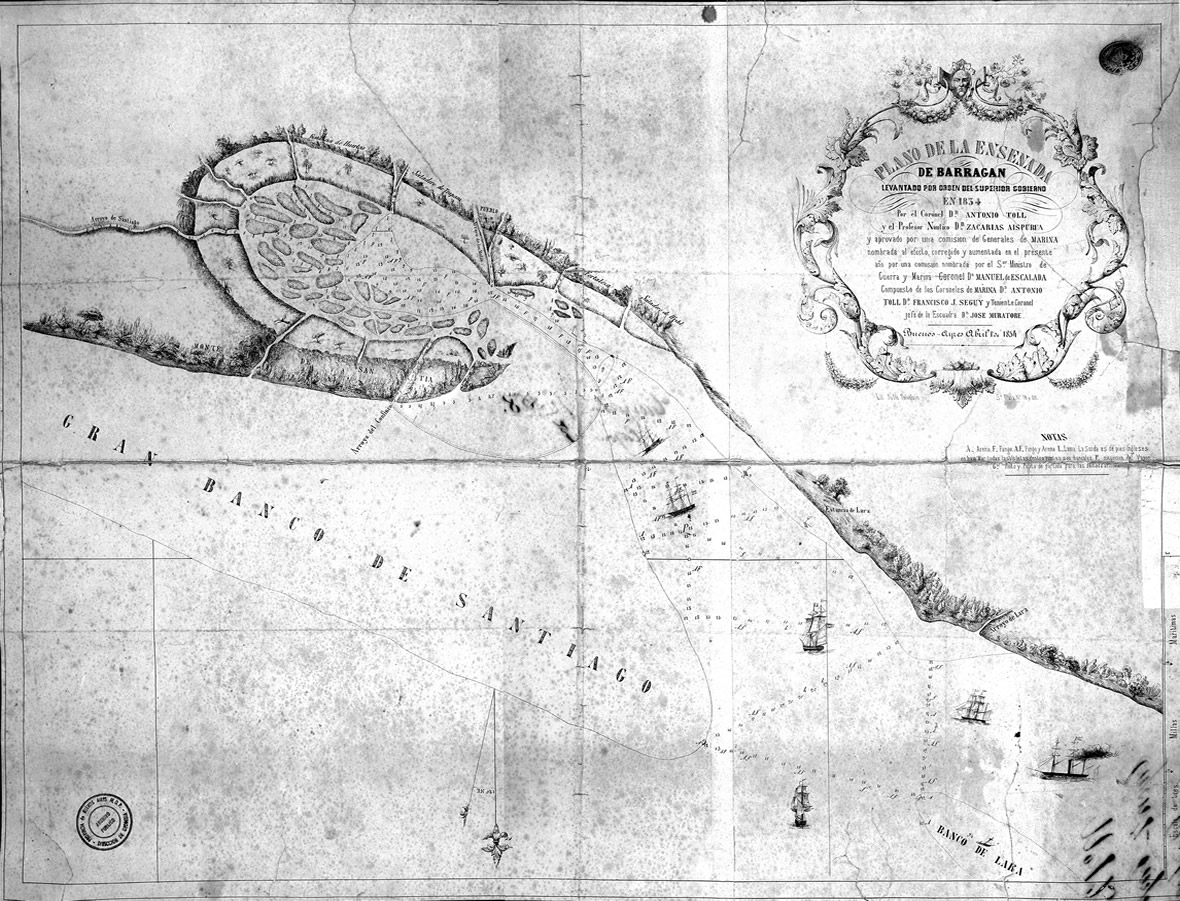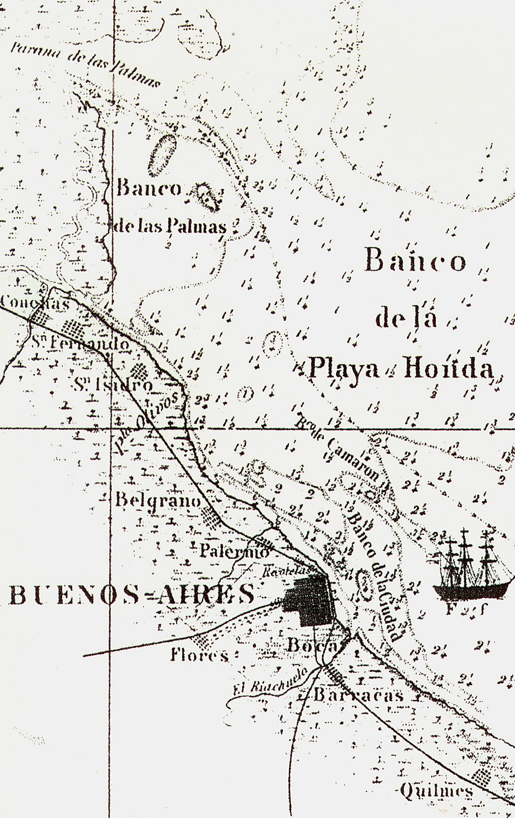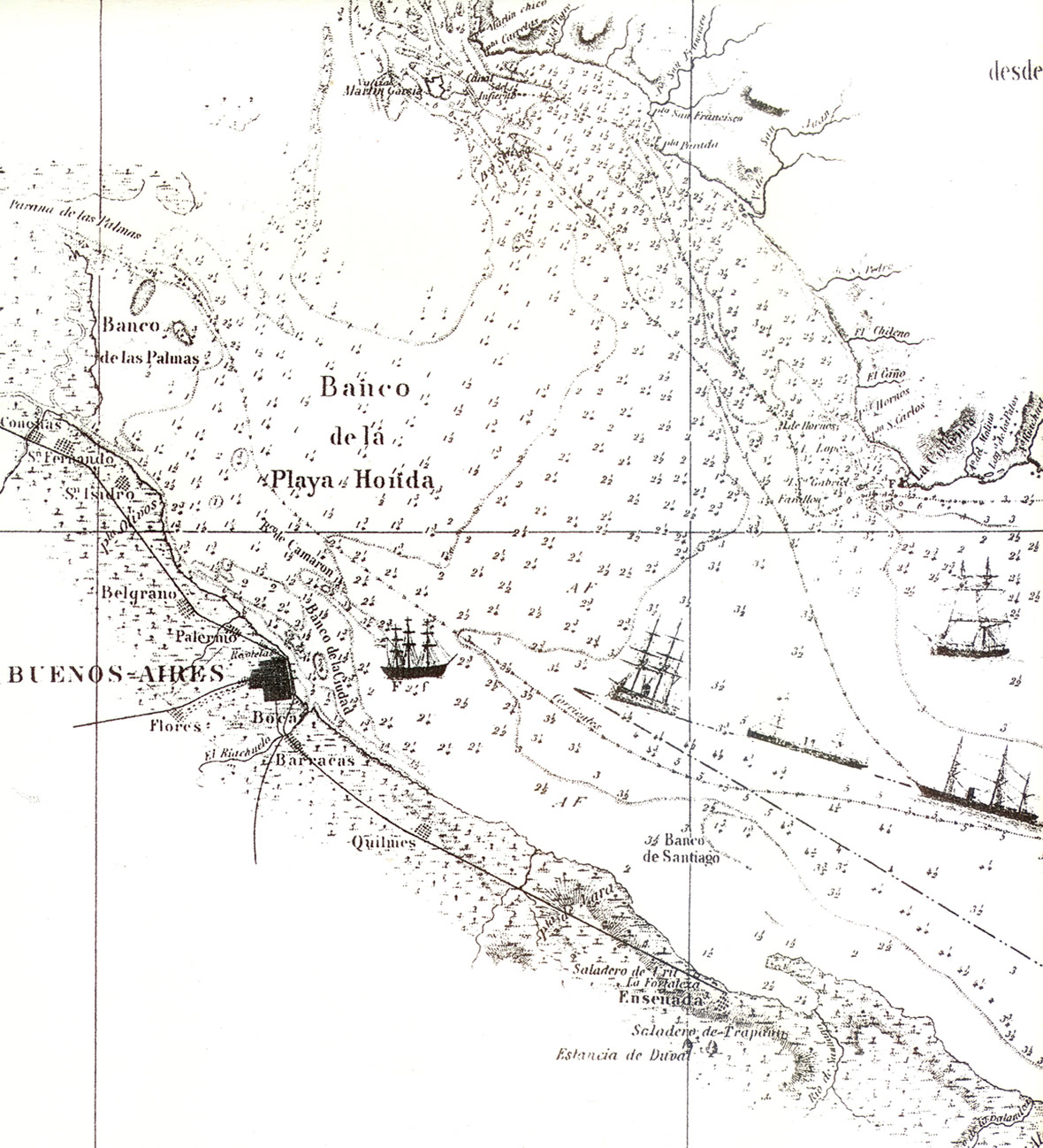 En la imagen que sigue de 1867, Aizpurúa nos muestra el corredor de flujos costanero del Luján sin la interferencia que luego Dufourq destaca de la Punta Amarga en su plano de 1894. Saliente sedimentaria provocada por la escollera de San Isidro, que fuera apuesta redoblada a solucionar los embancamientos provocados a la salida del arroyo Sarandí, tras haber roto la curva del cordón litoral natural de salida.