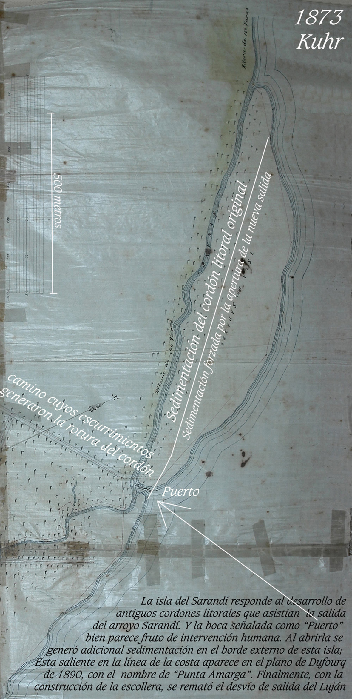 Plano de Germán Kuhr mostrando la rotura de la curva del cordón de salida provocado por los escurrimientos de calle en bajada de las barrancas, justo allí donde aparece ahora la señal de un puerto. Puerto que en pocos años vería la necesidad de una escollera por la sedimentación desordenada que ya no seguía los prolijos patrones del borde cuspidado que siempre regalaron sedimentaciones en extremo ordenadas. La bruta acreencia que sigue al Este del Sarandí ya pasa de simple y estrecho cordón, a ser "isla" reclamada por Don Adolfo Conde, propietario frentista al estuario.