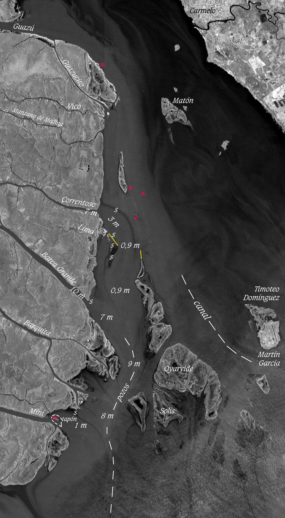Aprecios al Barca Grande también vienen referidos por Benito de Aizpurúa en 1867 y Félix Dufourq en 1894. Recordemos que la ruta por los Pozos del Barca Grande era mucho menos peligrosa y bastante más breve que los pasos próximos a la costa uruguaya saliendo de Colonia. De los dos brazos de salida del Paraná de las Palmas ya Aizpurúa marca las preferencias del brazo Sur. Sobre estas dos salidas acercaré hipótesis que apunta a explicar el desarrollo de la deriva litoral que en los últimos 100 años, y en especial en los últimos 50 años, ha modificado en mucho las pautas sedimentarias que teníamos del frente deltario central. Análisis del avance del frente y del incremento areal del delta del río Paraná Antiguamente el sentido de avance de esta zona era E, pero actualmente este avance es cada vez más pequeño, tendiendo a estacionarse por encontrar en su ambiente, condiciones desfavorables de depositación, debido al aumento de las velocidades locales causado por el estrechamiento de la sección entre las márgenes del Uruguay y la de este sector. De esta manera, la nueva dirección de avance predominante, S, S-E, tiende a favorecer la formación de islas y bancos en este sector, que en un futuro no muy lejano pasarán a formar parte del Frente. La zona E (subfrente Norte del Paraná Guazú), presenta un crecimiento reducido en sentido S, S-E causado por sus condicionantes cercanos, el río Sauce al Norte, la unión de éste con el río Uruguay y el Paraná Guazú al Sur. Actualmente esta zona está tendiendo a la estacionalidad en su superficie. Cabe mencionar, que debido a estas condiciones generadas por el efecto conjunto de la unión del Paraná Guazú y el Uruguay, los sedimentos que no son depositados en el Frente del Delta quedan atrapados en lugares propicios para depositar, lo que puede observarse en el notable incremento de bancos e islas sobre el Frente. Son de especial atención, las principales islas como Oyarvide, Martín García, Timoteo Domínguez, El Matón, Juncal, Nutria y Lucha, las cuales, presentan comportamientos distintos respecto a su aumento superficial. La Isla Oyarvide es la que presenta un desarrollo distintivo frente a las demás por su gran crecimiento en los últimos años. Esta isla nació en el período 1926-1969 y a partir de ahí comenzó un notable incremento de su superficie en tres sentidos diferentes: N, S y S-E. El crecimiento en sentido N, se inició en el período 1969-1984 y se desarrolló principalmente durante 1984-1994, constituyendo así, un medio que separa los flujos de agua del Canal Buenos Aires del de los Pozos del Barca Grande. El crecimiento en sentido S, se dio primero en una unión con la isla Solís para luego desarrollarse en forma de herradura y avanzar hacia la zona de influencia del Paraná de las Palmas. Finalmente en sentido S-E se dio un crecimiento ganando terreno al Río de la Plata y formando una especie de límite que alarga el embudo de salida de las corrientes del Guazú y Uruguay. En el mismo aspecto, vale mencionar que en este último período de tiempo, muchas de las islas que se encontraban muy cercanas ya se han unido formando una sola como es el caso de la isla Martín García y Timoteo Domínguez. El islote El Matón surgió en el mismo período que la isla Oyarvide y su gran desarrollo se da hacia el presente. Al igual que en la isla Oyarvide, el desarrollo de este islote se da en forma de herradura. En ningún momento los autores de este trabajo sobre los avances del frente deltario pronuncian siquiera la palabra "deriva litoral". Para ellos todo fluye aguas abajo en forma más o menos mecánica. Tampoco a los procesos de sedimentación los relacionan con flujos de distintos segmentos y direcciones encontradas, ni disociados por capa límite térmica o hidroquímica. Todo se conserva en acuerdos académicos indiscutidos que por fortuna nunca me han convencido, ni me han impedido mirar con otros ojos y marchar por otros caminos.