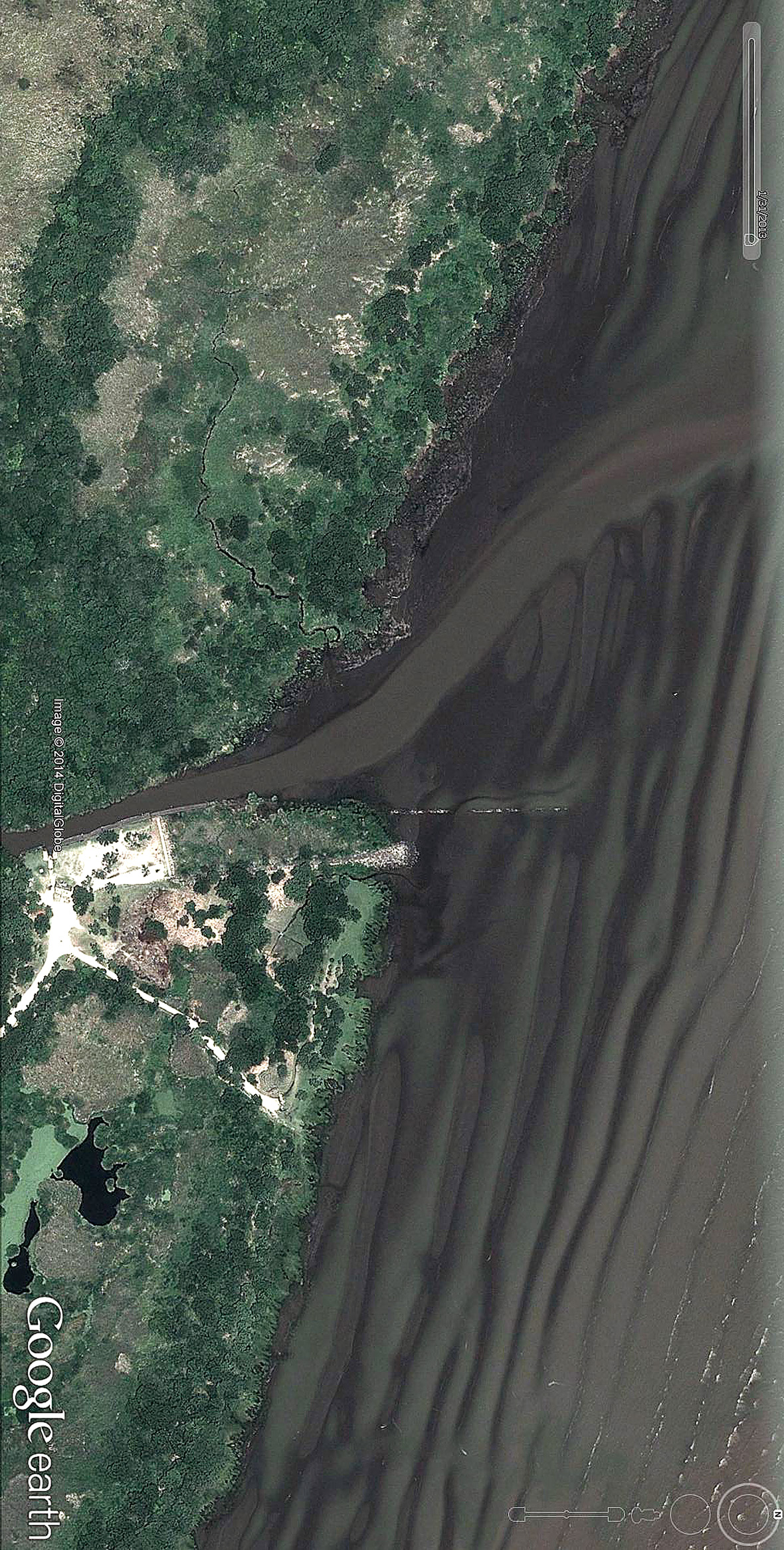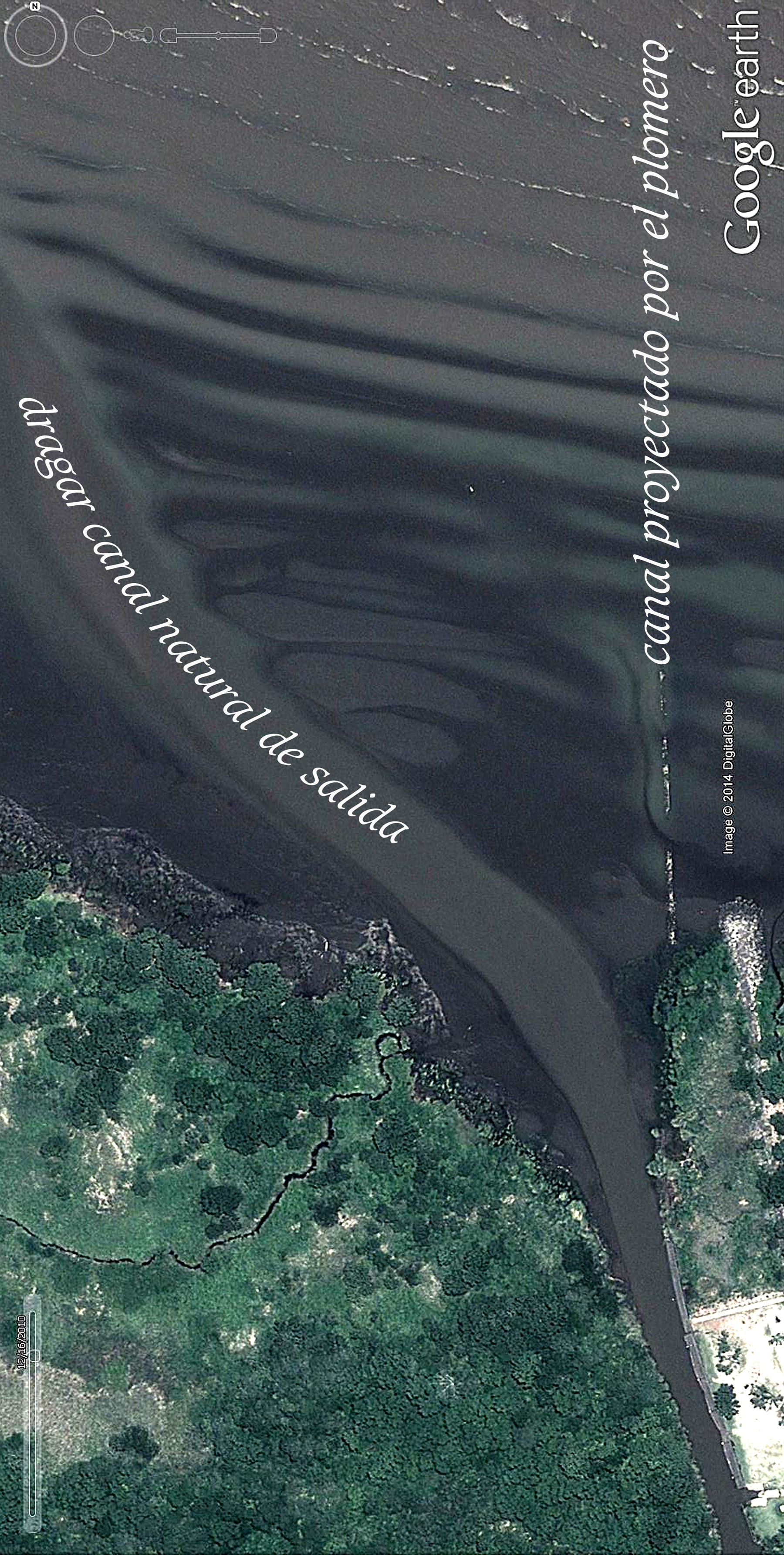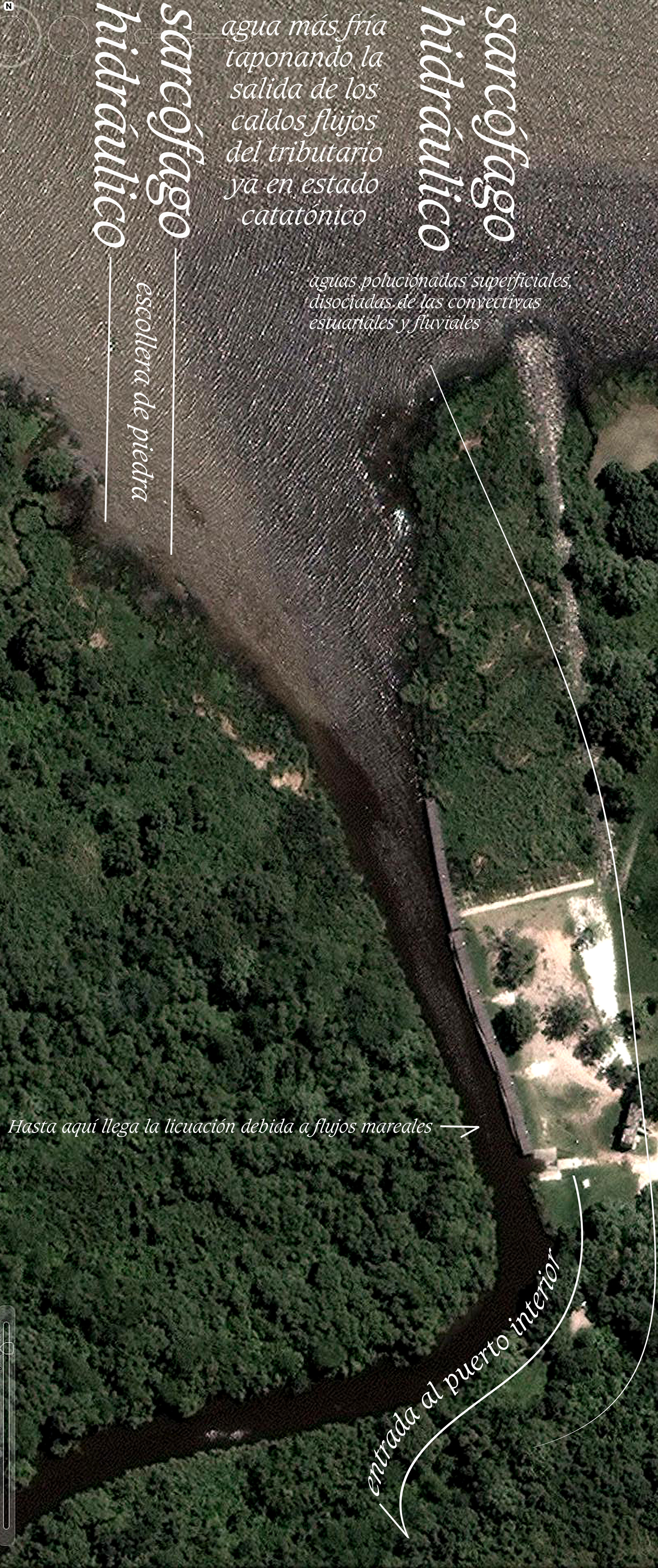 En medio de estos fondos estuariales de aguas someras en planicies extremas, no caben torpezas mecánicas más ajenas, que a las energías solares y sus convectivas respuestas dinámicas, intercalarles estas brutas escolleras de piedras. El tapón termodinámico de aguas más frías canalizadas en sarcófago "hidráulico entre estas dos escolleras de piedra, será cierre hermético a los tibios flujos ya en estado catatónico que luce el pobre Arroyo Buriñigo. Ciega mecánica de fluidos,¡dejad atrás vuestra física matemática y después de 300 años despertad a termodinámica de sistemas naturales olárquicos abiertos! Ningún puerto deportivo sobre tributario estuarial reclama escolleras de piedra que facilite sus accesos. Es suficiente, respetando la dirección del canal natural, hacer mantenimiento y balizamiento primario de su salida natural. |