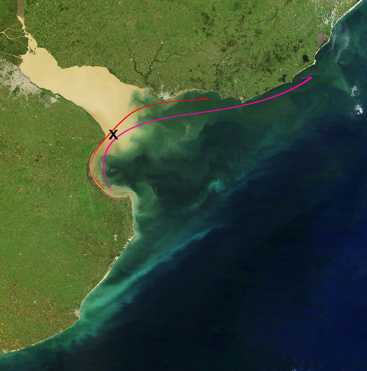 Ponerme a hablar de las irresponsabilidades de los vuelcos de dragados al Sur del Km 26 del canal de acceso recomendadas por HYTSA tras haberse incendiado la draga de corte de Jan de Nul que había sido enviada a Centroamérica a hacer una changa de la que jamás volvió y modificar el proyecto de Halcrow solo porque lo dice el grupo de consultores de Hidrovía, porque no se les ocurre otra cosa, es cuestión que prefiero dejar para otro momento. Tampoco quiero aquí extenderme en lo dispuesto en el Plan Integral de Saneamiento Ambiental Matanzas Riachuelo de obrar dos emisarios de 7,5 y 12,5 Km de longitud para volcar a ambos lados del canal de acceso 4 millones de m3 diarios de efluentes por vía de dos emisarios que fueron aprobados por la Corte a pesar de no haber transitado el debido Proceso Ambiental. De sus previsibles desastres ya la propia Corte tendrá que hacerse cargo aunque pase un siglo, pues no basta la firma de Jorge Bolt para acreditar ese inexistente debido proceso. Este plan será el principal responsable del tapón sedimentario de órdago a la salida del sector de 80 Kms 2 que media entre el Dock Sur y el Tigre; entre el Emilio Mitre y las riberas urbanas, que hoy luce un promedio de 80 cms de profundidad y flujos en estado catatónico: 0,3 nudos. La ciudad de Buenos Aires tendrá que hacerse cargo de velar el cadaver nauseabundo de un lodazal durante no menos de 200 años. Materia, la de este devenir mediterráneo de aquí a 50 años, a la que nadie ha dedicado la más minima atención. Ver video de 120 minutos sobre este tema en http://www.alestuariodelplata.com.ar/prospectivas4.html Vuelvo al tema del proyectado canal. Las diferencias de temperatura, sumadas a la dirección cruzada a 90º con respecto al corredor Alflora, les garantiza el infierno anunciado. Si a ésto le suman la energía de los flujos bien al través de la navegación, entonces prepárense a obrar un canal de 300 m de ancho, pues de lo contrario siempre quedarán varados. He navegado el estuario desde hace 60 años. Antes lo había hecho en Mar del Plata. Hoy renuevo esas singladuras mirando y acopiando bancos de imágenes como estimo pocos han hecho. Y en particular, afinando la mirada en sistemas termodinámicos naturales abiertos que nada tienen que ver con las miradas mecánicas. No reconozco en quienes han llevado adelante el tratado internacional del Río de la Plata otra virtud que habilidades políticas para imaginar el partido radical a estas parcelas como propias. De aportes al estudio del estuario no les alcanzo a reconocer nada más allá de mantenimiento básico y señalización de la hidrovía. Eso no alcanza para considerar el transporte natural de nuestras miserias, que suman más toneladas que la soja. Me recuerda al palacio de Versailles que tenía regias entradas y salidas, pero el destino de los detritus humanos eran resueltos tirándolos por las ventanas del gran palacio. Si no es el ministerio del Transporte quien tiene que mirar por estas materias, por favor, resuelvan quien lo haga. No es solo la hidrovía lo que cuenta en este estuario. El cercano desastroso futuro de la gran metrópoli es bien más importante. No está en la agenda de nadie, pues todos miran por el comercio y las urgencias inmediatas. En este estuario, al igual que en todos los estuarios del planeta, no hay un cm3 de flujo que no se reconozca cargado de energías convectivas. Sin embargo todas las modelaciones van por flujos laminares. Van por lo simple, aunque a las dinámicas horizontales en planicies extremas el núcleo no aporte la millonésima parte de lo que aporta el sol. El 0,023% de la energía solar alcanza para alimentar en el reino vegetal los procesos de fotosíntesis. 1000 veces, el 23% es lo que entrega el sol de la energía que llega a la tierra para alimentar el movimiento de los fluídos. Sin embargo, nunca hablamos de ello. El abismo cognitivo es … Refiriendo de los puertos de Quequén y Mar del Plata, en especial éste último amén de sus problemas sin solución para los ingresos, son los primeros responsables de que la deriva litoral que eternamente protegió las playas bonaerenses, se haya visto desde hace 100 años transformada en deriva de plataforma y a cargo de transportar una masa de sedimentos que las imágenes que más abajo acompañan esta edición me ahorran de mensurar.