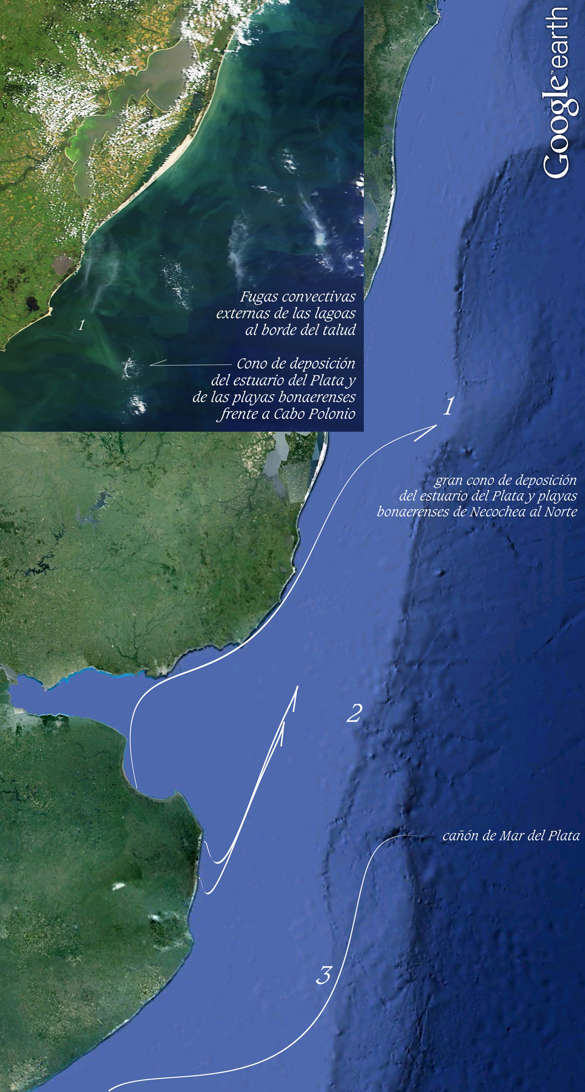 Tan sorprendido quedé en su momento de ese sistema que nunca había sido mencionado por nadie, que lo bauticé con el nombre de la Musa que guía mis trabajos: "corredor Alflora". Al día siguiente Google daba noticias de ese hallazgo. Unos años antes había venido a la Argentina el Dr. Prof. Gregori Koff , titular del laboratorio de Desastres Geológicos de la Academia de Ciencias de Mosú, a presentar el anteproyecto del Aliviador del Salado. Un amigo personal, el Ing José Da Cunha lo había acompañado en sus presentaciones y me comentó que éste había hecho incapié en dos cuestiones: 1º, advertir que era un error muy grave pretender escurrir áreas endorreicas como lo proponía el plan maestro, pues ellos habían cometido ese mismo error en el plan maestro llevado a cabo en las planicies ucranianas y jamás ocultaría esa experiencia a otros que solicitaran sus servicios. Y en 2º lugar advirtió que las canalizaciones obradas a lo largo del siglo con salida a Samborombón habían provocado un desastre geológico. Se refería a las salidas con criterio mecánico que no correspondían en sus sedimentaciones a los ordenados procesos naturales que reconocen los cordones litorales. Este problema es algo más complejo de explicar que la teoría mecánica que los infiere de la energía de una ola oblicua. Este que suscribe los infiere de la prolija sedimentación de borde cuspidado que por capa límite térmica los conforma en la cara externa del corredor de flujos de salida tributaria en el tramo de acople a lo que llamamos deriva litoral; asistente irremplazable de la eficiencia de todas las salidas tributarias estuariales y marinas. También esta deriva litoral es inferida por la mecánica en función de la ola oblicua. Ver la página web dedicada a este tema: http://www.derivalitoral.com.ar El caso es que este sistema que arranca de Samborombón lleva una enorme carga sedimentaria, que cual móvil batería termodinámica asiste de energías convectivas al corredor Alflora en su cruce de la boca estuarial que va de Punta Piedras a Montevideo y más allá bordeando la costa uruguaya. Por ello, su capacidad para llevarse “puestos” todos los sistemas de flujos en descensos que bajan por el estuario, es invitación a mirar con mínima atención estas novedades, que a nadie quitan su libertad; por el contrario, los hace más libres. El conocimiento tiene esa virtud. Si el INA, EIHSA, HYTSA y los demás consultores aplicados a estos temas jamás han hablado de este sistema y de ningún sistema que reconozca energía solar y no simplemente gravitacional, lo mínimo que me cabe es regalar esta novedad. Que ya hube expresado en oportunidad de celebrarse en Octubre del año 2010 el Primer Congreso Internacional de Ingeniería organizado por el Colegio Argentino de Ingenieros. Los dos trabajos sobre fenomenología termodinámica estuarial aparecen publicados en http://www.alestuariodelplata.com.ar/convec2.html La delicadeza de estas miradas está acreditada en tarea judicial que reconoce en SCJPBA 40 demandas de hidrología urbana, con más de 12 millones de caracteres, sin jamás haber pedido a cambio algo personal. Aprecio sembrar conciencia de este cambio de paradigma en cosmovisión hidráulica cuyos catecismos son responsables de todos los fracasos de obranzas en planicies extremas, aquí y en todos los rincones del planeta. Estos sistemas convectivos guardan en los fondos la memoria de sus tránsitos y no en superficie. Por ello es inútil toda la experimentación que hacen y han hecho con boyas derivantes. Solo son dables de reconocimiento por imagen satelital y por depósitos sedimentarios En este caso del corredor Alflora, se trata de sistemas disociados en sus gradientes térmicos e hidroquímicos o halinos, que aún así marchan apareados. Ver http://www.alestuariodelplata.com.ar/frentehalino8.html Este ramillete convectivo reconoce un ancho cercano a los 40 Kms. El más occidental y de agua más dulce barre la Barra del Indio y pasa al Oeste del banco de Arquímides. Los apareados al Este barren el fondo del Frente Marítimo y se relacionan con las sedimentaciones en el banco Inglés y en los horarios de reflujos, con el anterior. A pesar que la sedimentología siempre acreditó en estas áreas una gran sedimentación fruto de floculación termohalina, nada de eso se comprueba en estos escalones del perfil de fondo, que se mantienen limpios y sólo descargan sedimentos en los bancos recién mencionados, fruto del encuentro de una energía mareal que ingresa a esa distancia de las costa uruguaya y extiende sus efectos hasta el Umbral de Cufré. (Los sedimentos del banco de Rouen responden a otras energías). La mayor parte de estos sedimentos, junto a los que bajan del Bermejo y los silicatos que suben de Necochea, Mar del Plata y el resto de las playas bonaerenses, todos ellos reconocen senderos que se unifican en su descarga en el talud oceánico frente al Chuy. Allí se sumergen en el talud oceánico, descendiendo rápidamente de los 200 a los 1500 m para luego seguir al Este unos 1200 Kms antes de convectar al Sur otros 1300 Kms siguiendo el gradiente térmico que guía su advección. Siempre barriendo el fondo y siempre sus aguas dulces disociadas de las saladas. Que por marchar por debajo de las saladas no son registradas estas dimensiones y tránsitos por el satélite Aquarius que solo mide salinización en los primeros 10 cms de la superficie. Siempre infirieron que las aguas dulces marchaban por encima de las saladas, olvidando la carga de sedimentos que les acompañaban y energizaban. Ver http://www.alestuariodelplata.com.ar/viajesedextra.html Quien estudie el acople del corredor de flujos que baja por la costa bonaerense a 1,3 nudos, con el que sube por la bahía a 2,4 nudos, advertirá que la más ligera diferencia de temperatura que supere las dos décimas de grado se transforma en inmediata sedimentación. De ello da prueba el banco de El codillo. Pero si en adi