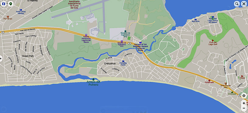En los años que siguieron a la época que fueron adquiridas las tierras de Ocean Park el turismo padeció el terrorismo, siendo muy pocos los 4 pobladores que acusa en 1975. Por ello, el propietario gozó de la privacidad suficiente para desviar al Este los senderos de salida del arroyo sin sufrir denuncias. Estas, le llegan medio siglo más tarde. Grendene advirtió que la salida al Oeste del Ar. Potrero le vedaba acceso directo a las playas y tuvo tiempo de sobra para buscar una solución al problema. Nadie le dijo nada en 50 años. Esta denuncia no es debida al aprecio que siento por mis compatriotas uruguayos (mi Madre era uruguaya), sino al aprecio que siento del Amor de mi Musa y esposa Alflora Montiel Vivero, animando e inspirando mirada por termodinámica de sistemas naturales abiertos y enlazados durante 20 años, para asistir los dones extraordinarios de Madre Natura.Cuando Grendene llegue a mejor Vida se enterará que los valores que conforman Capìtales de Gracia –esos que permiten comunicar el cielo con la tierra-, son la pobreza y la fidelidad a los esfuerzos, más allá de sufrimientos. Tal vez quepa dejar constancia de una peripecia anterior que padeció el arroyo El Potrero a la salida de la laguna. Y fue en la década del 40 cuando el gobierno uruguayo y el de EEUU celebraron un acuerdo para elevar en 4 m el nivel de la laguna mediante la construcción que una pequeña represa, la que hoy mismo reconoce en su salida. Esa mayor altura permitiría que hidroaviones de EEUU aterrizaran con bajo riesgo en la laguna. Lo que nunca tomaron en cuenta era el robo que la presa haría de la carga sedimentaria de estas aguas. Recordemos que los sedimentos cumplen la función de baterías solares. Son ellos los que conservan y transmiten la energía solar que dinamiza las aguas. Aguas sin sedimentos padecen estas carencias de energía. Tal el caso de las aguas del río Uruguay en la margen uruguaya desde la salida de río Negro hasta Nueva Palmira mostrando velocidades muy inferiores a las de los tributarios paranaenses a esta cuenca. Por ese motivo se ven obligadas a migrar al Oeste a la altura de Ceibas. Ver imágenes http://www.alestuariodelplata.com.ar/uruguay6.html Han pasado 80 años de esa elevación de compuertas y ya los sedimentos allí acumulados permiten la salida de aguas con buena carga de sedimentos. Sólo resta entender cómo funciona Madre Natura y lograr que los MCI respeten el orden para mirar los temas ambientales, que nos incluyen y por eso van en tercer lugar.FJA, 21/9/2024