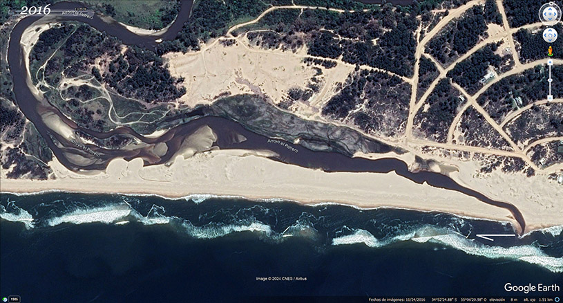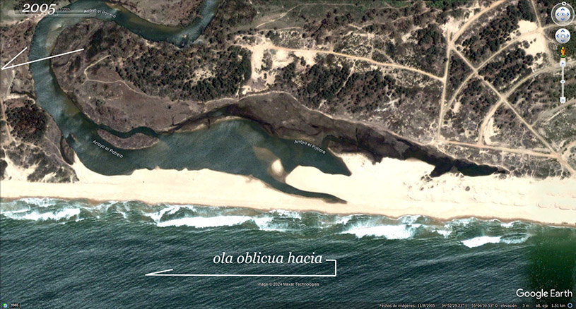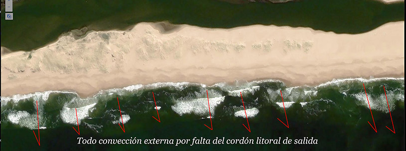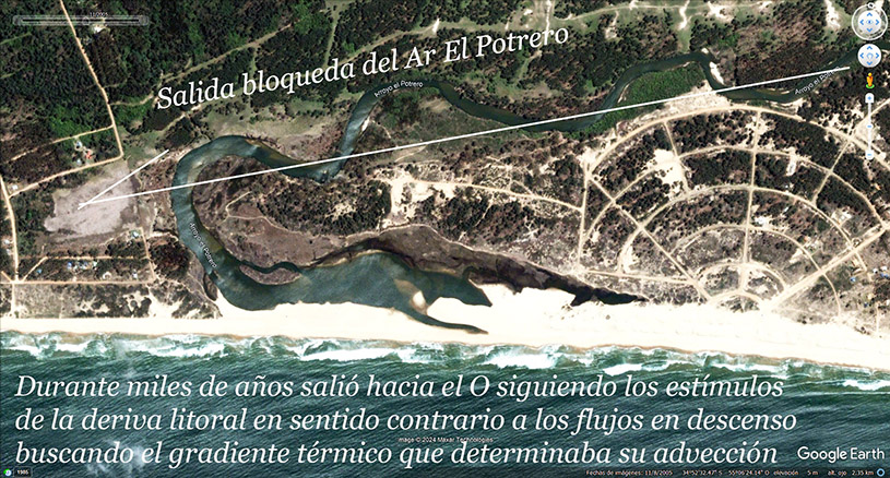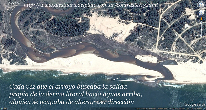 A fines de la década del 60 y principios del 70 se habían ocupado de desviar la dirección natural que esta salida venía exhibiendo durante miles de años. Siempre en dirección al Oeste, en sentido contrario a las aguas en descenso, en función de la deriva litoral que aprecia estas tributaciones en un ancho de 150a 180 mts de ancho, que no sólo se ocupan de hospedar la tributación, sino que se ocupan de bordar los sucesivos cordones litorales que dan lugar a las acreencias territoriales; en este caso, de playas. Hoy, en ausencia de deriva litoral, todo es convexión externa con permanente robo de playas.
