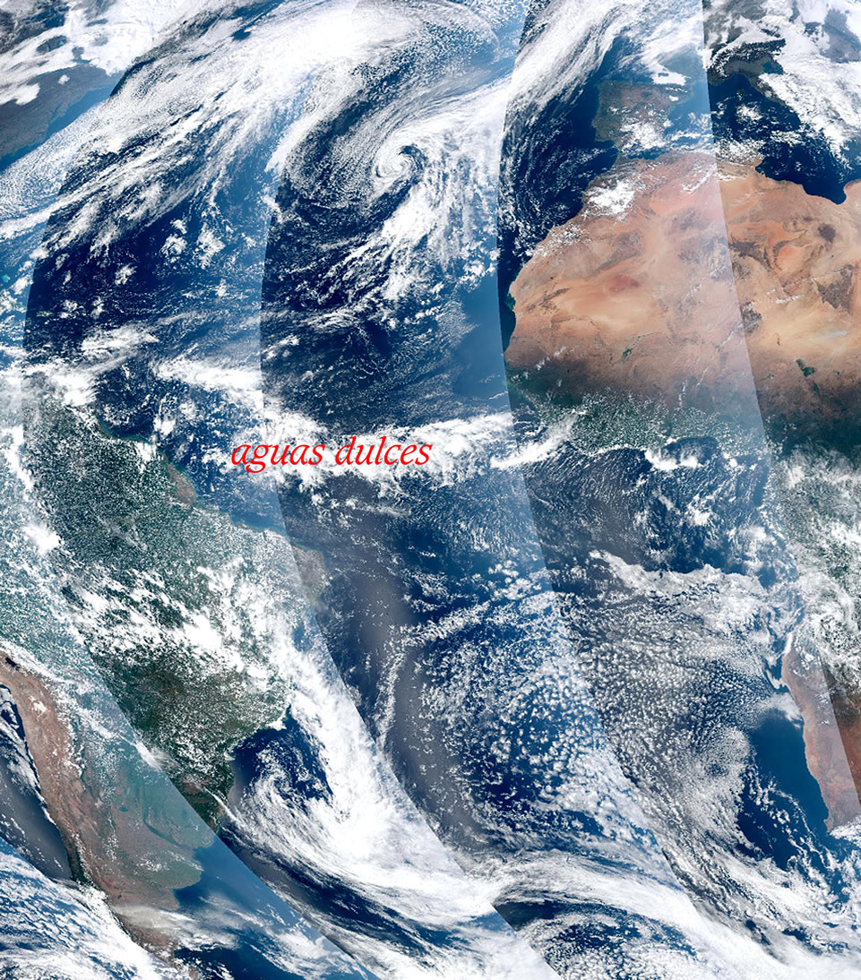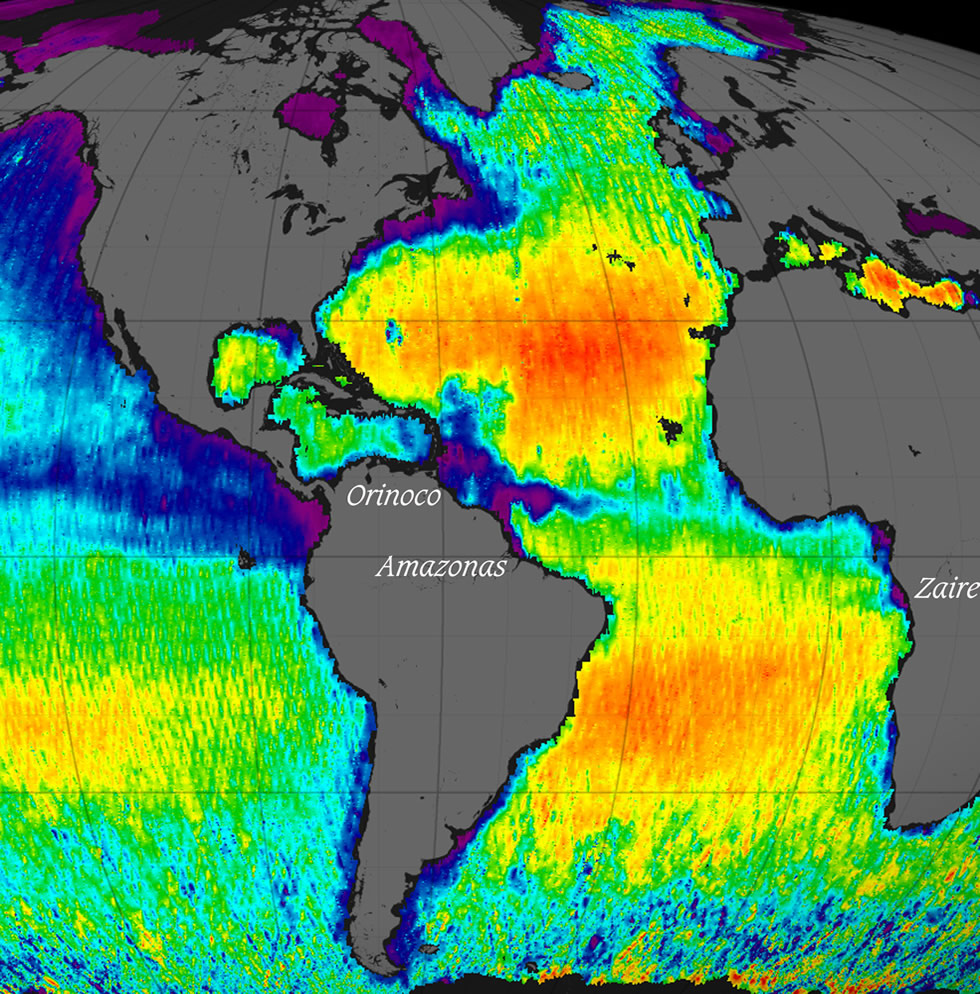 El río Zaire, el único que advierto con un mix de energías convectivas y gravitacionales, hace algo parecido pero batiendo récords de inmersión a un régimen de 15 m por Km hasta los 1900 m de profundidad, manteniendo limpia la fosa de descarga en todo su recorrido; que no sabemos, reitero, dónde termina. Y no son aguas saladas las que realizan esta tarea, sino dulces que al parecer no son tan livianas ni quieren abandonar tan fácilmente su personalidad mezclándose con las saladas. Vuelvo a repetir, hablar de estratificación no es suficiente; hay mucho mayor misterio para develar y esta tarea comienza por acopio de imagen fenomenal. Los trabajos de seguimiento de estas estratificaciones que mentan son tan numerosos como pobres en criterios termodinámicos y la columna vertical suele estar muy mal representada. Veremos estos temas con más detalle un poco más adelante. La imagen que sigue pertenece al Aquarius dando cuenta de las enormes distancias que a nivel superficial descubren el Amazonas y el Zaire en la pertenencia atlántica de sus aguas dulces, aún sin decir una sola palabra de la profundidad a la que marchan; que por supuesto, no queda resuelta por las lecturas superficiales del Aquarius.