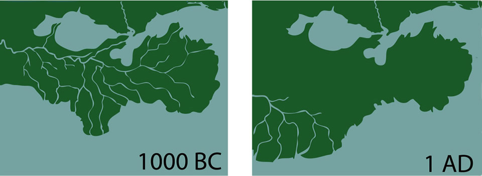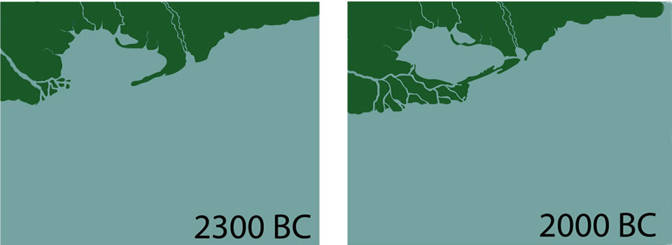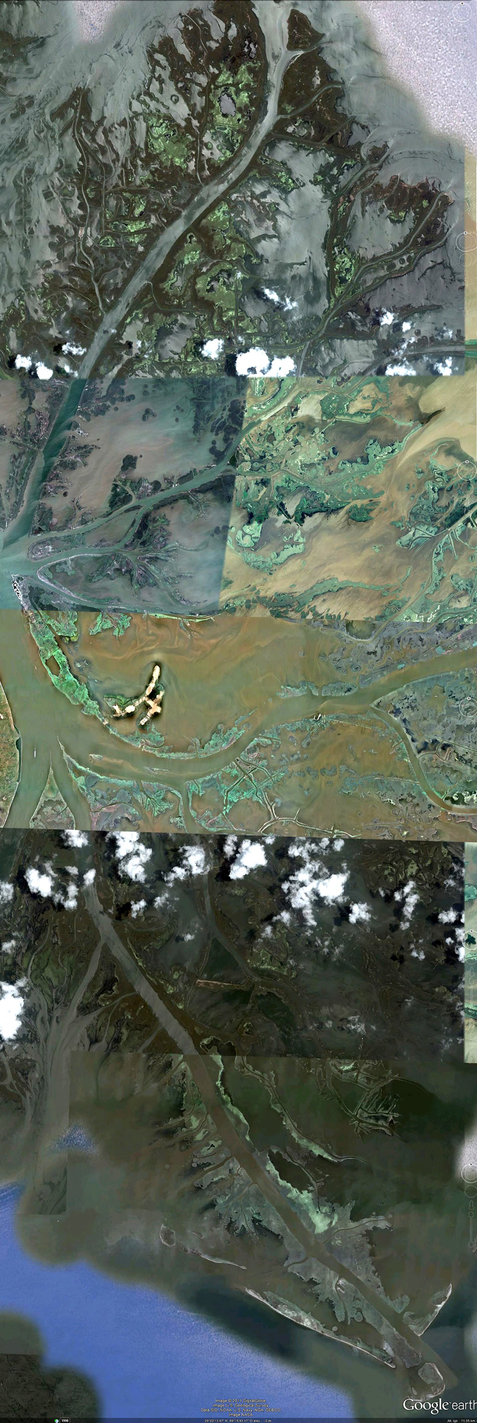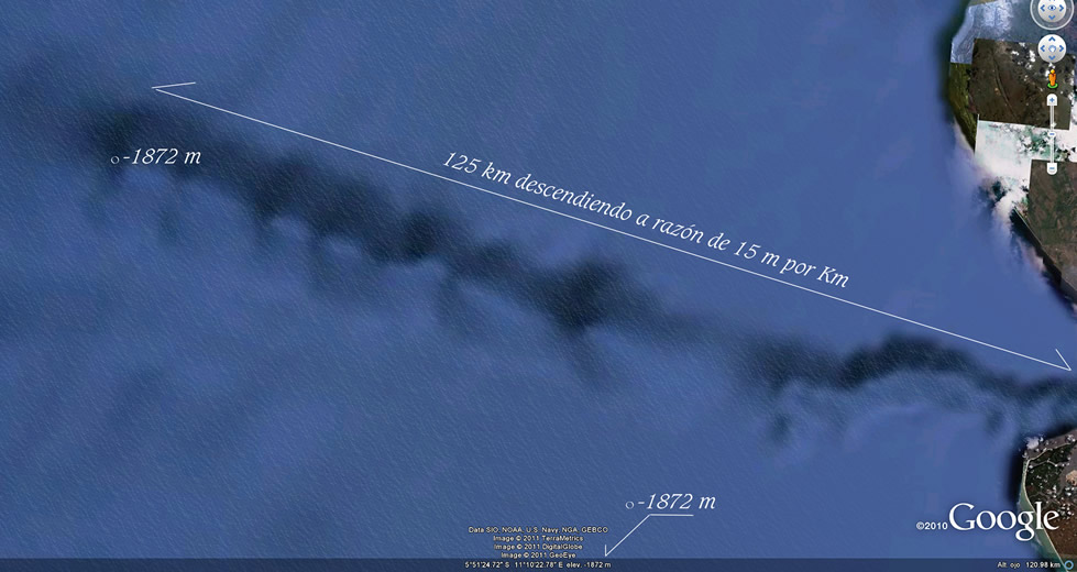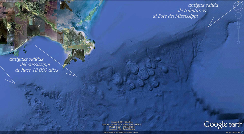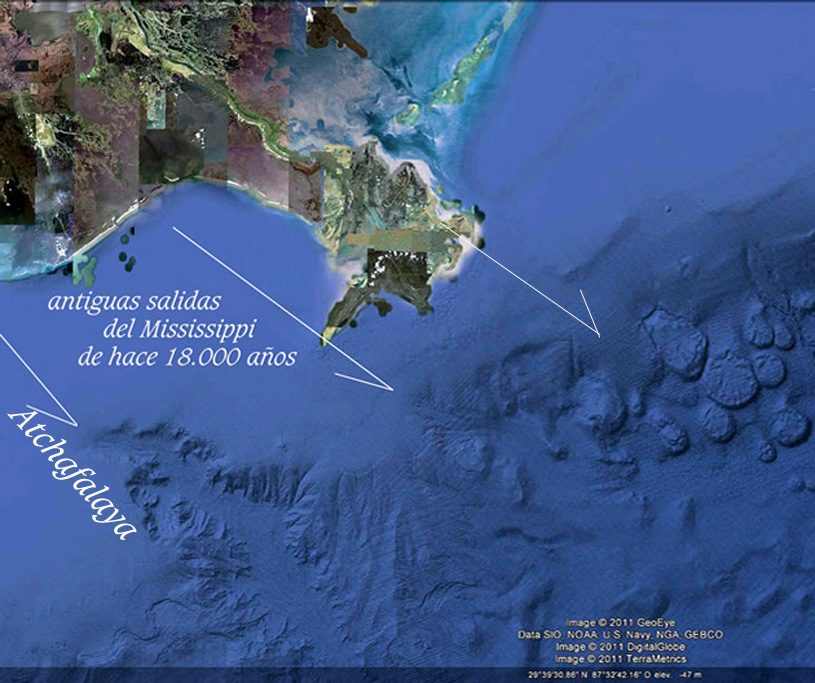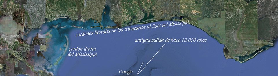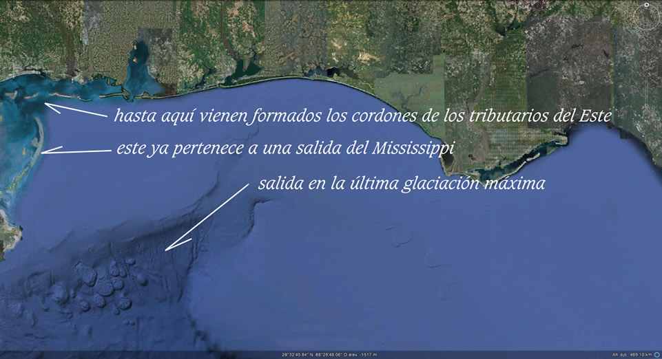 El desvío hacia el Este que muestra la imagen 2300BC buscando el encuentro con el cordón litoral que viene marchando de Este a Oeste, me resulta propio de quien ignora la deriva litoral y los procesos sedimentarios por capa límite térmica. Por ello desacredito que este encierro del lago haya sido como lo plantea el gráfico del 2000BC. Si hubo tal sedimentación como la que muestran los gráficos del 1000BC y 1AD, más la acredito a las energías de la deriva litoral marchando de Este a Oeste. A menos que lograran probar que la deriva litoral marchaba hacia el Este, en dirección contraria a la actual y todos los cordones litorales hacia el Este hubieran sido bordados por los sedimentos del Mississippi y no de los ríos Choctawhatchee, Appalachicola y otros tributarios al Este del Mississippi; cuya actividad hace 18.000 años quedó acreditada por el gigantesco cono submarino de eyecciones que muestran la imágenes que siguen a estos gráficos Los gráficos que siguen ya muestran los famosas compactaciones o robos de suelos deltarios acreditados a váya a saber qué historia ajena a la condición de formidable batería convectiva que se generó en esos encierros del Breton y Chandeleur Sound enfrentando las caldas aguas de la deriva litoral, que por entonces sólo tenían que ponerse de acuerdo para escapar de ellos llevándose la gran carga sedimentaria que ellos acreditan alguna vez estuvo allí. El trabajo de los flujos convectivos barriendo fondos es al parecer desconocido para estos cronosedimentólogos. Todo el cordón litoral del actual Mississippi Sound fue forjado por la deriva litoral que hasta el día de hoy viene del Este. Hace 18.000 años conservaba la misma dirección. Y eso lo prueba, reitero, el cono hoy sumergido de descarga en el talud oceánico que acabamos de mostrar en la imagen anterior. Mirando por los conos sumergidos de descarga de hace 18.000 años, del Mississippi y el Atchafalaya, comprobamos que salían directos y sin vueltas. Ningún desvío hacia el Este parece inferible como apunta el cronosedimentólogo en los gráficos del 1000BC y 1AD . . . . . Al subir los océanos comenzaron a bordar los cordones litorales responsables de todas las acreencias al Este del Mississippi, que no responden a este, sino a los ya citados Choctawhatchee, Appalachicola, Amarillo y otros. La falta de enlaces termodinámicos con los flujos de la deriva litoral provoca la salida enfrentada de los dedos al Este de la pata de gallo que así forman los cordones externos al Breton y Chandeleur Sound. El cordón externo al Mississippi Sound no me parece originado por los sedimentos del Mississippi, sino del Choctawhatchee, Appalachicola y Amarillo. Me sorprende reitero, no haber visto un sólo estudio de deriva litoral, ni de los destinos de las eyecciones sedimentarias en los conos submarinos. Las antiguas salidas del Mississippi se muestran en estos conos submarinos relacionados con salidas del Mississippi por los bajos del Atchafalaya y del Terrebonne. Por ello, me cuesta aceptar las proyecciones graficadas que no reconocen este soporte grabado a fuego en el fondo de la plataforma continental y en el propio talud oceánico.