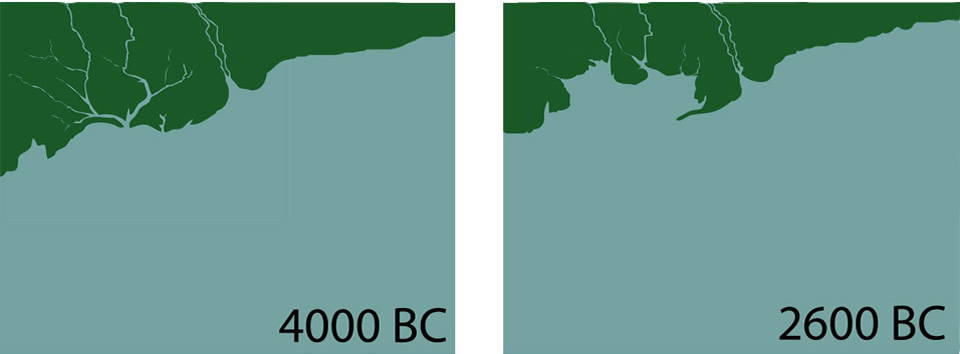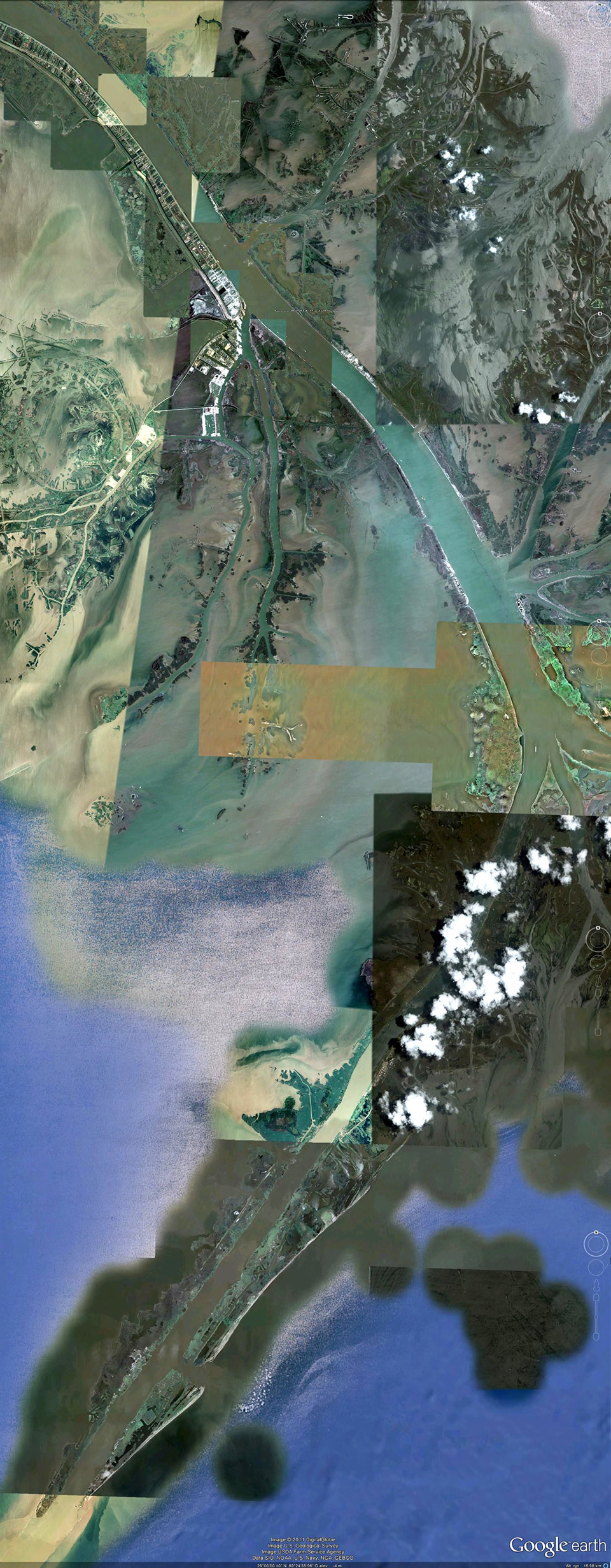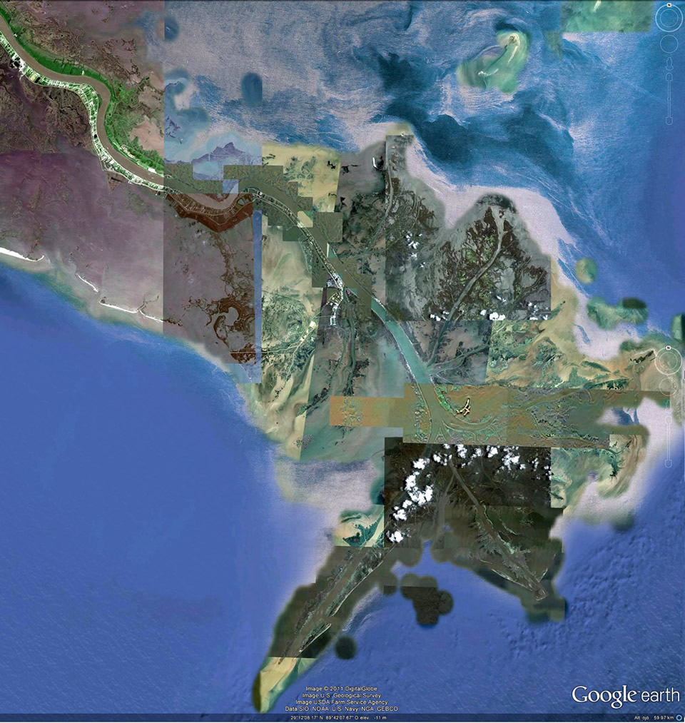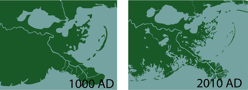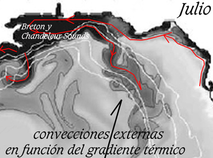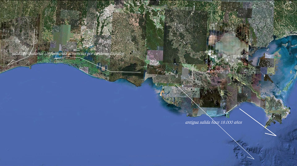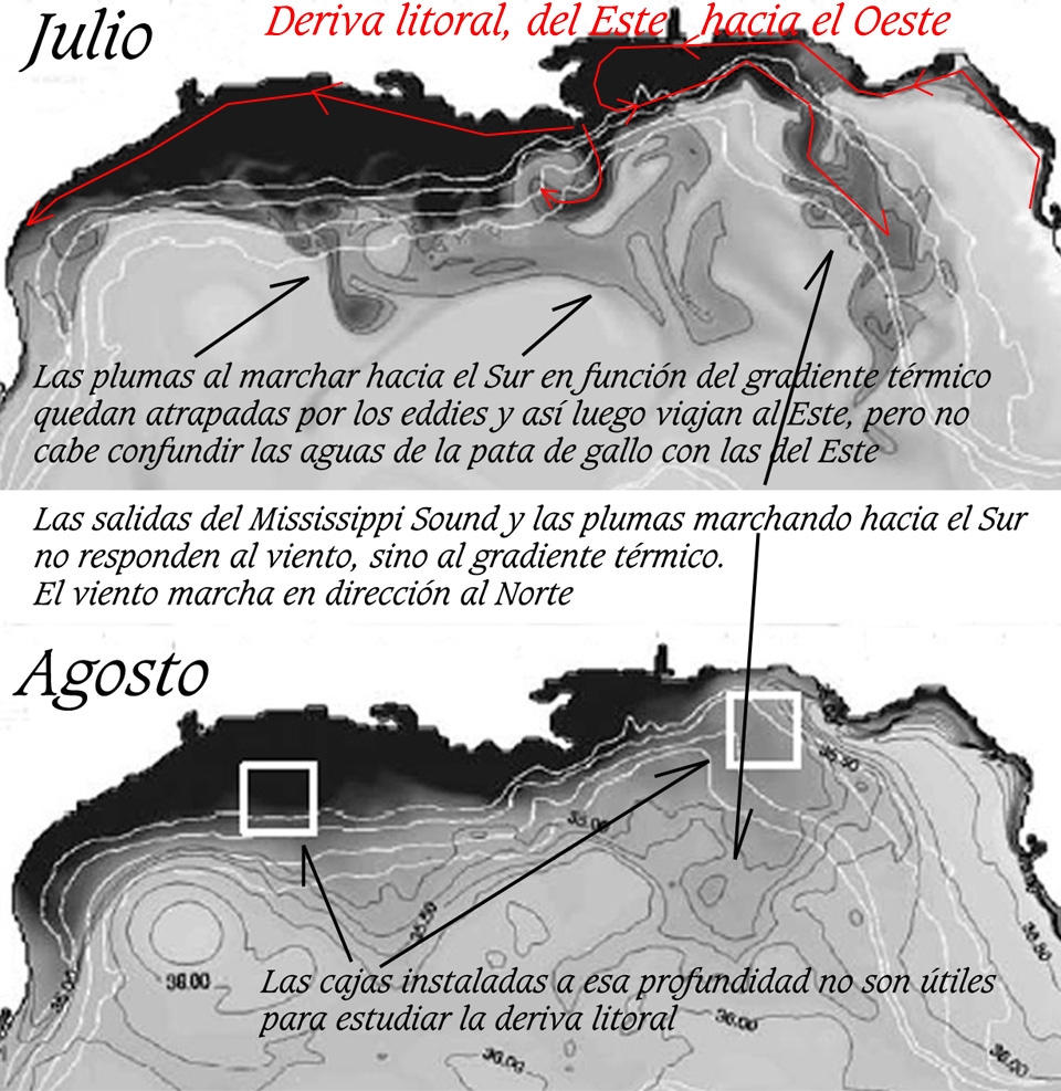 De nuestra opinión La falta de conocimiento de los enlaces termodinámicos entre ecosistemas tributarios y estuariales; merced a la deriva litoral; entre la capa límite térmica que acompaña al tributario a su salida y la correspondencia con el bordado de delicados cordones litorales de borde cuspidado, que tanto cuidan estas ordenadas salidas, como la ordenada deposición sedimentaria resultantes de las acreencias territoriales; la falta de reconocimiento de los procesos erosivos provocados por las convecciones externas; al igual que el desconocimiento de la función que como baterías convectivas aportan las áreas aledañas y la necesidad de los bordes lábiles y las costas blandas para permitir la transferencia de sus energías a las sangrías mayores que con ellas marchan; todos estos abismos elementales apreciamos transitar y contrastar. Los gráficos que siguen a continuación son fruto del imaginario mecanicista apoyado en la manzana de Newton y en la ola oblicua supuestamente responsable de la deriva litoral; que como poco han estudiado, bien poco la proyectan en estas estimaciones de cronosedimentología graficadas. Sorprende no hayan advertido los conos de deposición sedimentaria más allá de la plataforma continental y ya en el talud continental que mucho les alertaría de las antiguas salidas hace 18.000 años y la no poca influencia de los flujos de los tributarios al Este de la cuenca del Mississippi y sus propias salidas por los Breton y Chandeleur Sounds. Tampoco advertimos reconocimiento de los distintos orígenes de las acreencias por cordones litorales que acompañan al Breton y Chandeleur Sounds, de aquellos otros que acompañan al Mississippi Sound. Los conflictos vectoriales allí planteados por el desencuentro entre la deriva litoral que viene del Este y los flujos que vemos hoy saliendo desde la pata de gallo hacia el Este, nos permiten inferir que esos desencuentros y consiguientes sedimentaciones que esos gráficos proponen, quedaron resueltos como hoy muestra la realidad del lugar, generando encierros tan generadores de acumulación de calor, que dieron lugar al arranque de formidables energías convectivas capaces de volver a hacerse cargo de esos depósitos y llevarlos a continuar su marcha hacia el Oeste enlazando la deriva litoral a uno y otro lado de la inoportuna pata de gallo. Si ellos mismos hoy se asociaran con la deriva litoral encontrarían un aliado insospechado para favorecer más ricos y ordenados transportes sedimentarios Las mentadas compactaciones de suelo y enormes pérdidas de delta que acreditan, a mi parecer responden a la conformación de tan grandes baterías convectivas, inmediatas y externas al delta visible, que resuelven todo el impase que plantea la emergencia de la pata de gallo en medio de los senderos propios de la deriva litoral que quiso el destino marchara de Este a Oeste. Uso la expresión "destino" para no detenerme a analizar las razones de estas direcciones.