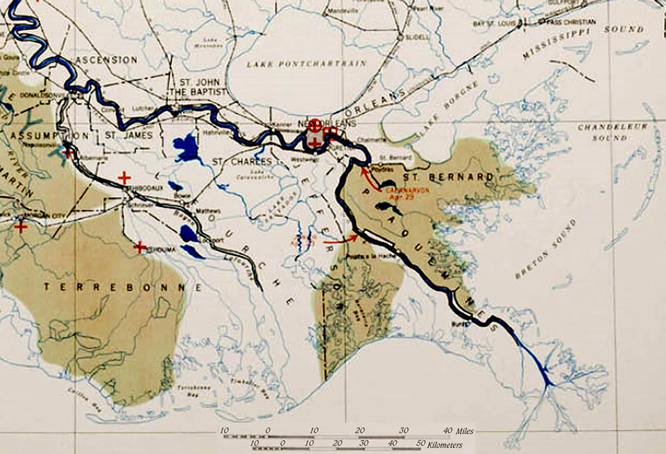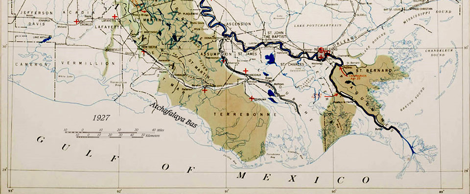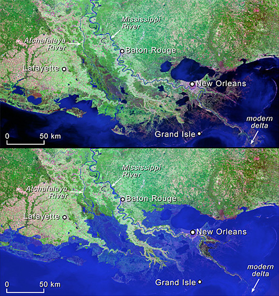 Por ser compilación de diferentes trabajos estas miradas vuelven reiteradas. De todas maneras, aunque hablan de las mil intervenciones humanas, algunas veces confiesan y otras soslayan sus consecuencias. La descarga del río Mississippi contiene niveles altos de nutrientes, tales como nitrógeno, fósforo y sílice; parte de ellos son naturales pero muchos derivan de la amplia utilización de fertilizantes en tierras de cultivo que drenan al Mississippi y por último al Golfo de México. Como en el caso de los fertilizantes que se aplican a los pastos y granos, estos nutrientes estimulan el crecimiento del fitoplancton (plantas microscópicas o algas) en las aguas superficiales del golfo. Estas plantas microscópicas sustentan a su vez al resto de la cadena alimenticia marina. Sin embargo, cuando estas plantas mueren y llegan al fondo, la descomposición natural de este material orgánico despoja a las aguas profundas del golfo del poco oxígeno que pudieran contener. En las cuatro últimas décadas, la cantidad de nitrógeno transportada por la cuenca del Mississippi se ha triplicado. Las algas producen en la actualidad más carbono del que producían históricamente y las condiciones de agotamiento de oxígeno han empeorado. El curso inferior (Lower Mississippi River) discurre al sur de la confluencia con el Missouri. El Misisipi continúa su trayectoria hacia el sudeste y posteriormente hacia el sur después de la confluencia con el Arkansas. La llanura aluvial se caracteriza por numerosos meandros cargados de barro que multiplican por tres la longitud del curso. Se trata de un sector relativamente ancho, de pendiente suave hacia el golfo de México, dominado por terrazas aluviales poco elevadas. Las altitudes son poco considerables, en general unas decenas de metros por encima del nivel medio del mar. Aparte de los sectores desbrozados, subsisten las grandes zonas de pantano y de bosques. También encontramos numerosos lagos de herradura y meandros de gran amplitud. En el sur de Cairo, la llanura aluvial se ensancha y se hace menos profunda a causa de la erosión de los lechos terciarios llamados bluffs. En el bajo Misisipi, numerosos afluentes discurren paralelamente al río a lo largo de una distancia bastante grande, antes de desembocar finalmente en el río. Al sur está sometido a un clima tropical marcado por los ciclones a finales del verano y principios de otoño. La helada invernal evita generalmente esta región. El paisaje se caracteriza por zonas húmedas y pantanosas, a menudo insalubres, en el delta del Misisipi y el bayou: se trata de brazos y de meandros abandonados por el río y que forman largas vías de agua estancada y constituyen una red navegable de varios millares de kilómetros. E l río Mississippi ha tenido decenas de deltas distintos a lo largo de millones de años, de hecho, en los recientes 5.000 años, el río cambió nueve veces de desembocadura. Desde el Estado de Illinois hasta la desembocadura actual, todo ese lecho de sedimentos es fruto de sucesivos deltas del río. Cuando se construyó un canal a principios del siglo XIX, el río buscó reunir el lecho y la desembocadura del río Atchafalaya, a 95 km al Oeste de Nueva Orleans. Así fue que el Mississippi abandonó su canal actual como un canal de escurrimiento de primaria, y migró a la Cuenca Atchafalaya. La cuenca Atchafalaya en torno a la llanura del río, está constituida de pantanos de cipreses calvos y marismas que aumentan las condiciones salobres y finalizan en hierbas pantanosas de Spartina, cerca de la desembocadura del golfo de México. Incluyen el Río Bajo Atchafalaya, Lago Wax Outlet, Bahía Atchafalaya, Río Atchafalaya, Pantano Chene, Pantano Boeuf y el canal navegable Black. La cuenca, que es susceptible de grandes inundaciones, está escasamente habitada. La cuenca tiene alrededor de 20 millas (32,18 km) de ancho (de este a oeste) y 150 millas (241,4016 km) de largo. Con 595.000 acres (2.407 km²), es el pantano natural más grande de la nación, que contiene importantes superficies de bosque de madera noble, pantanos, y lagos de aguas estancadas lakes. Las pocas carreteras que lo cruzan pasan por las cimas de los diques. La Interstate 10 que atraviesa la cuenca por medio de pilares elevados desde Maringouin, Louisiana a Henderson, pasa por un puente de 18.2 millas (29,29 Km) 30°21′50″N91°38′00″O / 30.36389, -91.633333. Geológicamente, Atchafalaya ha servido periódicamente como canal principal del río Mississippi mediante el proceso del cambio de delta, que ha formado la extensa llanura del delta del río. Desde comienzos del siglo XX, debido a las alteraciones artificiales del canal, el Mississippi ha tratado de cambiar su canal principal de Atchafalaya. Por ley, una proporción regulada del agua del Mississippi es desviada al Atchafalaya por la Estructura de Control Old River. El control de las inundaciones, junto con las del Mississippi, se ha convertido en una cuestión controversial en las recientes décadas. Se ha generalizado la sospecha de la canalización del río y la posterior disminución de las tasas de sedimentación se ha convertido en una grave degradación de las marismas que rodean los humedales, así como el aumento de pueblos sumergidos y tierras agrículas. La Inspección Geológica de los Estados Unidos (USGS) informa que alrededor de 29 millas cuadradas (75 kilómetros cuadrados) se pierde cada año. Las marismas costeras constituyen una zona de amortiguación que protege toda la costa de Luisiana frente a los huracanes del golfo de México y disipa las consecuentes marejadas ciclónicas. Los pantanos dependen de la reposición de los sedimentos depositados, que ahora se están depositando sobre el borde de las plataformas continentales, debido al flujo de canalización artificial del Mississippi. Desde 1950 hasta 1970, las industrias petroleras dragaron las profundidades de los pantanos para que lograran pasar los barcos hacia las plataforma