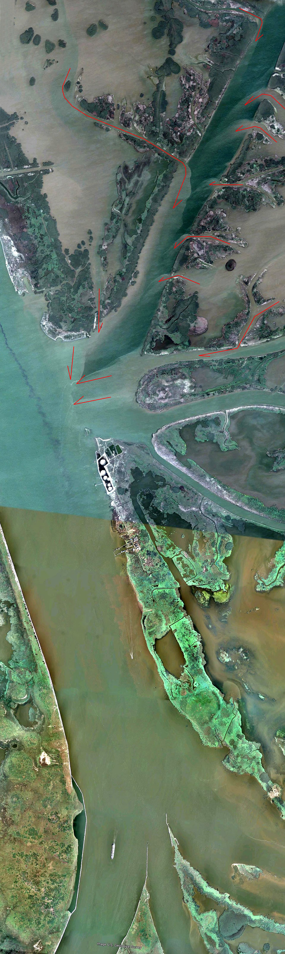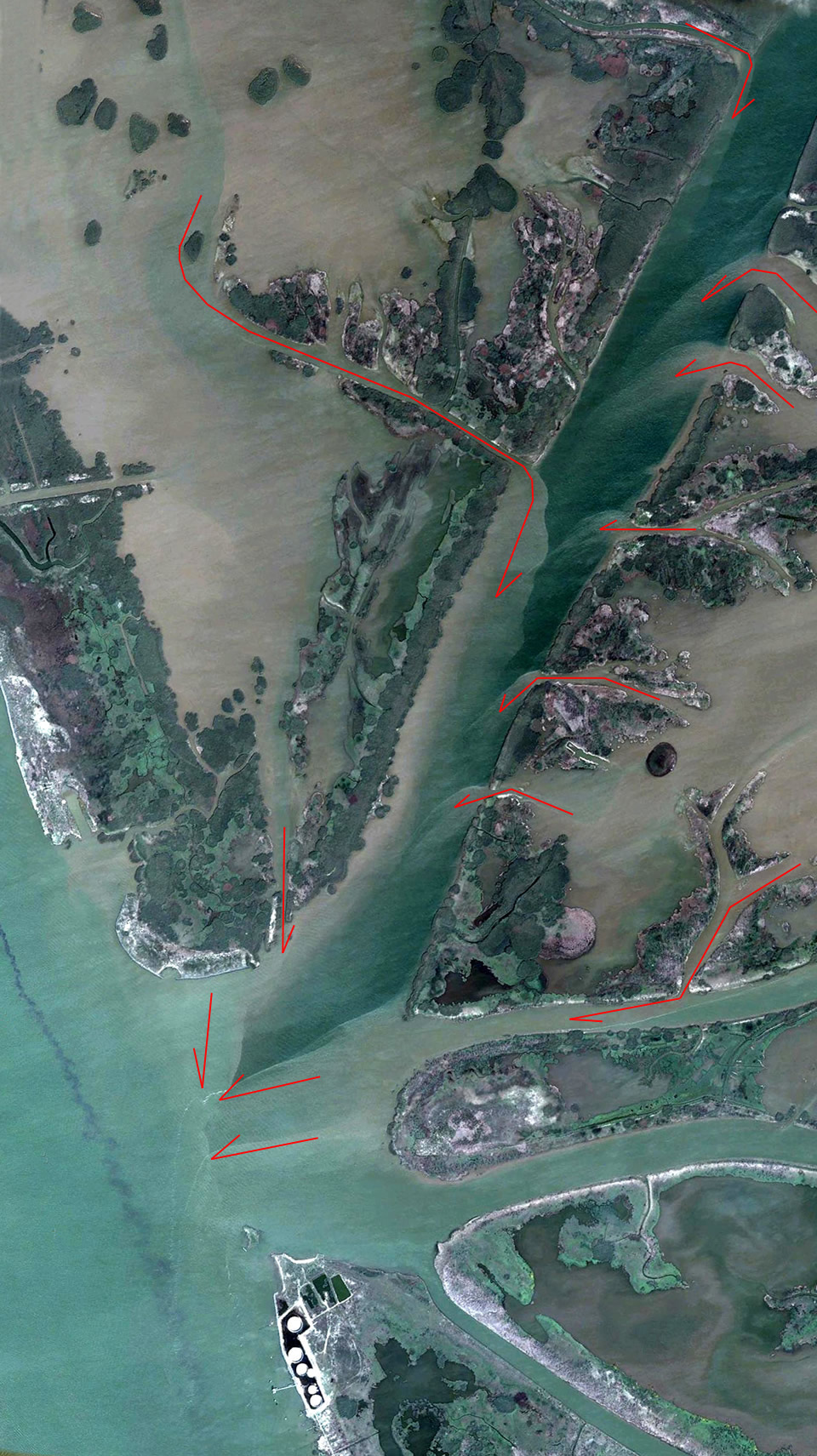 Estas sangrías, sin referir de bondades, son inconcebibles sin intervención humana. El transporte sedimentario alrededor de esta sangría mayor es desopilante y jamás habrá sido imaginado por ejército celestial alguno. Las dragas comandadas por mandinga planifican la fiesta de la mecánica de fluidos en esta pata del gallo. Sedimentos que estando depositados en la parte externa de la pata de gallo, vuelven a entrar en ella mediante recursos convectivos que se generan en el inmenso lodazal aledaño.