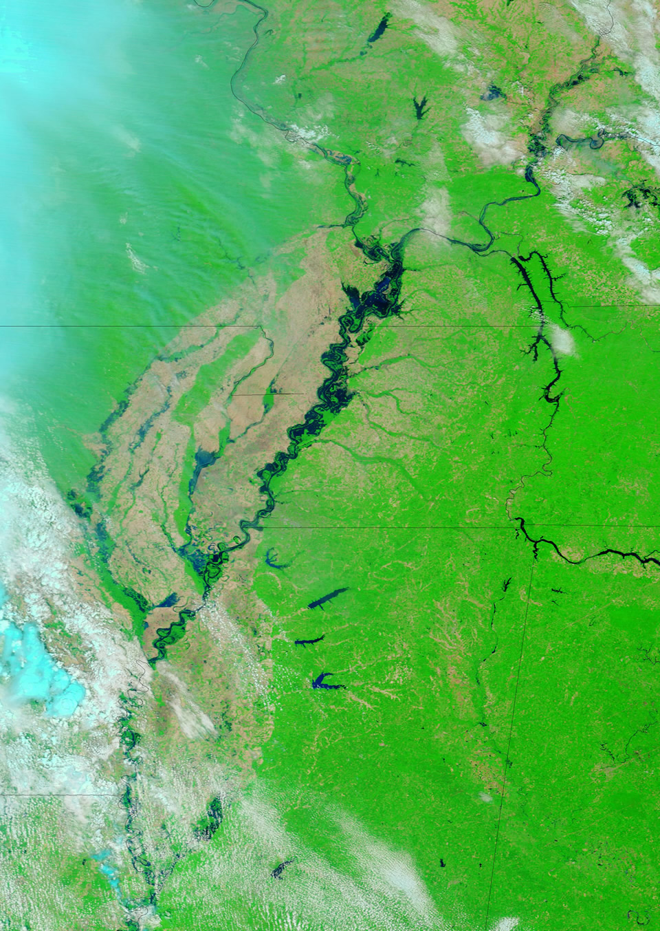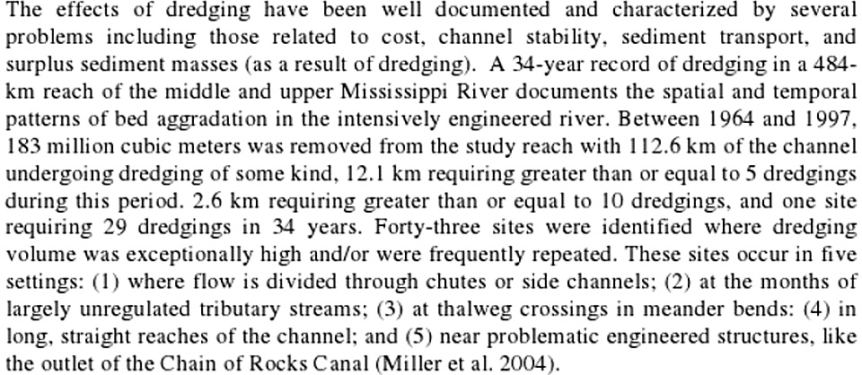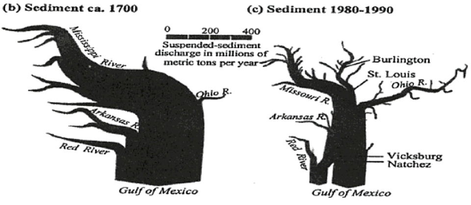El río Mississippi constituye el mayor río de América del Norte. Con una cuenca de 3.267 Km2 y una longitud de 3.730 Km, atraviesa el continente en sentido Norte-Sur desde el lago Itaska en Minnesota hasta Louisiana, donde se anastomosa y desemboca en el golfo de México. El Mississippi sufrió importantes modificaciones y alteraciones. En sus riberas se levantaron 3.500 Km de terraplenes que ocupan 12.300 Km2, 330 Km de espigones y 1.370 Km de empalizadas. Esto, directa o indirectamente favoreció la pérdida de humedales costeros, llanuras aluviales y la reducción de la intensidad de los pulsos de inundación. La rectificación del cauce, para favorecer la navegación, eliminó meandros y redujo 230 Km la longitud del río. Un 13 % de los 266 reservorios (de 2.500 a 12.000 Ha) que existen en la cuenca se localizan sobre el curso del Mississippi (West Consultants, 2000b). Tras un cuarto de milenio obrando extrapolaciones de la manzana de Newton, difícil, si no imposible resulta hallar una porción de la cuenca que haya conservado sus atributos originales. Cubriendo una superficie aprox de 75.000 Km2 con un ancho de aprox. 400 Km, el delta dicen que avanza aprox 100 m por año por efecto del transporte de entre 300 y 450 millones de toneladas de sedimentos, que así reclaman un dragado constante.