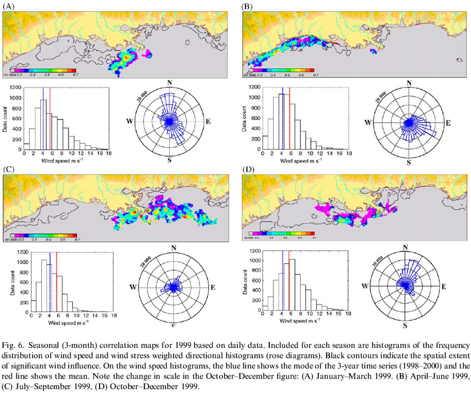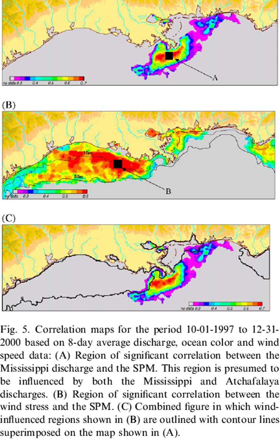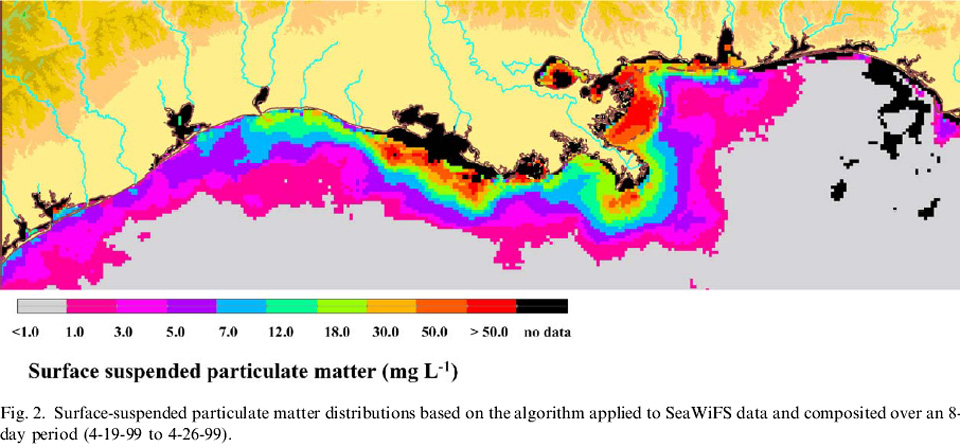 During the July–September 1999, time period (Fig. 6C), the DIR extended both to the east and west of the Mississippi delta, and was the largest in total area (4.74_104km2) of any season studied (Table 2). La falta de información de las aguas costaneras e interiores del Mississipi, Breton y Chandeleur Sonds, sumadas a las caldas aguas del Pontchartrain y Bourgne, me restan toda la información energética necesaria para evaluar la calidad de esta información, que en adición adolece de muy gruesa escala. Es justo en las aguas someras donde se cargan las energías convectivas, allí donde se ahorran mirada. No es el viento el que manda. Es el sol el que manda las aguas, las olas y el viento. Empiecen por el calor y verifiquen las disociaciones y el sentido de orden que estas últimas, por capa límite térmica, aportan a las precipitacines sedimentarias. This was a period of light average winds, modest discharge, and warm sea-surface temperatures —conditions that support stratification. As suggested by Walker (1996), stratification of the water column plays an important role in the way a plume responds to wind forcing. Specifically, under highly stratified conditions where little wind mixing occurs, a buoyant plume will spread horizontally and can be easily advected in the presence of light winds (Kudryavtsev and Soloviev,1989). The bi-directional orientation of the DIR can be partially explained by wind advection. Con esta palabra "estratificación" resuelven su orfandad en materia de capa límite térmica, hidroquímica, flujos convectivos internos positivos y senderos del agua dulce con respetable carga sedimentaria. Poca importancia aplican a mirar por la deriva litoral en las aguas someras ribereñas y la alta capacidad de transporte que tienen esas derivas. Tampoco en los temas sobre erosión disciernen entre convecciones internas y externas. Todo es mecánica medioeval. The plume waters were subjected to a bimodal wind regime with the primary mode coming from the west. It should be noted, however, that it is probable that an anticyclonic flow regime set up by the presence of warm core rings also influenced the flow. Sea-level anomaly maps supplied by the Naval Research Laboratory indicate the presence of a persistent positive anomaly directly south of the DIR during this time period. http://www7300.nrlssc.navy.mil/altimetry Velocities within such eddies can exceed 100 cm s_1 and thus an eddy may have been a mechanism by which particles and dissolved materials were transported offshore (Morey et al., 2003). An unexpected finding was the degree to which the DIRs and WIRs were spatially disjointed. This suggests the independence of the two particle influencing processes and demonstrates the lack of correlation between the discharge and wind data. La calidad de energías convectivas que cargan esas aguas permanece soslayada. Ni con brujerías en las modelaciones matemáticas resolverán esas faltas de correlación. Typically, variability in both the direction and intensity of the wind is dominated by the passage of seasonal cold fronts, that occur with a frequency of 3–7 days (Chuang and Wiseman, We performed several correlation analyses in which the SPM time series lagged the discharge. Lag analyses showed maximum correlations at _10–15 days in the offshore region. River waters transported this distance would require a _30 cm s_1 current, which is reasonable in the presence of a warm core eddy. Current speeds in excess of 4 knots (_200ms_1) have been reported in such eddies. For this study, the surface area of the seasonal DIR was apparently not a function of discharge, and indeed the largest DIR was associated with a low to modest discharge regime. In this respect, our study corroborates the finding of Walker(1996) that the Mississippi River plume responds differently to winds under varying conditions of buoyant stability. Although we had no knowledge of the actual status of buoyant stability, riverine discharge and high sea surface temperatures suggest stratified conditions. If these conditions are accompanied by light winds that do not break down the stratification, the plume can spread with little resistance (Kudryavtsev and Soloviev, 1989). WIRs were generally constrained to shallow waters with the seaward extent of the largest nearly reaching the 100m contour. We believe WIRs are initially formed by wind generated resuspension processes that occur only in shallow waters, and as such, there was less spatial variability displayed by the WIRs compared to the DIRs. La traducción de las energías solares en baterías y flujos convectivos sigue siendo ignorada. Todos los supuestos modelados van por vía mecánica con cero mirada al recurso y enlaces termodinámicos. Much work is also required to resolve vertical particle distributions and to determine the relationship, if any, between surface concentrations and the particle mass within the water column. Mirar la columna de agua sin discernir la calidad de los flujos verticales propios de las energías convectivas presentes, es ignorar lo elemental. La mecánica y la ciencia marchan como ciegos incapaces de mirar por sistemas naturales olárquicos abiertos. Querer resolver esa ceguera con extrapolaciones matemáticas es asegurarla. Hoy no es dable modelizar estas fenomenologías, pero sí observarlas.
