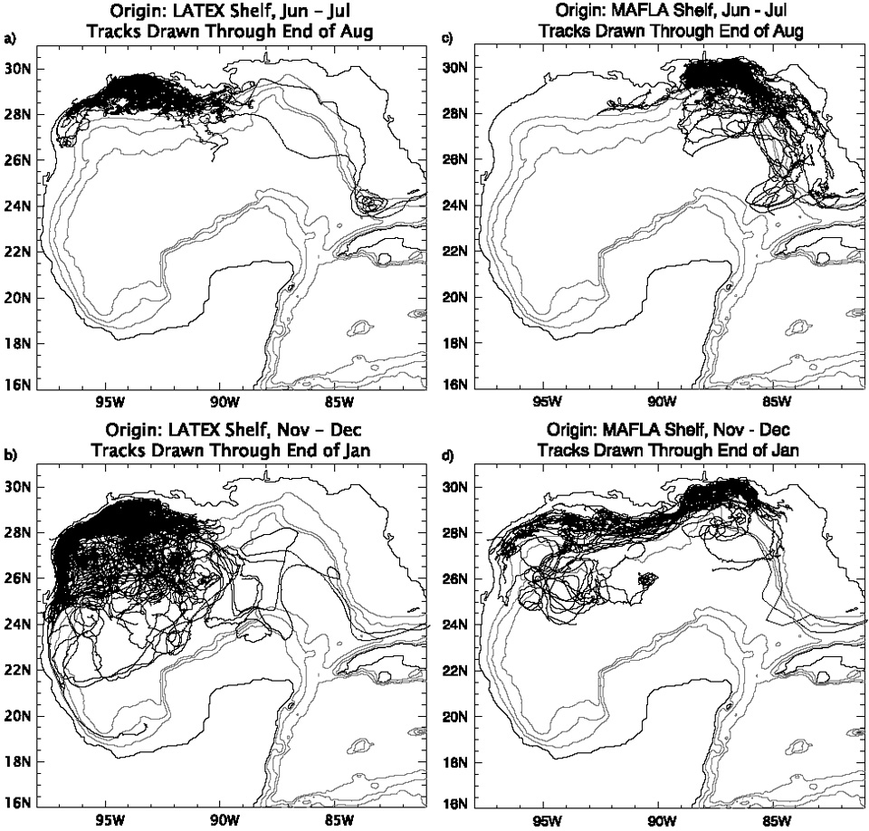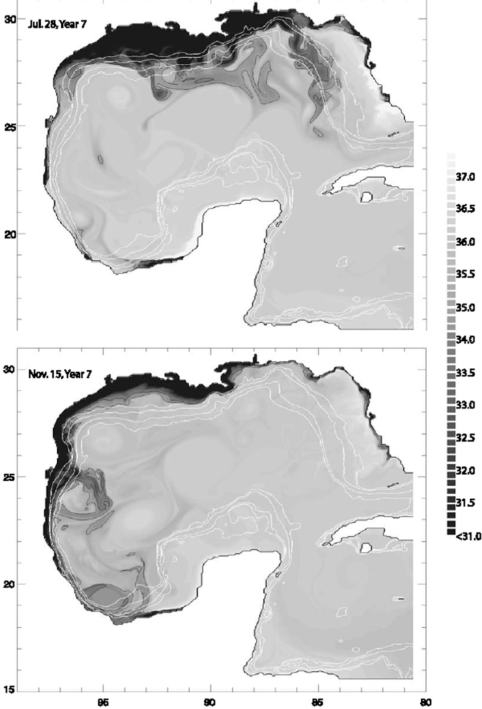 Figure 5. NCOM surface layer salinity from arbitrarily selected output records in the summer and late fall. The 34 and 35 PSU salinity contours are drawn, as are the 50-m, 200-m, 500-m, and 1000 m isobaths. Es curioso cómo soslayan la deriva litoral y cómo infieren que las salidas del Este pertenecem al Mississippi y no a las aguas que fluyen del Mississippi Sound, de los lagos Pontchartrain y Bourgne y de la deriva litoral que viene del Apalachicola; que por menor enrgía convectiva encuentra un gradiente que modifica su advección y marcha hacia el Sur. Los vientos en Julio soplan hacia el Norte y sin embargo la advección marcha en sentido contrario. Reitero, la advección está determinada por el gradiente térmico y no por el viento. . . . . .