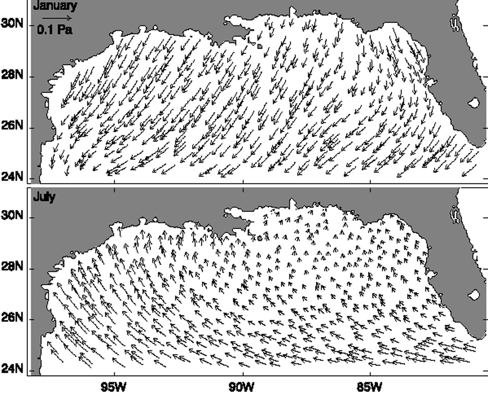 Figure 9. Trajectories for combined LATEX, SCULP I, and SCULP II 1-m drogued drifters. (a) Drifters existing within the defined LATEX shelf region in the summer months. (b) Drifters existing within the defined LATEX shelf region in the winter months. (c) Drifters existing within the defined MAFLA shelf region in the summer. (d) Drifters existing within the defined MAFLA shelf region in the winter. The 200-m, 1000-m, and 2000-m isobaths are drawn, shown by the shaded contour lines. Confunden las salidas mezclando todo. El 2º gráfico del MAFLA de Junio y Julio refiere de las aguas del Mississippi Sound, los lagos Pontchartrain y Bourgne y los tributarios vecinos al Apalachicola, que nada tienen que ver con la pata de gallo y el Atchafalaya; a excepción de las salidas al Breton y Chandeleur Sounds que por gradiente térmico se relacionan con el Mississippi Sound y estos con las caldas aguas del Pontchartrain y el Bourgne. El gráfico que sigue lo explica mejor. Repito, las cajas están instaladas a una profundidad y distancia de la costa que resulta imposible estudiar la deriva litoral y sus originales energías. [38] The model can provide insight into the cause of the seasonal reversal of transport in the northern GoM. The only seasonally varying forcing functions in the model are river discharge rates (in only one experiment), surface wind stress, and surface heat flux. The reversing current near the coast could possibly be wind driven or density driven. A density-driven current, however, would flow in the direction with less dense water to the right. Thus a density-driven westward/southward current on the LATEX shelf and along the Mexican coastline during the winter could be explained by a reduction of the density along the coast. However, the coastal waters are actually cooling faster than the offshore waters at this time of year, so the seasonal variability of heat flux is not the cause. Additionally, the current forms in both experiments with and without seasonally varying fresh water input, and the formation of the coastally attached current, occurs just following the climatological minimum of river discharge in the northern GoM. Thus seasonal variability of fresh water input along the coast is not responsible. This leaves the seasonal shift in the climatological wind direction over the northern GoM from southeasterly in the spring and summer to northeasterly in the fall and winter as the mechanism responsible for the seasonally reversing transport. [39] During the spring and summer months, as the surface water warms in the northern GoM, the water column becomes highly stratified, particularly in the region capped with the low-salinity water formed by river discharge. The salinity sections discussed previously (Figure 6) show a very stratified water column to the east of the Mississippi Delta in the summer. To the east of the Mississippi Delta, the shelf is relatively narrow and the low salinity water spreads toward the deep De Soto Canyon. Here, the low-salinity water can interact with the open ocean energetic mesoscale eddy field. Cyclones and anticyclones intruding into the De Soto Canyon can entrain this buoyant low-salinity water found near the shelf edge and transport it offshore as jets of low-salinity water (Figure 5) [Morey et al., 2003]. [40] In September, and continuing through the winter, the winds in the northern Gulf become easterly shifting to northeasterly and northerly in the northern GoM, consistent with a westward/southward coastal current (Figure 13). Over the northern Gulf, the winds become more variable during the fall and winter as the weather patterns are dominated by the passages of cold fronts. The strong northerly winds behind these fronts have the greatest influence on the wind climatology. Thus the westward/ southward coastal transport actually occurs in an episodic nature coincident with these northerly wind events. It is likely that the smooth climatological winds may actually cause the model to underpredict the strength of this western export pathway. Similarly, occasional tropical storms in the region during the summer will also alter the export pathways during the events, but are likely so occasional so as not to significantly alter the climatological behavior of the pathways. Nevertheless, the strong consistency between the ocean model forced by climatological fields and the observational data presented here demonstrates the robustness of the description of the fresh water export pathways in the northern GoM. Figure 13. Monthly climatology wind stress derived from COADS [Da Silva, 1994] for (top) January and (bottom) July.