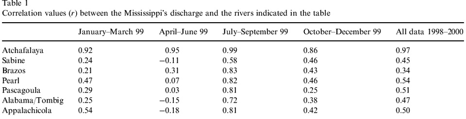 The maximum and minimum salinity values computed from boat measurements during the tidal study at this site were 9.2 and 0.4 ppt, respectively (fig. 6). The maximum and minimum salinity values recorded by the continuous gage during the tidal study were 11.0 and 0.4 ppt, respectively (fig. 6). The average measured and recorded salinity values were 4.0 and 4.6 ppt, respectively. Specific conductance and salinity values measured from the boat were consistently less than those values recorded by the gage because the gage measurement point was several feet deeper in the water column. This site was significantly influenced by freshwater flow from upstream runoff in the PearlRiver Basin during the ebb tide cycle. The U.S. Geological Survey, in cooperation with NAVOCEANO, is collecting data on the quantity and quality of water in the lower Pearl River and Lake Pontchartrain estuaries of Mississippi and Louisiana. Continuous stage, velocity, water temperature, specific conductance and salinity data, as well as other channel characteristics have been collected, processed, and computed since October 2001 at three USGS continuous recording streamgages in the lower Pearl River and Lake Pontchartrain estuaries in Mississippi and Louisiana. A tidal study to measure hydraulic and hydrologic parameters was completed on September 13-14, 2001. The tidal study provided data to correlate continuously recorded surface-water and water-quality data at the three gages and to construct a means of computing continuous discharge at these sites. Analysis of the data provides stage/discharge information through time at these three gages, as well as a variety of other characteristics of the lower river reaches of the Pearl River and Lake Pontchartrain Basins. Salinity computed by using data collected by the water-quality monitors installed at the gages was generally higher than salinity measured discretely from boats during the tidal study. Preliminary analysis indicates that salinity data obtained from the USGS monitoring and sampling program on the Mississippi Gulf Coast correlate well with the data obtained from the laboratory analysis for the normal ranges of salinity. However, limited data for periods of low salinity and point sampling of salinity do not accurately define salinity decreases due to freshwater influence or adequately provide a method to measure average salinity for the entire depth of the water column. http://www.sciencedirect.com/science/article/pii/0278434395000569 Transport of anomalous low-salinity waters from the Mississippi River flood of 1993 to the Straits of Florida Paula S. Gilbert*, Thomas N. Lee*, Guillermo P. Podesta* Division of Meteorology and Physical Oceanography, Rosenstiel School of Marine and Atmospheric Science, University of Miami, Miami, Florida ,U.S.A. September 1994. Abstract Recent field studies in the southern Straits of Florida revealed the existence of Mississippi River outflow embedded in the Florida Current and adjacent coastal waters. Surface thermosalinograph measurements for the period of 10–13 September 1993 indicated a band of low-salinity water measuring approximately 40 km wide and 30 m in depth extending from south of Key West to Miami, a distance of 260 km. Surface salinity values as low as 31 psu were found. The estimated volume of the band is approximately 33.3 × 1010 m3 for the Key West to Miami region, thereby requiring roughly 1.2 × 1010 m3 of fresh water to mix with oceanic waters to produce this low-salinity band. The only nearby, dynamically viable, source for such a large volume of fresh water is the Mississippi River during its flood stage in 1993. La falta de experiencia sobre los tránsitos bien disociados de los corredores dulces, incluso barriendo los fondos por debajo de las aguas saladas, les hace caer en estas deducciones de que sólo las aguas del Mississippi generarían tal impronta. Si estudiaran los tránsitos de la deriva litoral alcanzarían más ricas advertencias. The proposed transport mechanism for the transport of flood waters from the shelf in the northeastern Gulf of Mexico to the Straits of Florida is via the Loop Current through entrainment. Salinity records from offshore C-MAN towers indicate that the low-salinity band persisted off the lower Florida Keys for approximately 3 months. The variability in the flow field in the southern Straits occurs in a 30–70 day band due to the meandering of the Florida Current and the subsequent formation, and propagation, of cyclonic gyres off the Dry Tortugas. This variability in the flow field had a clear affect on the evolution of the low-salinity band, as observed by the salinity records from the C-MAN towers. Because the band traveled as a lens in the upper 30 m of the water column and because its evolution was highly dependent on the variability within the Gulf Stream System, it was a good indicator of the mixing and exchange of offshore waters with shallow waters of the Florida reef tract and Florida Bay. Las aguas del Apalachicola y sus vecinos al Este marchan todos hacia el Oeste montados sobre la deriva litoral hasta las salidas de Mississippi Sound, los lagos Pontchartrain y Bourgne y las salidas del Breton y Chandeleur Sounds. A partir de Julio encuentran un gradiente térmico que les invita a montarse en los eddies vecinos para luego pegar el giro al Este. Pero a no confundir las aguas del resto de la pata de gallo y del Achafalaya que marchan hacia el Oeste montados en la deriva litoral. No he observado en ningún momento en toda la costa Norte del Golfo una pérdida de rumbo de la deriva litoral siguiendo siempre su marcha del Este hacia el Oeste. A no confundir con los rumbos que luego toman esos flujos convectivos al ser atrapados por gradientes térmicos apropiados y corrientes mayores que por convecciones externas los apropian de la deriva litoral. On the seasonal correlation of surface particle fields with wind stress and Mississippi discharge in the northern Gulf of