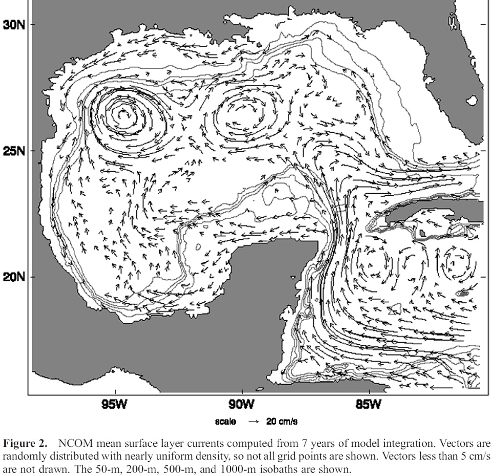 Conclusions [41] A new primitive equation ocean model has been described and applied to simulate the GoM ocean circulation. This numerical simulation, along with new calculations using existing observational data, have been used to determine the eventual fate of fresh water discharged by rivers in the northern Gulf. The export pathways, and their seasonal variability, for river discharged fresh water have been determined through the analysis of surface drifter data and numerical experiments. The seasonal reversal of the wind driven transport from westward in the fall and winter to eastward during the spring and summer shifts the locations of the export pathways. [42] Analyses of surface drifters, and previous works [Ohlmann et al., 2001], have shown the preferential locations for cross-shelf transport in the northern GoM. However, because of the seasonally shifting along-shelf transport of low-salinity water, not all cross-shelf transport results in fresh water export. The results of this study show that the export pathway during the late fall and winter consists of a westward/southward flowing coastal jet. It is likely that the fresh water exported as part of this jet is eventually transported across the shelf through entrainment into jets associated with deep water eddies south of the study region along the narrow Mexican shelf [Zavala-Hidalgo et al., 2003b]. In the spring through summer, the buoyant low salinity water is transported to the east where it finds its way out of the domain across the MAFLA shelf near the De Soto Canyon, again through interaction with the mesoscale eddy field of the Gulf. Todas las conclusiones de Julio y Agosto son erradas. El viento marcha en dirección al Norte y las convecciones marchan, primero en función de un gradiente térmico hacia el Sur, para quedar luego atrapadas por los eddies que las llevan hacia el Este. Este trabajo concluye en laboriosa prueba prisionera de cosmovisión mecánica. Francisco Javier de Amorrortu, 30 de Diciembre del 2011