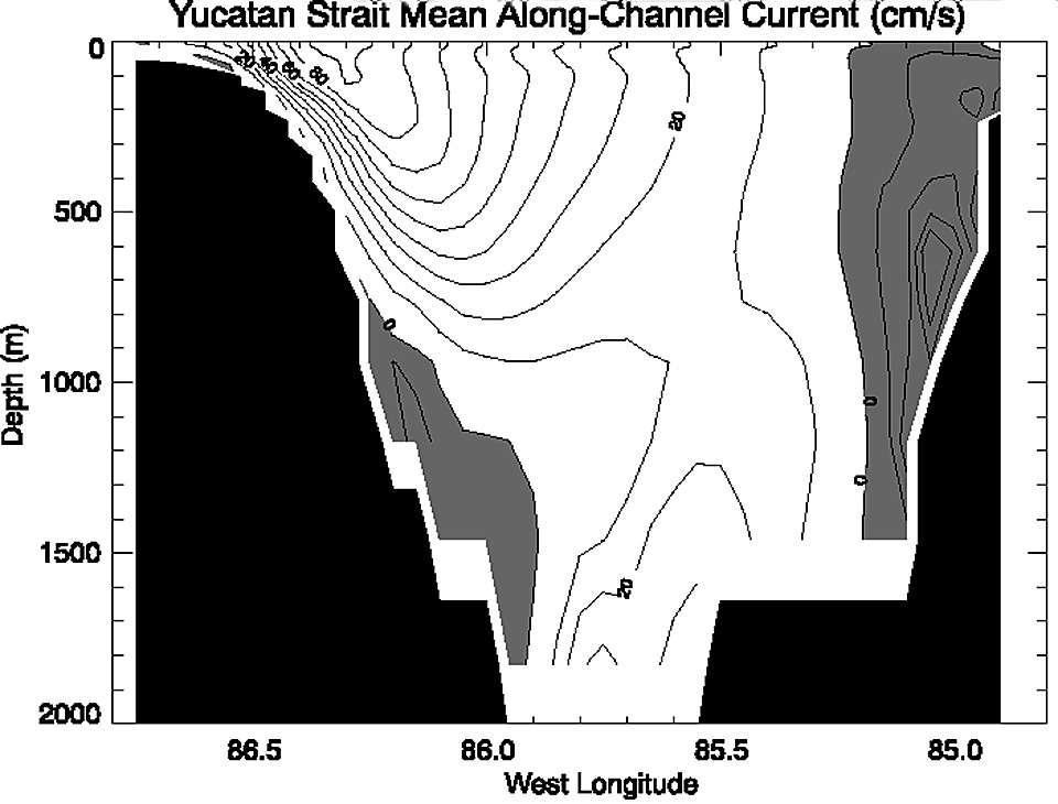 Export pathways for river discharged fresh water in the northern Gulf of Mexico . Versión pdf Steven L. Morey, Paul J. Martin, James J. O’Brien, Alan A. Wallcraft, and Jorge Zavala-Hidalgo http://www.atmosfera.unam.mx/jzavala/articulos/arbitrados/ART-ARB-12.pdf 1. Introduction [2] The circulation in the Gulf of Mexico (GoM) is dominated by the energetic Loop Current (LC) and its associated eddies. Large anticyclones, called Loop Current Eddies (LCEs), aperiodically pinch off from the LC at intervals from 3 to 17 months [Sturges and Leben, 2000] and drift generally westward, where they decay against the continental margin. Associated with the LC and the large anticyclones are a wealth of smaller cyclonic and anticyclonic eddies interacting in a seemingly chaotic manner [Zavala-Hidalgo et al., 2003a]. These features have vertical scales from several hundred to 1000 m and thus remain offshore of the continental shelf. La información de la deriva litoral que se retroalimenta de las energías de los tributarios y de las baterías convectivas que conforman los lagos Pontchartrain y Bourgne, sumadas a las aguas caldas encerradas en las aguas costaneras e interiores del Mississipi, Breton y Chandeleur Sonds, le resta toda calidad a este gráfico; que por el contrario acierta a mentar la consistente deriva litoral que bordea la costa al Oeste de la pata de gallo. Estudian las corrientes de los eddies en el golfo, pero dejan de lado toda la deriva litoral desde la península de la Florida hasta la pata de gallo. Toda esa región aparece con nula infomación Por el contrario, se dan a estudiar los interesantes procesos que suma la deriva litoral y la corriente oceánica alrededor de la península del Yucatán, que nada tiene que ver con los frutos de las dinámicas del Mississippi. The Mississippi River has an annual mean discharge of over 13,000 m3/s (as measured by the U. S. Geological Survey gauging station 7374000), with the neighboring Atchafalaya River contributing about half as much fresh water to the region as the Mississippi. This work suggests that there are ‘‘hot spots’’ for cross-shelf exchange in the northwest and north-. east corners of the Gulf, and south of the Louisiana/Texas (LATEX) Shelf. The structure of the Yucatan Channel flow in the model has similar characteristics to that reported by Sheinbaum et al. [2002]. The Yucatan current is confined to the upper 800 m with an undercurrent along the western continental slope and a weaker counter current along the Cuban coast with two cores, one in the upper 200 m and the other between 500 and 1000 m (Figure 3). Figure 3. Yucatan Strait along-channel component of the mean velocity (positive toward the Gulf of Mexico). Positive contours are drawn every 20 cm/s, and negative contours (shaded regions) are drawn every 5 cm/s. La delicadeza de la deriva litoral alrededor de la península de Yucatán es extraordinaria considerando la inmediata cercanía de la fosa oceánica. Esas riberas y esas derivas aparecen hoy y allí, como las más protegidas del planeta.