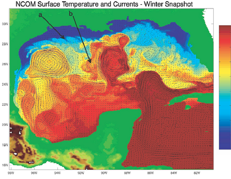 Figure 4. NCOM surface layer currents and temperature from an arbitrary output record during the winter season. Arrows point to examples of (‘‘a’’) filaments of cool water suggestive of frontal instabilities and (‘‘b’’) cyclonic frontal or ‘‘shingle’’ eddies surrounding an anticyclonic Loop Current Eddy.