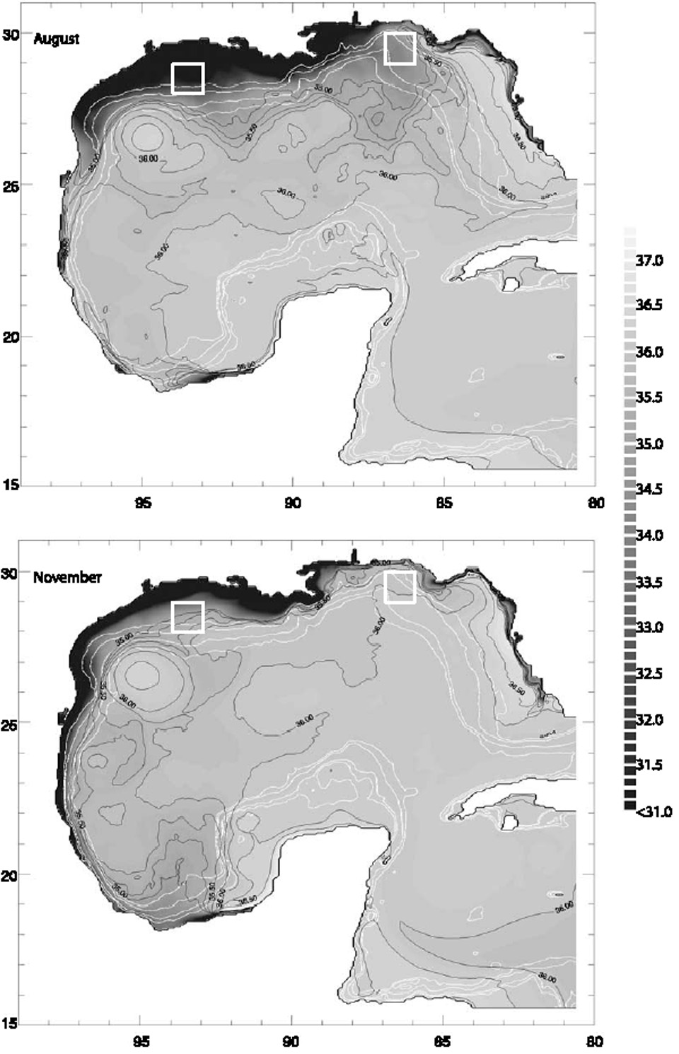 [26] Monthly climatology of the model surface salinity shows a similar east-west pattern on the shelf in the northern Gulf (Figure 7). The MAFLA shelf region is much more saline in the fall (and not shown, but also throughout the winter) than in the summer when the low-salinity water from near the Mississippi River discharge location spreads eastward. Over the LATEX shelf, the low-salinity water is trapped very close to the coast extending all along the western boundary in the fall (again, through winter), and retreats spreading out over the shelf in the summer. The annual signal of salinity is verified by the near-surface (10 m) salinity climatology from the 1998 World Ocean Atlas (WOA98) [Conkright et al., 1998] (Figure 8). Over the shelves, the model annual cycle of surface salinity agrees with the WOA98 values in the experiments with monthly varying river discharge, and with time constant river discharge. This indicates that the seasonal variability of river discharge is not the controlling mechanism for the annual cycle seen in the upper ocean salinity field in the northern GoM. Calculations with model data in the following sections will use data from the experiment with monthly varying river discharge.