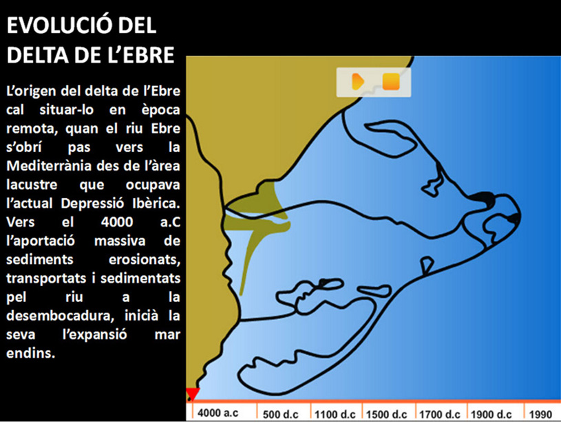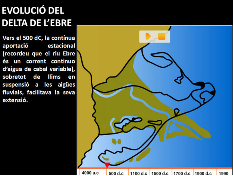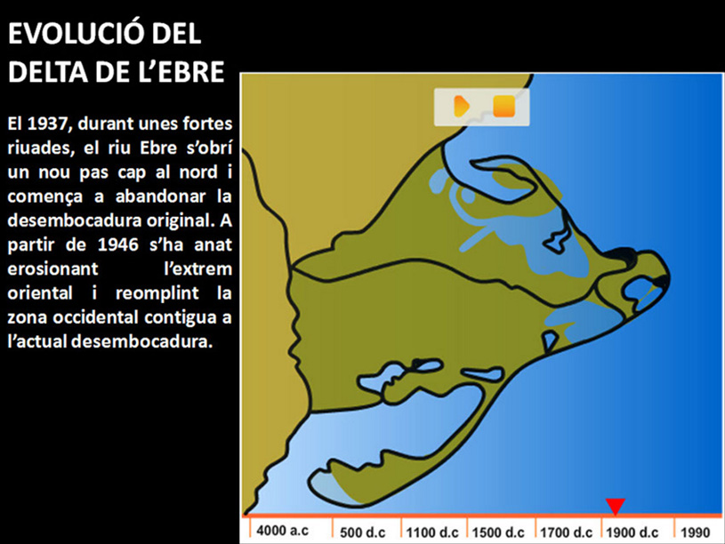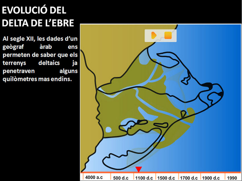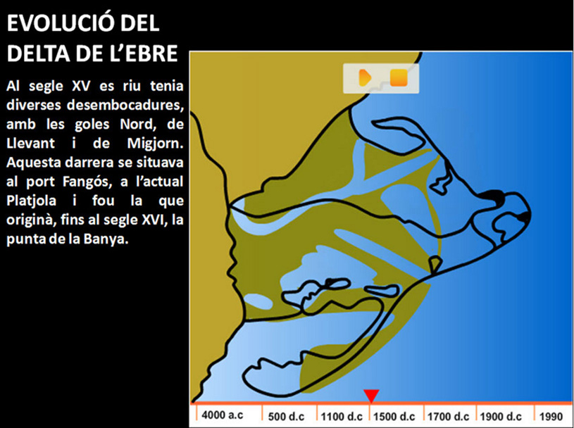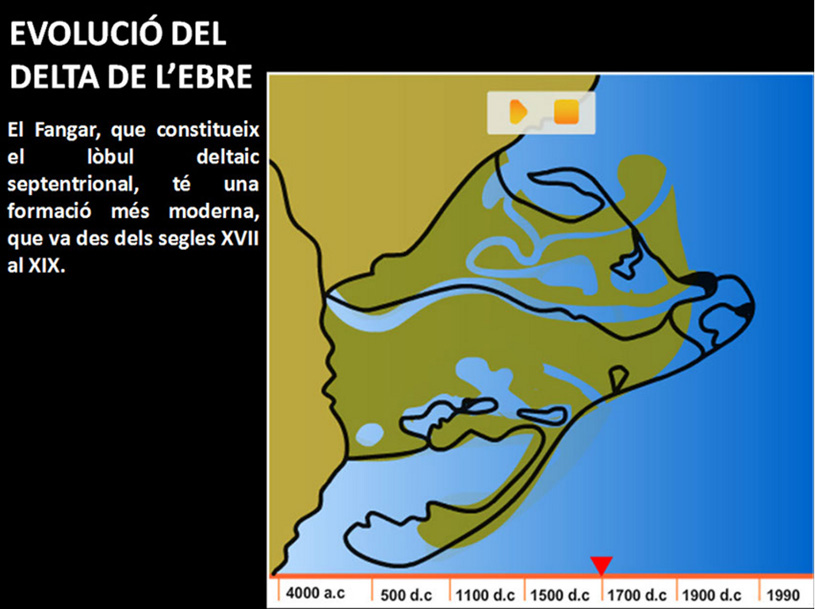 La evolución del lóbulo central del río El desarrollo del lóbulo sureste fue máximo en el siglo X, pero el cambio del curso fluvial que la alimentaba supuso su regresión y los mapas del siglo XV se puede observar totalmente erosionado. En cambio, el lóbulo noreste tiene su máximo desarrollo durante el siglo XVII. Este cambio en el curso del Ebro en dirección a la boca del Migjorn, propiciado seguramente por la acción humana, favoreció que este segundo lóbulo también entrara en regresión, comenzando a formarse entonces un lóbulo central. La isla de Buda es resultado de este desarrollo, que se produjo entre los años 1750 y 1850. Es pues, la última isla formada y, previsiblemente, ya no se formará ninguna más. Actualmente es el mar el protagonista principal de la erosión, transporte y sedimentación y su acción ha ido proporcionando un perfil redondeado en el frente del delta. La arena que se erosiona en las playas del Delta es transportada por las corrientes marinas y sedimentada nuevamente a las puntas del Fangar y del Cuerno, formando un sistema prácticamente cerrado.