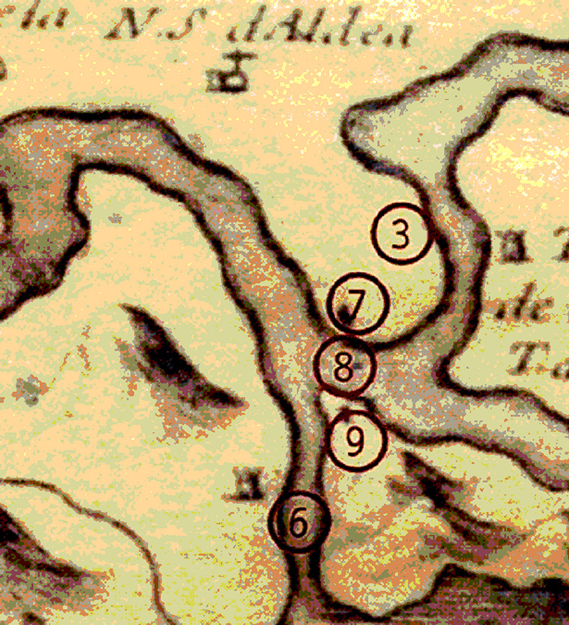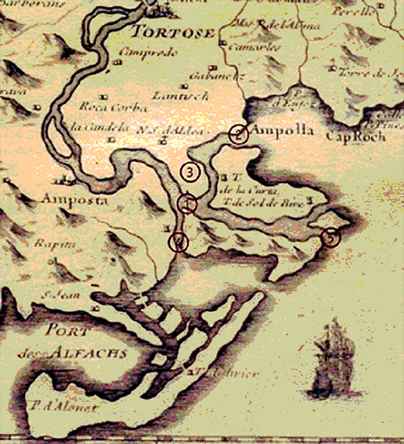 1) Lugar donde se ubica actualmente el Instituto y el Ayuntamiento de Deltebre (en medio del río) 2) Desembocadura del Goleró 3) El Pregón 4) Cava o canal artificial que con el tiempo se convertiría en el curso principal y único del Ebro 5) Desembocadura de la Marquesa
