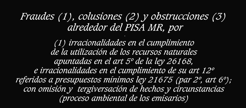 Fraudes, colusiones y obstrucciones Fraudes (1), colusiones (2) y obstrucciones (3) están presentes en el PISA MR, por (1) irracionalidades en el cumplimiento de la utilización racional de los recursos naturales apuntadas en el art 5º de la ley 26168, e irracionalidades en el cumplimiento del art 12º referido a presupuestos mínimos ley 25675 (ver par2º, art 6º); sumadas a omisión y tergiversación de hechos y circunstancias (proceso ambiental de los emisarios), que los llevaron a engañarse y a engañar para obtener beneficios financieros, evadiendo obligaciones, (2) gestionando acuerdos para alcanzar propósitos inadecuados, cuando no ruinosos, (3) alterando, ocultando y errando evidencias significativas y demorando 15 años reglamentaciones no menos significativas, tal el caso de la ley 25688 sobre presupuestos mínimos en el Régimen ambiental de aguas, cuyos planteos acercarían abundante materia crítica para poner sobre la mesa todos estos desaciertos,
