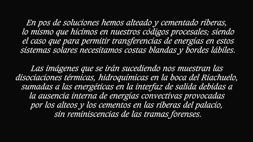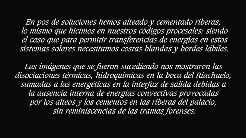 Respecto a la rigidez de los códigos procesales enfrentando la confusión, cuando no la ignorancia de las ecologías de ecosistemas hídricos en planicies extremas y sus trascendencias ambientales ¿De qué sirve tener las riberas de las adjetivaciones procesales cementadas, si para hospedar la energía de estas novedades respecto de esa sustancia vital que llamamos agua y sus complejidades, necesitamos costas blandas y bordes lábiles? Las consecuencias de no advertir que desde Da Vinci a la fecha algo ha cambiado y poco o nada amables resultan los criterios cartesianos dando soporte en planicies a física matemática newtoniana en modelos mecánicos de caja negra para eternizar ruinas ambientales, que después de una década estas tramas forenses adviertena las costas procesales de esta causa Mendoza cementadas y sus eficiencias inamovibles, … desoladoras, ... paupérrimas, … lamentables. He mirado por los cursos de aguas de planicies por 21 años y cultivado esa mirada a ellos desde termodinámica de sistemas naturales abiertos y enlazados ya por 14 años. No menos de 15.000 horas he aplicado a su estudio y expresión. El por qué está contenido en esta pregunta: ¿hay acaso alguna forma de trascender la existencia, sin insistencia, consistencia y persistencia servicial? Francisco Javier de Amorrortu, 22 de Febrero del 2018