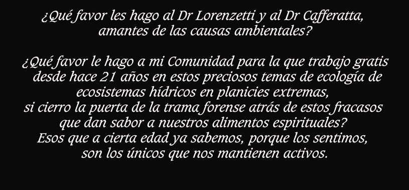 No hablamos en estas causas de materias ambientales, pues éstas solo se reconocen atendibles una vez que se resuelve la 1ª cuestión: devolver equilibrio a las dinámicas de los sistemas ecológicos (primer enunciado del par 2º, art 6º, ley 25675). Devolver ánimos al buey muerto. En estas dos causas -CAF 21455 y CAF 30739 se advertirán los motivos elementales por los que venimos fracasando y la insistencia por la que vengo trabajando sin esperar nada a cambio que no fuera solicitar atención a estas elementales advertencias, que nadie hace y nadie precia.