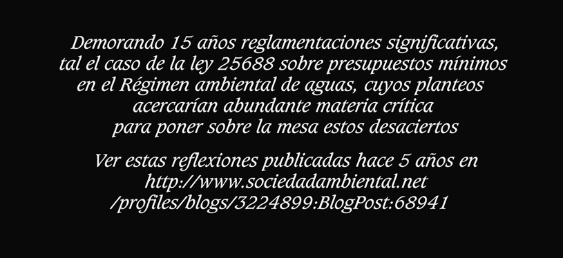 Ver estas reflexiones publicadas hace 5 años http://www.sociedadambiental.net/profiles/blogs/3224899:BlogPost:68941 Sin olvidar al Código Penal Federal de la República de Méjico que con carácter supra constitucional nos tipifica en su art 420 bis la destrucción de humedales, al cual precisamente en la causa CAF 21455 referimos para los crímenes hidrológicos que en el segundo humedal más grande de la Argentina, en el estuario del Plata, se disponen a encarar. Este panorama introductorio nos hace lugar a las siguientes reflexiones: ¿Acaso nos hemos preguntado alguna vez, amén de otros errores graves, qué presupuesto mínimo se hubieran devorado en la ley 26168, en el PISA y en el fallo que por años dieran lugar a cuestionarios frustrados y frustrantes, a nuestros propios fraudes, colusiones y obstrucciones, a interminables fracasos? ¿Hay acaso otra solución a estos dilemas que anteponer hoy politólogos amables que calmen los ánimos? ¿Resolveremos estas situaciones con multas … o con un repaso de enfoques cognitivos elementales, que descubran cómo desde nuestras ignorancias específicas y desde nuestros antropocentrismos violamos esos presupuestos mínimos elementales? ¿Acaso por hacernos preguntas tan obvias y directas, eludiremos respuesta, que al advertir mayor colusión no aumenten la sorpresa? Mejor desear una respuesta sincera y efectiva, que aunque tumbe unas cuantas piezas procesales nos deje más dispuestos a reflexionar en lo que nunca hemos hecho foco primordial. Para ello no se necesitan audiencias. Tal vez sean más propicios estos confesionarios en formato audiovisual. ¿Cómo olvidar el balance de lo ya expresado en la última audiencia? http://www.alestuariodelplata.com.ar/boca14.html http://www.alestuariodelplata.com.ar/boca18.html http://www.alestuariodelplata.com.ar/boca20.html http://www.alestuariodelplata.com.ar/boca21.html ¿Cómo ignorar o borrar lo confesado en febrero del 2012 por el ACUMAR reconociendo no saber cómo identificar el pasivo del PISA MR tras haber gastado en el 2011 un 80% más que lo aplicado al presupuesto del Poder Judicial de la Nación de ese mismo año: 7200 versus 4088 millones? Superaron con creces a San Agustín. Tras semejante confesión, ¿qué más cabe pedir? ¿Qué respeten lexicografías? ¿Qué den noticias del camino de sirga? ¿Por qué no empezar a preguntar por los fraudes, colusiones y obstrucciones, por cuántas leyes se han violado y se siguen violando, incluidas de presupuestos mínimos, en cuántas han errado o ignorado, antes de pedir balances de cuestiones humanitarias importantísimas, pero irremediablemente secundarias?
