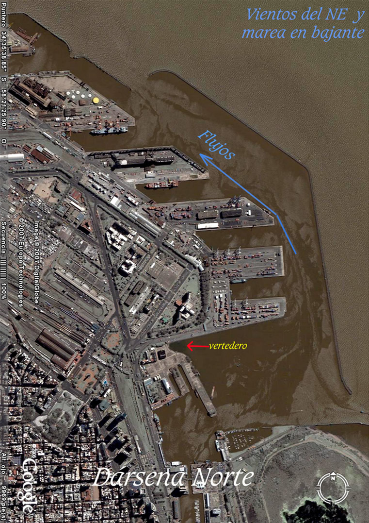 Esta imagen muestra lo que no debemos hacer para impedir el proceso convectivo interno que alimentan estas hidrotermias; las únicas que asisten las salidas de flujos en las inmediaciones de las capas límite, hidrodinámica y térmica. Esa curva cerrada entorpece la hasta allí fluyente energía; y en su faz superficial la vemos por un momento ligeramente comprometida con el viento NE. No obstante quedar encerrados esas polucionadas aguas, los flujos reasumen sus destinos convectivos internos. De esta imagen se puede sacar provecho para el diseño de la nueva salida. En particular, evitando esa curva en el muelle que hace las veces de ribera y altera también el rumbo de los flujos convectivos internos. Es interesante observar las ondas curvadas del oleaje indicando la resultante victoriosa de estos flujos convectivos internos.