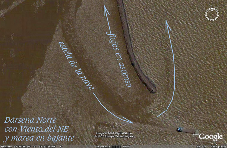 Ya hemos alcanzado en esta imagen la salida de Dársena Norte, para ver cómo la pluma que viene del Sur se mete decididamente en ella. La imagen que sigue señala vientos del NE y marea en bajante, al tiempo que muestra la estela dejada por una nave que acaba de salir del puerto. La pluma se descompone para volver a subir; tal como lo hacen las compactas plumas interiores que muestra la imagen que sigue a ésta.