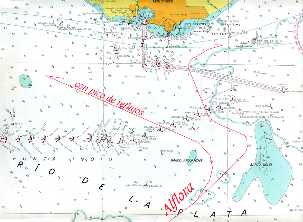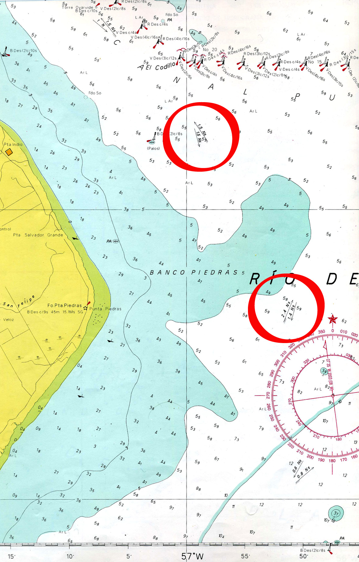 . . . . . . . . . . .. 11 . Carta S.H.N. del área de Punta Piedras y vectores de flujos en los círculos rojos. . . . . . . . .. . . . . . . . . . .. . . . . . . . . LLa forma del banco Piedras prueba las resoluciones vectoriales enfrentadas.
