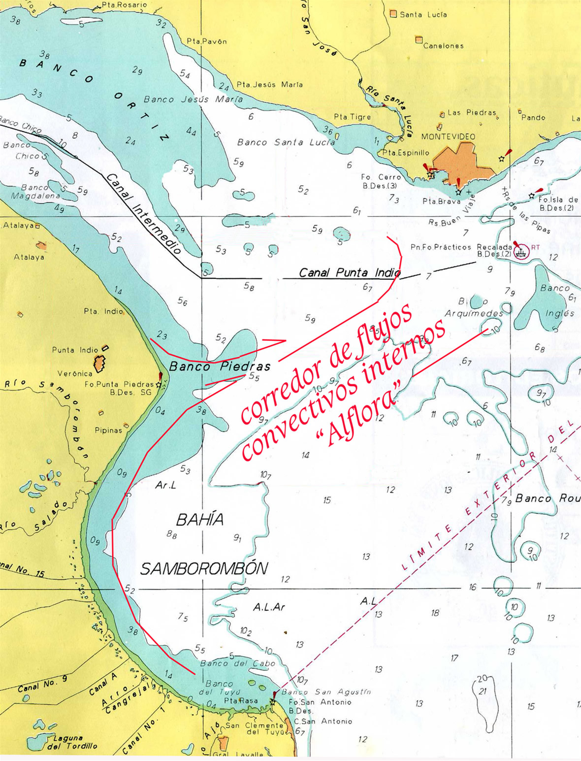 . índice . Prefacio . Preface . . aguas . 1 . 2 . 3 . 4 . 5 . 6 . . contamina 1 . 2 . 3 . 4 . 5 . 6 . . holocausto 1 . 2 . 3 . 4 . 5 . 6 . 7 . 8 . 9 . 10 . 11 . 12 . 13 . . lineas 1 . 2 . 3 . 4 . . hidrotermias 1 . 2 . 3 . 4 . 5 . 6 . . nuevas 1 . 2 . 3 . . Reconquista 1 . 2 . . hidrogeo 1 . 2 . 3 . 4 . 5 . 6 . . esbozos 1 . 2 . 3 . 4 . 5 . 6 . 7 . 8 . . corredorcentral 1 . 2 . 3 . 4 . 5 . . cordones 1 . 2 . 3 . 4 . 5 . . epiola 1 . 2 . 3 . 4 . 5 . 6 . . deriva 1 . 2 . 3 . 4 . 5 . 6 . 7 . 8 . 9 . 10 . 11 . 12 . 13 . 14 . . archivo 1 . 2 . 3 . 4 . . Halcrow 1 . 2 . 3 . 4 . 5 . 6 . . frentehalino 1 . 2 . 3 . 4 . 5 . 6 . 7 . . emicampanaoculto 1 . 2 . 3 . 4 . 5 . 6 . 7 . . Costa del Plata 0 . 1 . 2 . 3 . 4 . 5 . 6 . . Costa del oro 1 . 2 . . IRSA 1 . 2 . 3 . 4 . . flujos . . segmentos . . pendientes 1 . 2 . 3 . 4 . 5 . 6 . . delta 1 . 2 . 3 . 4 . 5 . . propuesta . 1 . 2 . . correconvectivo 1 . 2 . 3 . 4 . 5 . 6 . . plataforma 1 . 2 . . termodinamica 1 . 2 . 3 . . ABL 1 . 2 . . congreso . . girh . . Acumar 1 . 2 . 3 . 4 . . evaluacion 1 . 2 . . BocaRiachuelo 1 . 2 . 3 . 4 . 5 . 6 . 7 . 8 . 9 . 10 . 11 . 12 . 13 . 14 . 15 . 16 . 17 . 18 . 19 . 20 . . StoDomingo . . urgenciasatadas 1 . 2 . . inundabaires 1 . 2 . 3 . 4 . . sinsustento 1 . 2 . . emisarios 1 . 2 . 3 . 4 . 5 . 6 . 7 . 8 . 9 . 10 . . UAG 1 . 2 . 3 . . áreas nuevas 1 . 2 . 3 . . acreencias 1 . 2 . 3 . 4 . 5 . . audiencia 1 . 2 . 3 . 4 . 5 . 6 . 7 . 8 . 9 . . Valls 1 . 2 . . contrastes 1 . 2 . 3 . 4 . 5 . 6 . 7 . 8 . 9 . 10 . . convexterna . . playas 1 . 2 . 3 . 4 . 5 . 6 . 7 . 8 . 9 . . Plan Maestro 1 . 2 . 3 . . Parque Norte . 1 . 2 . . ribera . 1 . 2 . 3 . 4 . 5 . . jurisdiccion 1 . 2 . 3 . 4 . 5 . 6 . 7 . 8 . 9 . 10 . 11 . 12 . . CSJNpisamr 1 . 2 . 3 . 4 . . zonas muertas . . Bermejo 1 . 2 . . Pilcomayo . . Samborombon . . Salado . . Uruguay 1 . 2 . . Parana . . Mar del Plata 1 . 2 . 3 . 4 . 5 . . PuntaRasa 1 . 2 . . PuntaMedanos . . Mar Chiquita . . Necochea . . Areco 1 . 2 . . Colonia . . MartinGarcia 1 . 2 . 3 . . Puertos 1 . 2 . . formula1 . . disocio . . senderos . . bajante . . . . oceano 1 . 2 . . hidrolinea 1 . 2 . 3 . . sustentable. 1 . 2 . . agua 1 . 2 . 3 . . antarticflows . . derrame . . luna 1 . 2 . 3 . 4 . 5 . 6 . . index . "Alflora" Con esta voz nombro . . al corredor convectivo interno que apura dinámica al frente halino La alegría de descubrir este corredor convectivo interno en áreas del frente halino, encendiéndose cada día a partir de las energías que acumula en la bahía de Samborombón; y que hasta alcanzar el pico de los reflujos barre las costas al Oeste de Montevideo; para luego, entrado en pérdida, barrer las del Este, me mueve a bautizar este corredor con el nombre de "Alflora", en agradecimiento a mi Querida Musa. Ver imágenes 6, 7, 8, 9 y 10. Las tres imágenes que siguen en primer término, hablan de flujos en descenso. La primera de ellas comenzando a superar la capa límite térmica e hidroquímica que descubre el frente halino. La segunda ya muestra superado ese escollo. Y la tercera nos regala, también con flujos en descenso, un extraño corredor de flujos completamente disociado para el que no alcanzamos explicación; aunque alguna sospecha se nos instala de que pudiera corresponder a una bajante feroz con fuerte viento del Oeste arrastrando una gran carga sedimentaria; pues también en Punta Médanos se regala ese desplazamiento sedimentario inusual. La cuarta imagen nos acerca el inicio de flujos en descenso, en áreas del estuario interior. La quinta refiere del inicio de reflujos en el frente halino. La sexta y la séptima, del pico de los reflujos. La octava y novena del fin de los reflujos en el frente halino. La décima, del inicio de los reflujos en el frente halino. Esta última es igual a la quinta imagen. La undécima imagen acerca una carta del S.H.N. sobre el área de Punta Piedras y vectores de flujos al Norte y Sur de la misma. El perfil del banco Piedras muestra la resolución sedimentaria que da testimonio de vectores encontrados. El círculo rojo inferior apunta la enorme diferencia en velocidad que muestra este corredor convectivo interno al arrancar el devorador cruce a 90° dejando atrás la bahía. Las cartografías que siguen muestran las batimetrías de Sanborombón y las de la zona del banco Inglés. Gracias Querida Alflora Francisco Javier de Amorrortu, 17 de Agosto del 2009