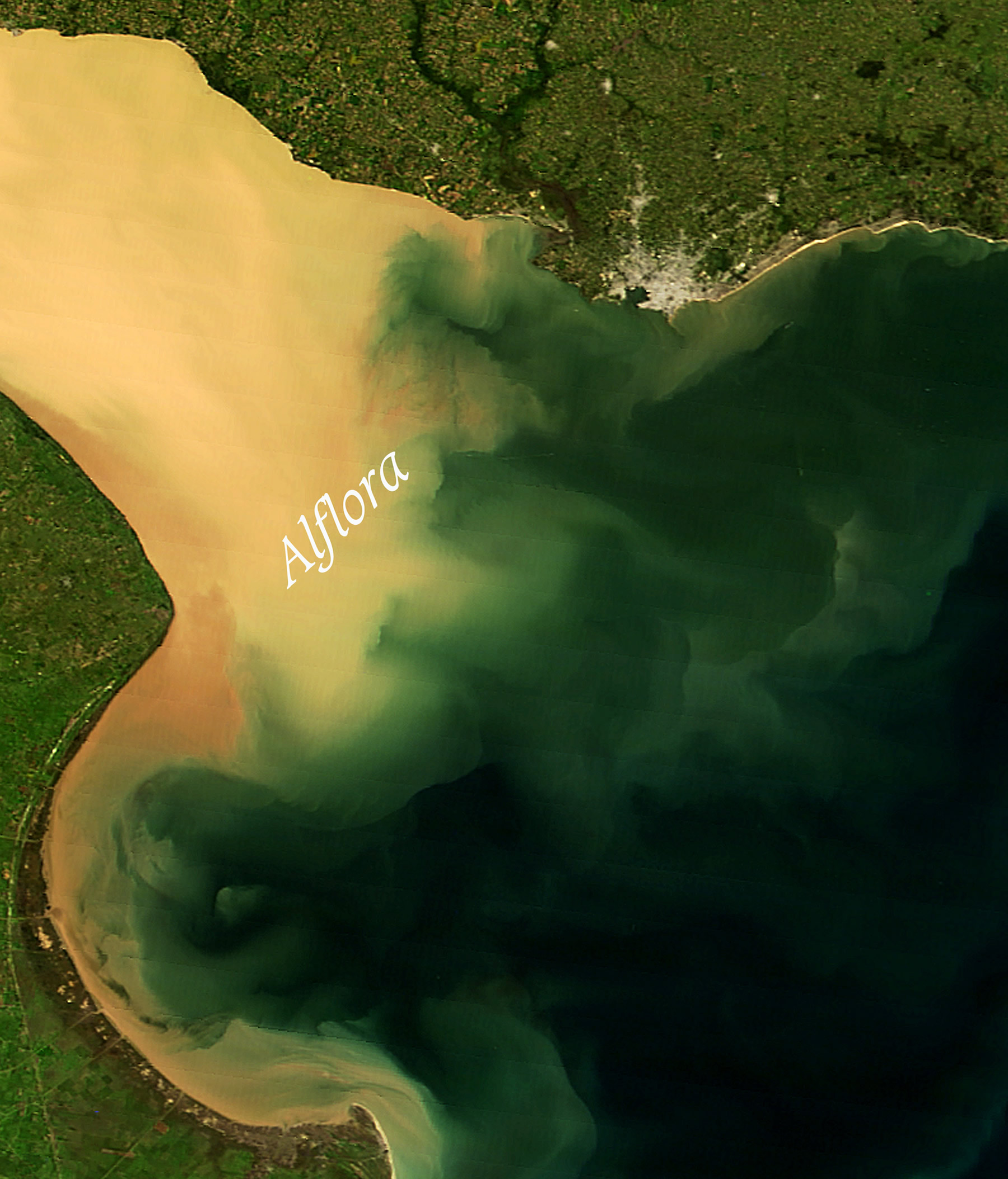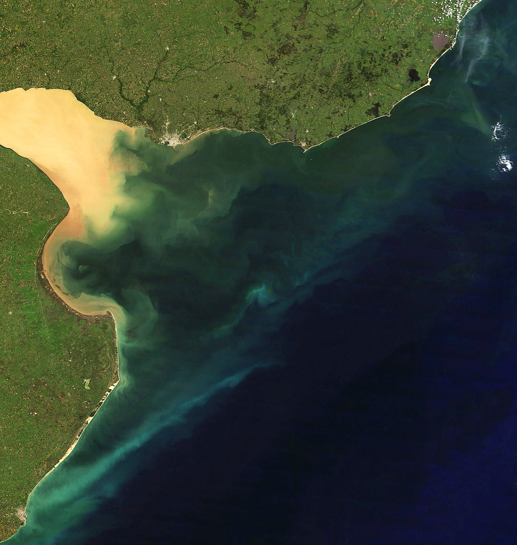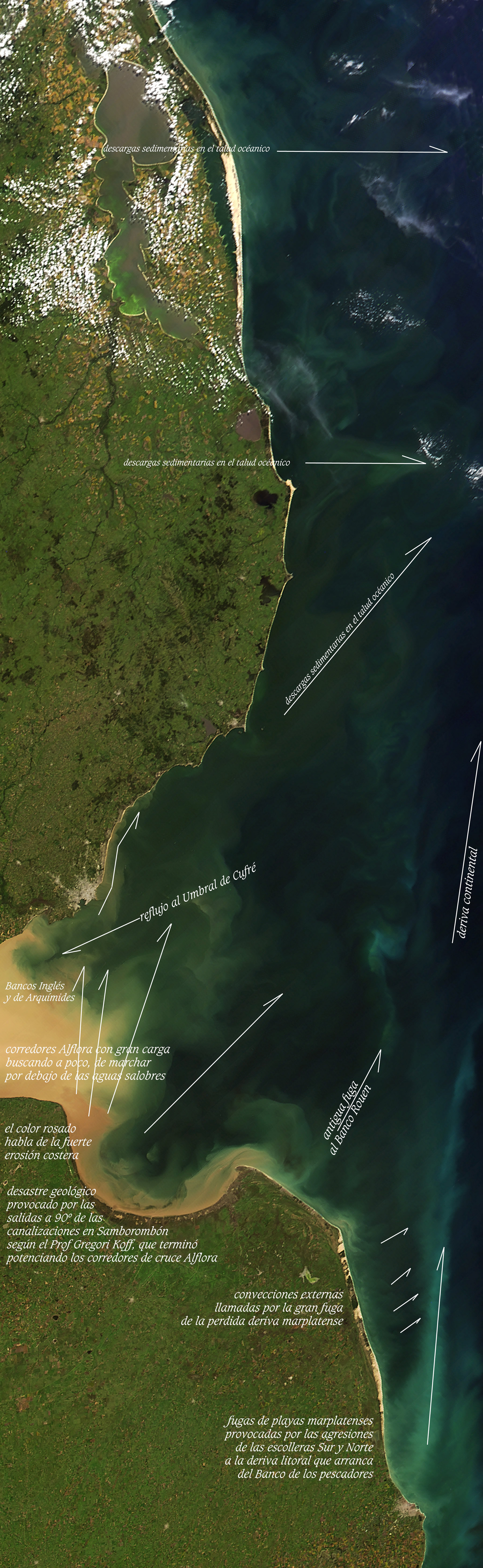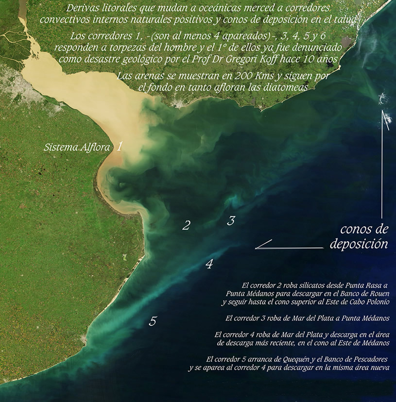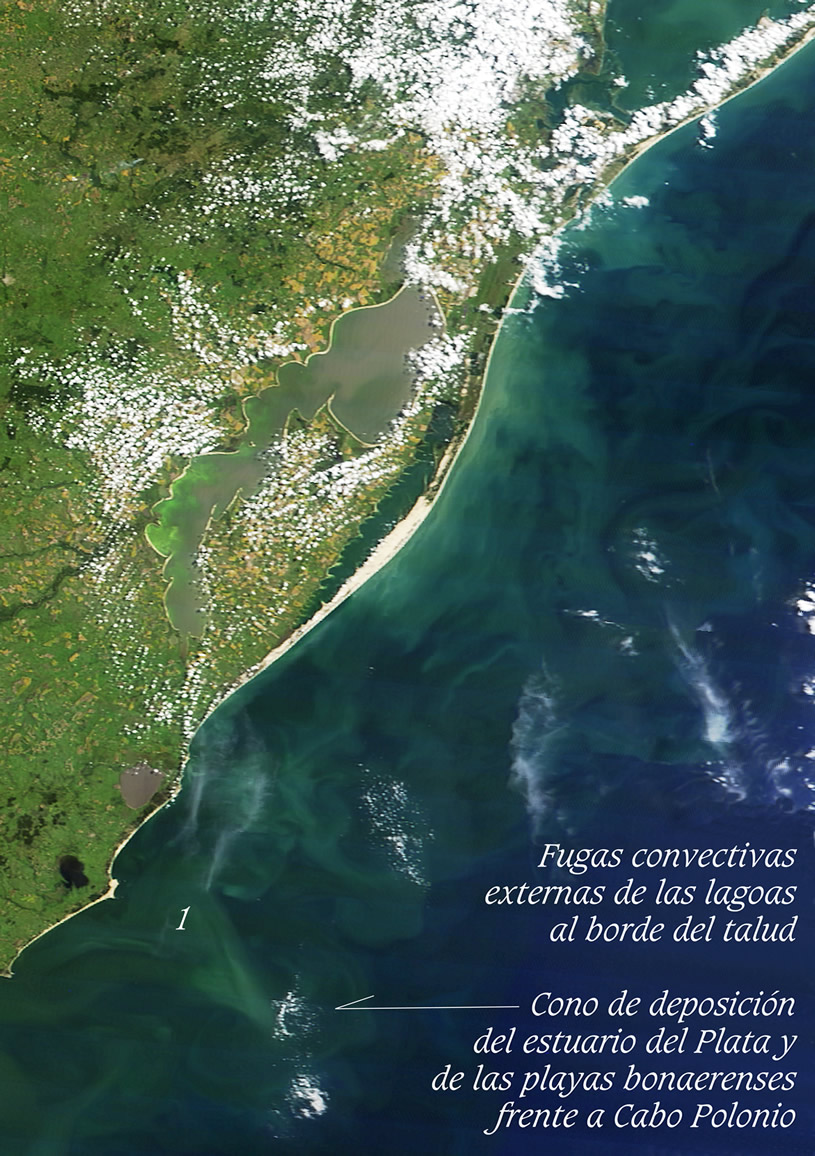 Erosiones al NO y SO de Punta Indio. Corredores convectivos dulces en el frente halino, en la ribera continental y sus deposiciones en conos en el talud oceánico. Fugas de Mar del Plata. On March 31, 2012, the Moderate Resolution Imaging Spectrometer (MODIS) on the Terra satellite captured this view of muddy water from the Paranà River flowing into the Río de La Plata. The image offers a glimpse of the complicated mixing processes that occur at the interface of the muddy fresh water from the Paranà and the ocean water of the South Atlantic in an area known as a turbidity front. The location of the turbidity front varies over the course of the year. It tends to be in its western most position during the summer when river discharge is at a minimum and the predominant winds are from the northeast, while it reaches its easternmost position in the spring when strong winds from the southwest are present. Los corredores de flujos convectivos naturales positivos reconocen variadas formas de recarga de energía; ya sea por meandros dinámicos, esteros aledaños, aguas someras de bañados transferidas por costas blandas y bordes lábiles, por dar ejemplo; como por la energía del sol que capturan y envuelve a los sedimentos. Por ello, estos grandes corredores, aún en mar abierto, son capaces de sostener la "personalidad" de sus extendidas disociaciones, reteniendo en su carga sedimentaria la fuente de energía que opera como portátil batería convectiva propia. Vistas de los conos de sedimentación en el talud oceánico
