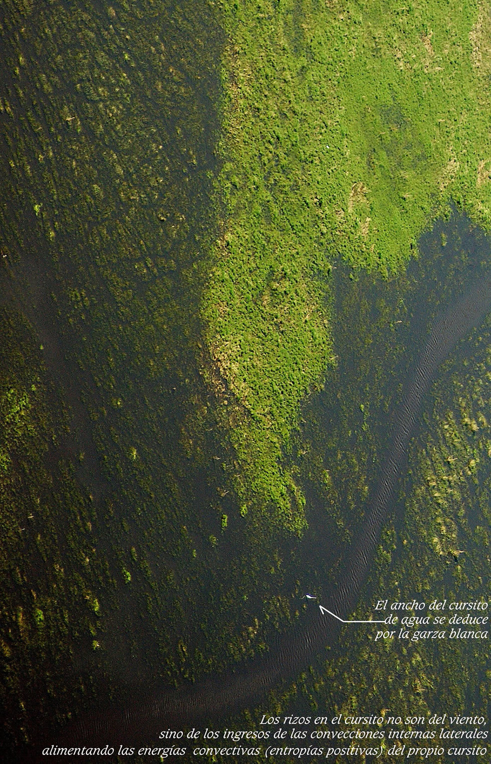 Las propiedades de cohesividad que mantienen las moléculas de agua unidas reconocen aprecio a los puentes de hidrógeno; descubriendo estos su sensibilidad al calor y a la polaridad. Las rupturas o disociaciones de estos puentes debidas a diferencias de temperatura dan lugar a referir de gradientes térmicos y de capa límite térmica. La polaridad de la molécula que se les arrime dando lugar a disociaciones mueve a referir de una capa límite hidroquímica La importancia de los gradientes térmicos que mueven a enlaces y desenlaces en estos puentes tan sutiles, es tan valiosa como paupérrima la generalidad de la segunda ley de la termodinámica en su consideración. No he referido a la adhesividad, tensión superficial y capa límite hidrodinámica; factores que en aguas someras caben incluso imaginar haciendo aportes a la transmisión de energías. Los ríos tropicales más pequeños no tienen una corriente de agua, ni una composición tan uniforme como los grandes ríos, que tienden a ser de aguas blancas. Las aguas con altas cargas sedimentarias capturan más energía solar y así alimentan sus ricos y complejos procesos convectivos. En este autor como en todos los demás, la ausencia de mirada desde termodinámica de sistemas naturales olárquicos abiertos, es en todos los casos, completa. Sólo miran desde mecanicismos y modelan cual si todo fluir fuera el mentado laminar. Sin siquiera abrir los ojos a la realidad más elemental: no hay pendiente que logre traducirse en energía gravitacional. Sus modelos matemáticos sobrepasando con extrapolaciones extravagantes los límites naturales y experienciales que nunca parecen descubrir en su interior las cajas negras, les han permitido extender por siglos su paralizadora fantasía. Esa que nunca querrá despertar a la realidad de los millones de sarcófagos "hidráulicos" que han obrado mirando por los extremos de cajas negras, sin intimar con su sustancia; para desde esta inconciencia no cesar de destruir todos los recursos naturales que han tocado y siguen tocando. Los planos de llanura nunca descendieron los ríos al mar. Esa tarea fue siempre solar, merced a la riqueza de interminables enlaces termodinámicos de baterías convectivas alimentadas por infinitud de atrapantes sensores; desde los sedimentos impalpables hasta las vegetaciones que asoman sobre las aguas someras en las planicies de inundación. Estos delicados procesos no dejan huellas de sangrías; pero la eficiencia que muestra la imagen no deja de sorprender. Y no es la pendiente la que traduce esa organización del tejido convectivo; y su advección, guiada por gradiente térmico, tampoco lo es por pendiente. Si ya la escala de este micromundo se muestra tan generosa para sorprendernos, qué cohesividad tienen nuestras neuronas que nos mantienen atrapados traduciendo sólo extrapolaciones de energía gravitacional en cajas negras incontroladas en intimidad sustancial.