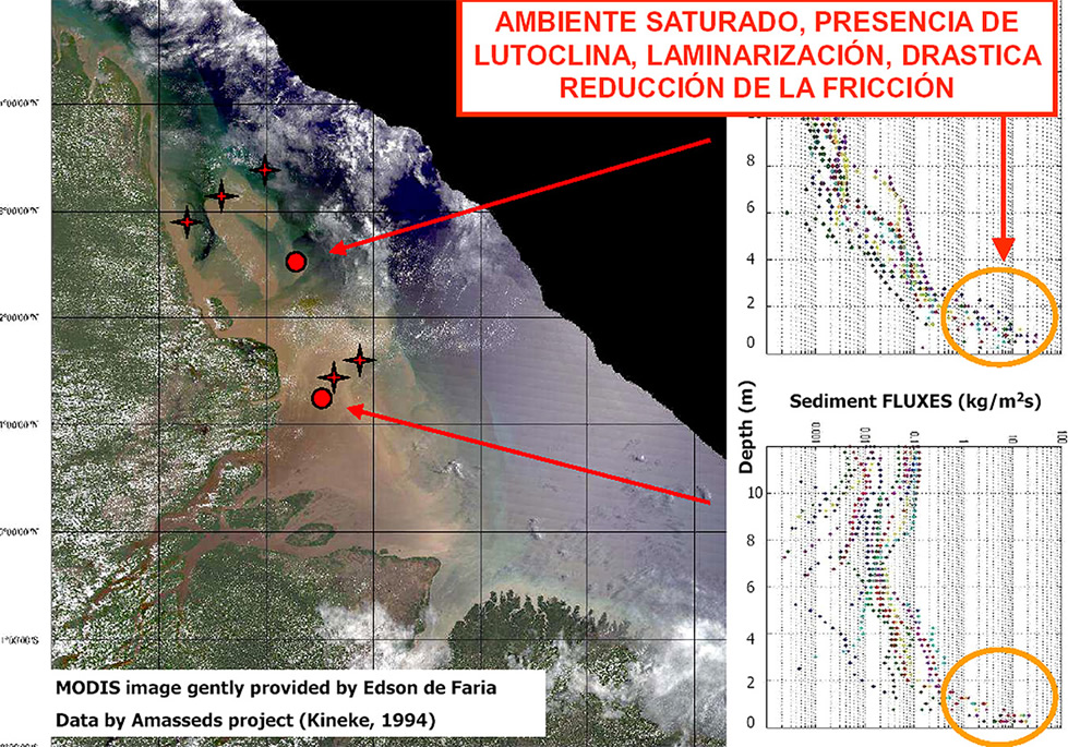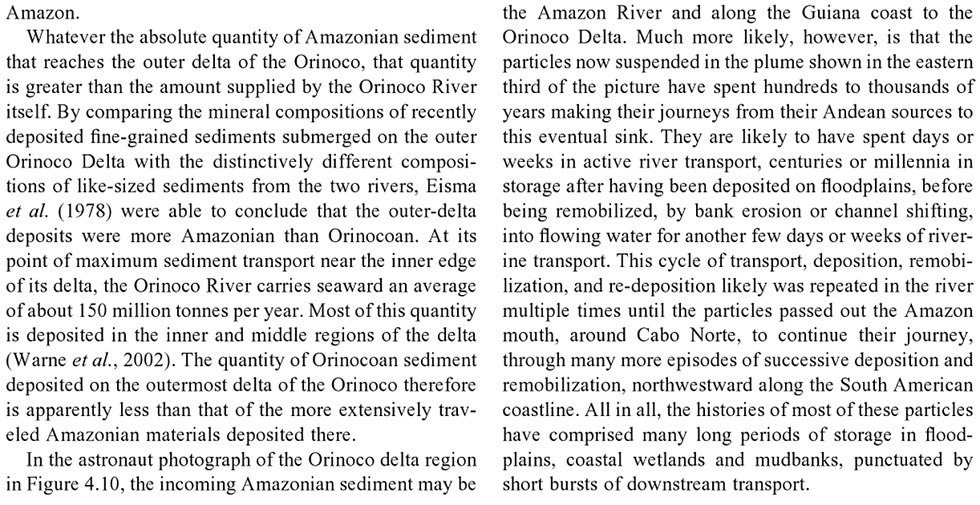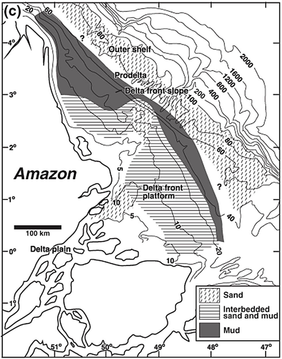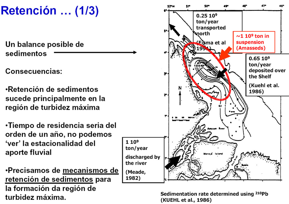 El balance de sedimentos también aparece con importantes dudas. En especial, el que acompaña el largo trayecto oceánico que hacen las aguas del Amazonas. Ver imagen que sigue a esta refiriendo de traslados de 420 y 650 Kms hasta el talud continental, cuyas huellas no sabemos qué antigüedad tienen, pero allí están probando el camino que conocieron ambas bocas.