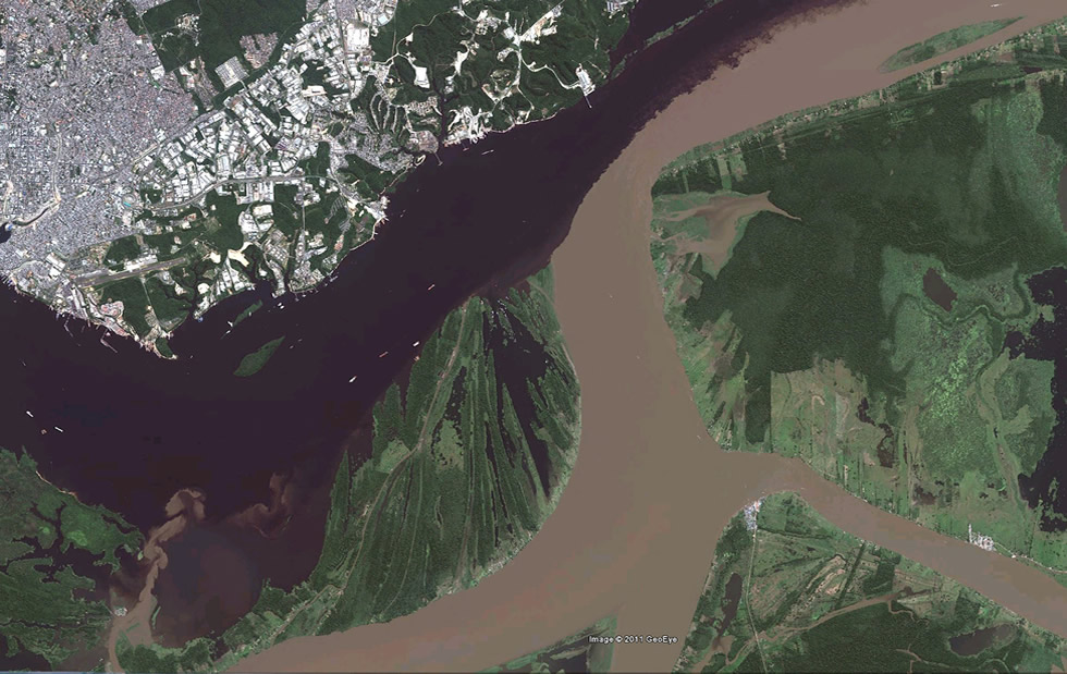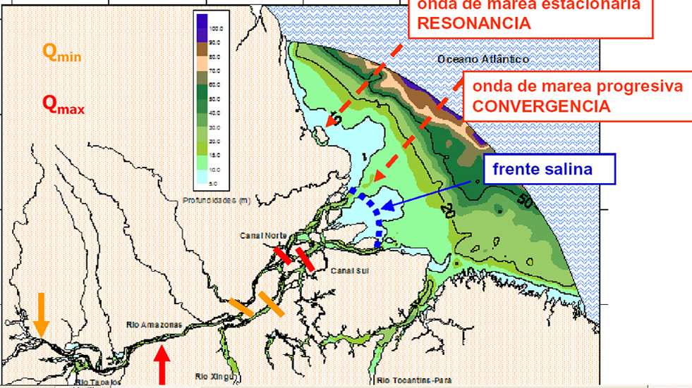 Tidal influence extends nearly 1000 Kms upstream into the estuary, due to the low river gradient, but this doesn't impede to express its extraordinaries outflows records. The main reason comes from the 885 Cal by cm2 that enters in convective batteries at Manaos.